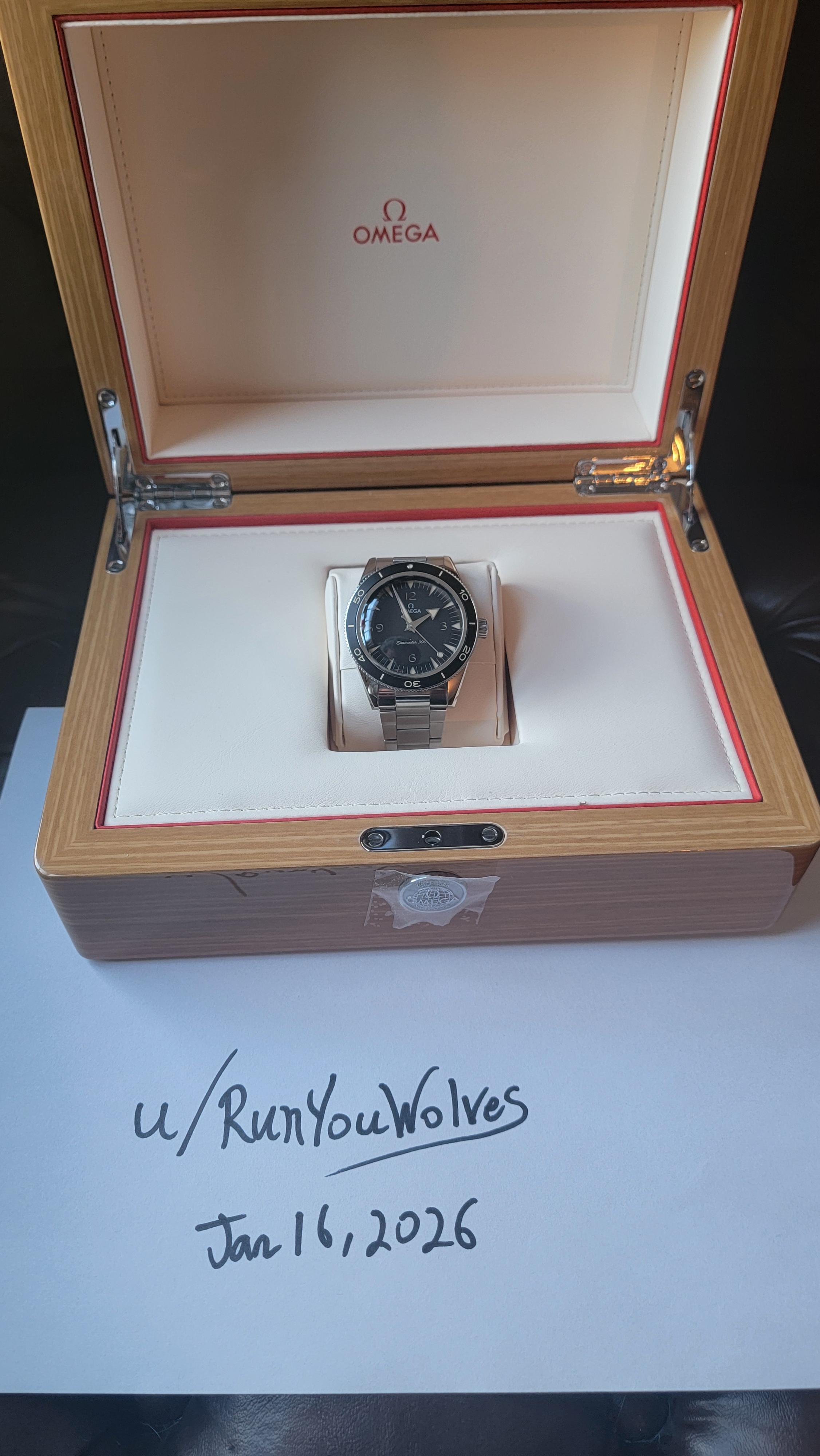 **Timestamp:** [**https://imgur.com/a/FByE0yo**](https://imgur.com/a/FByE0yo) **Photos:** [*https://imgur.com/gallery/omega-seamaster-300-kLtMKgU*](https://imgur.com/gallery/omega-seamaster-300-kLtMKgU) **What’s included:** Full set — inner box, outer box, cards/papers, bracelet with all links. **Condition:** Excellent overall condition. The watch has been worn and cared for, with one **small scuff on the side of the case** (clearly shown in photos). No other notable marks on the case, bezel, crystal, or bracelet. Runs perfectly and keeps excellent time. **Specs & details:** * 41 mm stainless steel case * Black “sandwich” dial with vintage-tone lume * Lollipop seconds hand * Ceramic bezel * Sapphire crystal (front and back) * **Omega Co-Axial Master Chronometer Cal. 8912** * METAS certified * 15,000-gauss magnetic resistance * 60-hour power reserve * 300 m water resistance * Stainless steel bracelet with push-button clasp This is the modern Seamaster 300 Heritage — *not* the Diver 300M — and wears beautifully with a slimmer, more classic profile. **Reason for sale:** Collection shake-up. Fantastic watch, just not getting enough wrist time. **Price & terms:** **$4,650 shipped** within the continental US. Price includes insured USPS Priority shipping with signature confirmation. Payment via PayPal. No trades. Comment here before PM. I’ll ship within one business day of cleared payment and provide tracking promptly. Happy to answer questions or provide additional photos if needed. Thanks for looking!