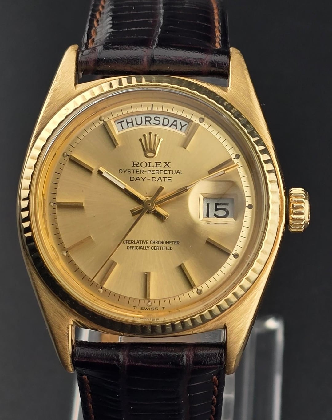 | Vintage Rolex Day Date 1803 36mm 18k Yellow Gold Silver Dial Leather Strap qdwatches (2061) |