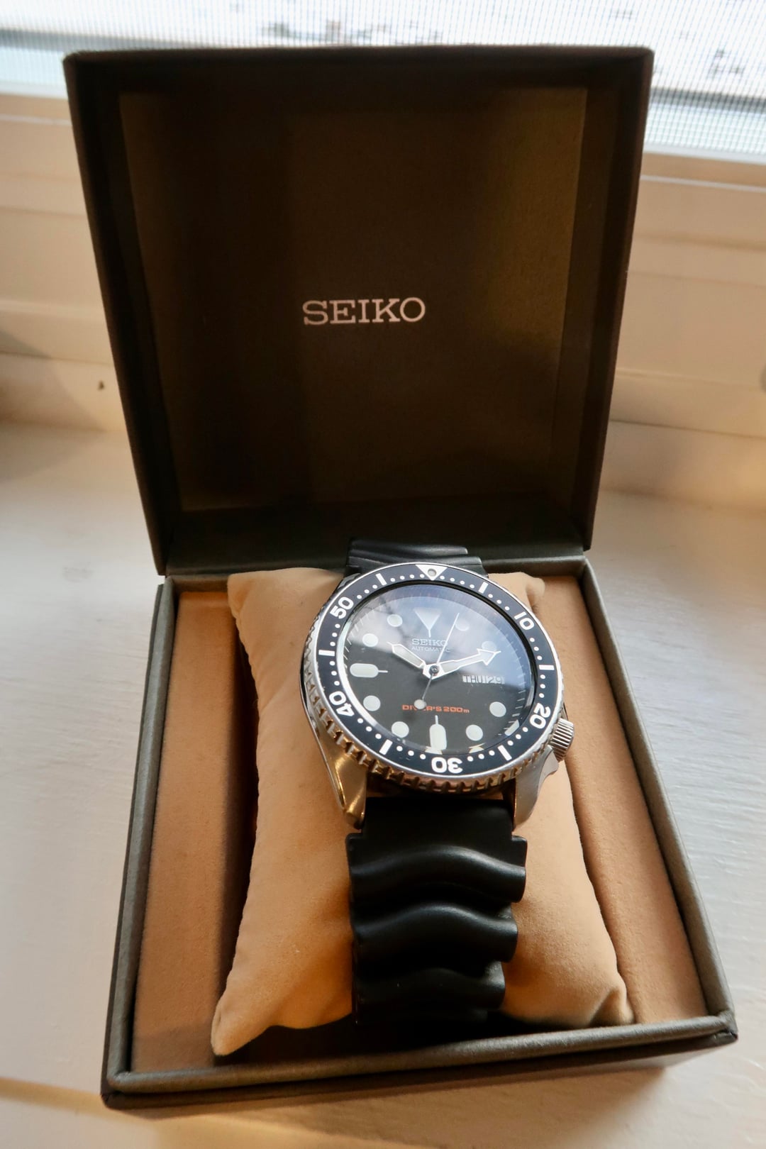 Selling my Seiko SKX007, which comes on the correct curve-vent z22 strap, and in a generic Seiko box. Watch runs well (~+15s/d, ymmv), all functions work, great smooth bezel action with solid 120 clicks, several thumb-rolls to secure the crown, 7s26 with English/Spanish day wheel. Normal wear consistent with age - see pics and please ask any questions before committing to buy. $265 includes shipping within the US. International at added cost to buyer. Zelle preferred; buyer covers any payment fees.