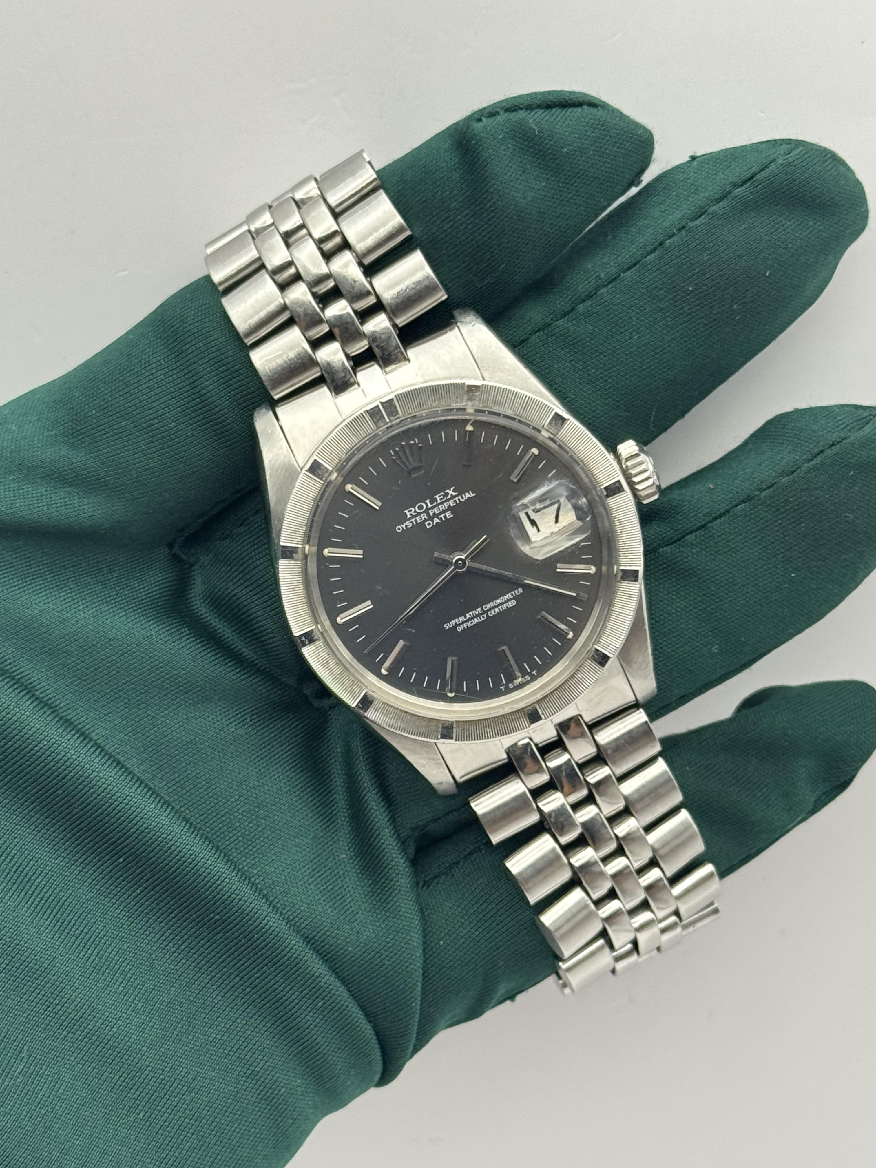 | Mens Rolex Date Stainless Steel Watch Engine-Turned Index Bezel Silver Dial 1501 beckertime (23974) |