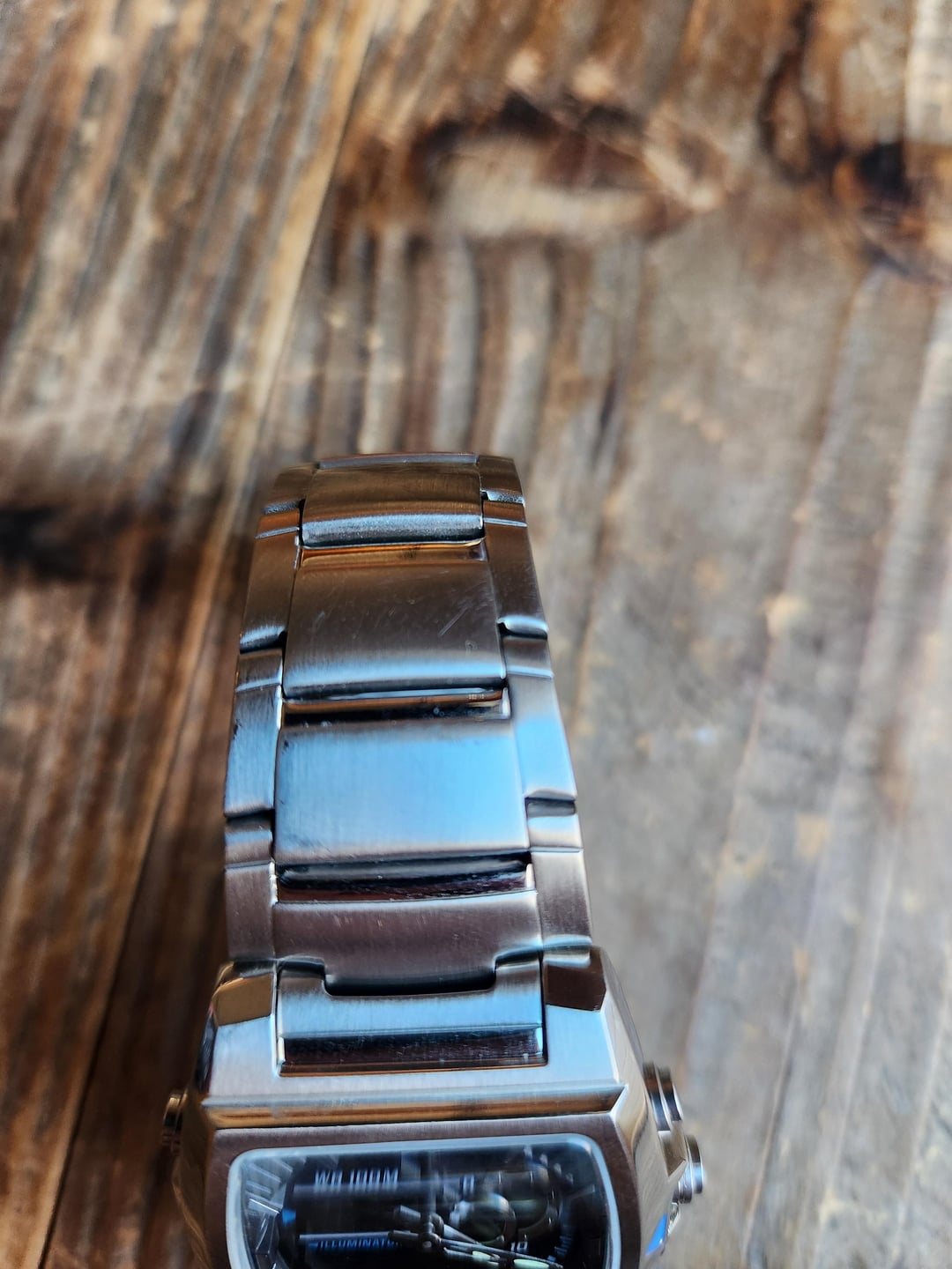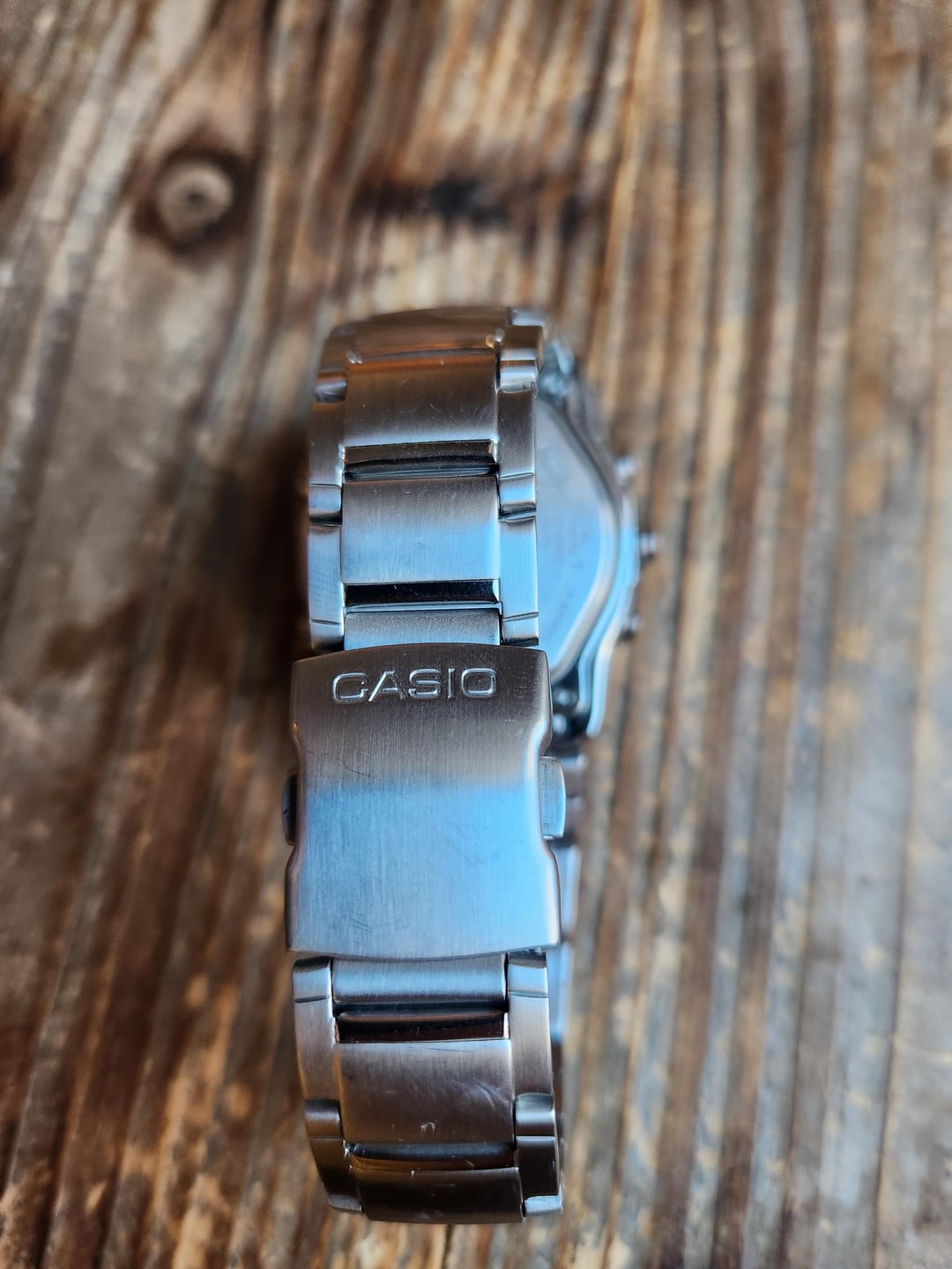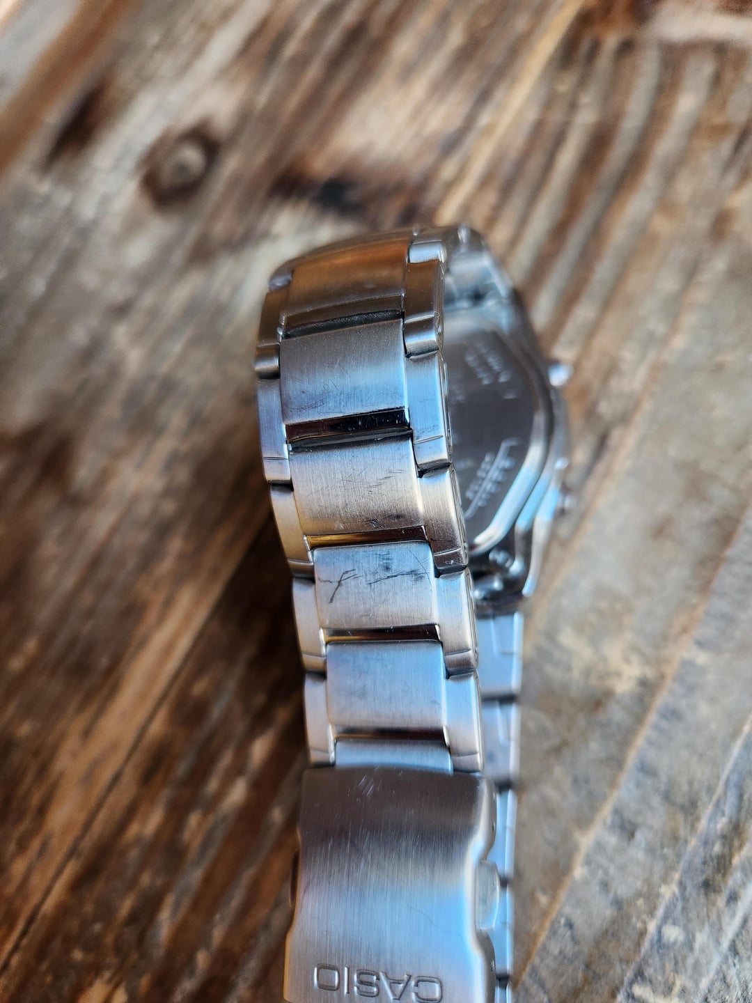 Brand: Casio Line: Edifice Model: Ana-Digi Thermometer Chronograph Movement: Quartz Display: Analog + Digital Case: Stainless steel Bracelet: Stainless steel (fits up to ~7.5" wrist, no extra links) Water Resistance: 100 meters Features: Thermometer, chronograph, alarm, auto light / illuminator, dual time I love this watch. It wears beautifully but it's entirely too complicated for me! Condition: Excellent overall condition. Crystal is clean. Case and bracelet show only light surface wear consistent with normal use. All functions operate properly including thermometer, chronograph, alarm, and illumination. Buttons are crisp and responsive. Bracelet fits up to approximately a 7.5" wrist — no additional links included. Includes: Watch only — no box or papers. Will be securely packaged for shipment. Price: $150 shipped CONUS. PayPal Goods & Services only. No notes please. Location: Colorado, USA
