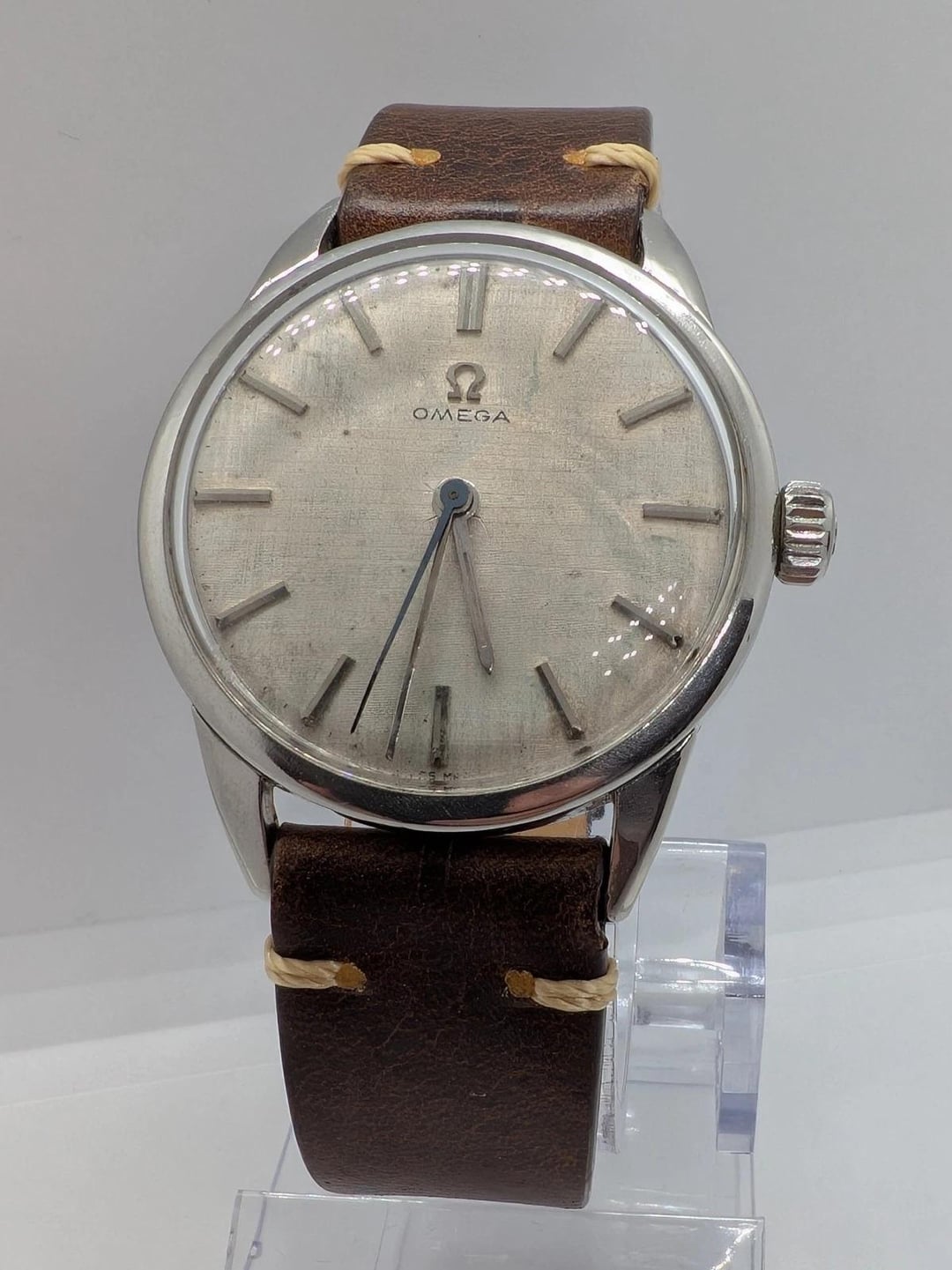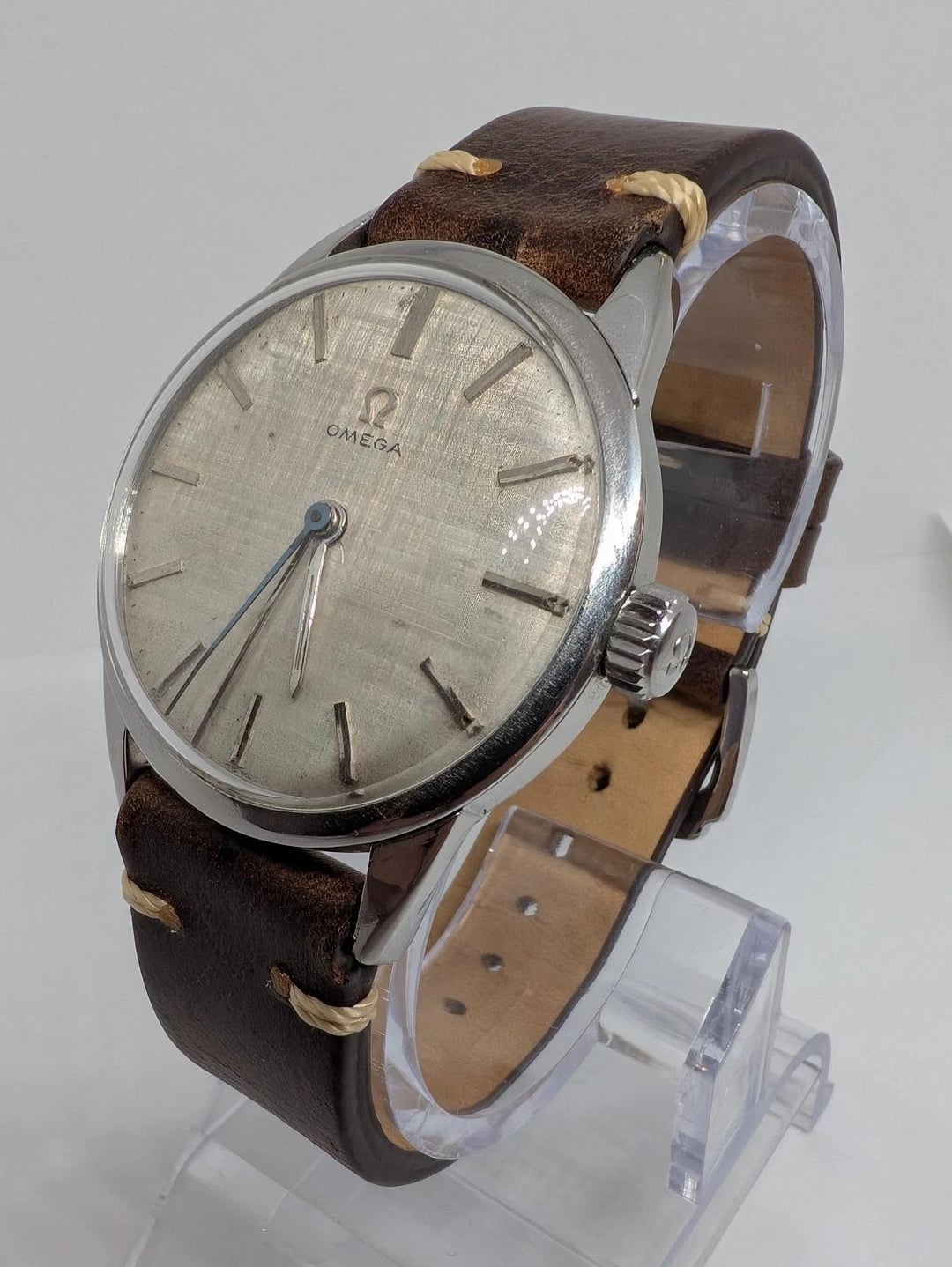 **Stunning Omega Vintage 1970's Watch Linen Dial** Omega Vintage Manual‑Wind Watch – 34mm Stainless Steel – Classic Dress StyleUp for auction is a charming vintage Omega manual‑wind wristwatch, a lovely example of classic mid‑century design. It features: ✨ Satin silver dial with applied silver baton hour markers ✨ Slim silver hands with a blue central seconds hand ✨ 34mm stainless steel case with original Omega‑signed crown ✨ Snap‑back case housing a traditional manual‑wind movement ✨ Fitted to a brown leather strap that suits the watch nicely Condition & History - I’ve owned this watch for around five years, and it was serviced approximately two years ago. It's been in storage since, but I've just run it for four hours and it's accurate to +/- 2 seconds over that period. So it's running well. 📦 Will be posted securely and well‑packaged.Feel free to get in touch if you have any questions. Thanks for looking! £450 ono (includes shipping in the UK)