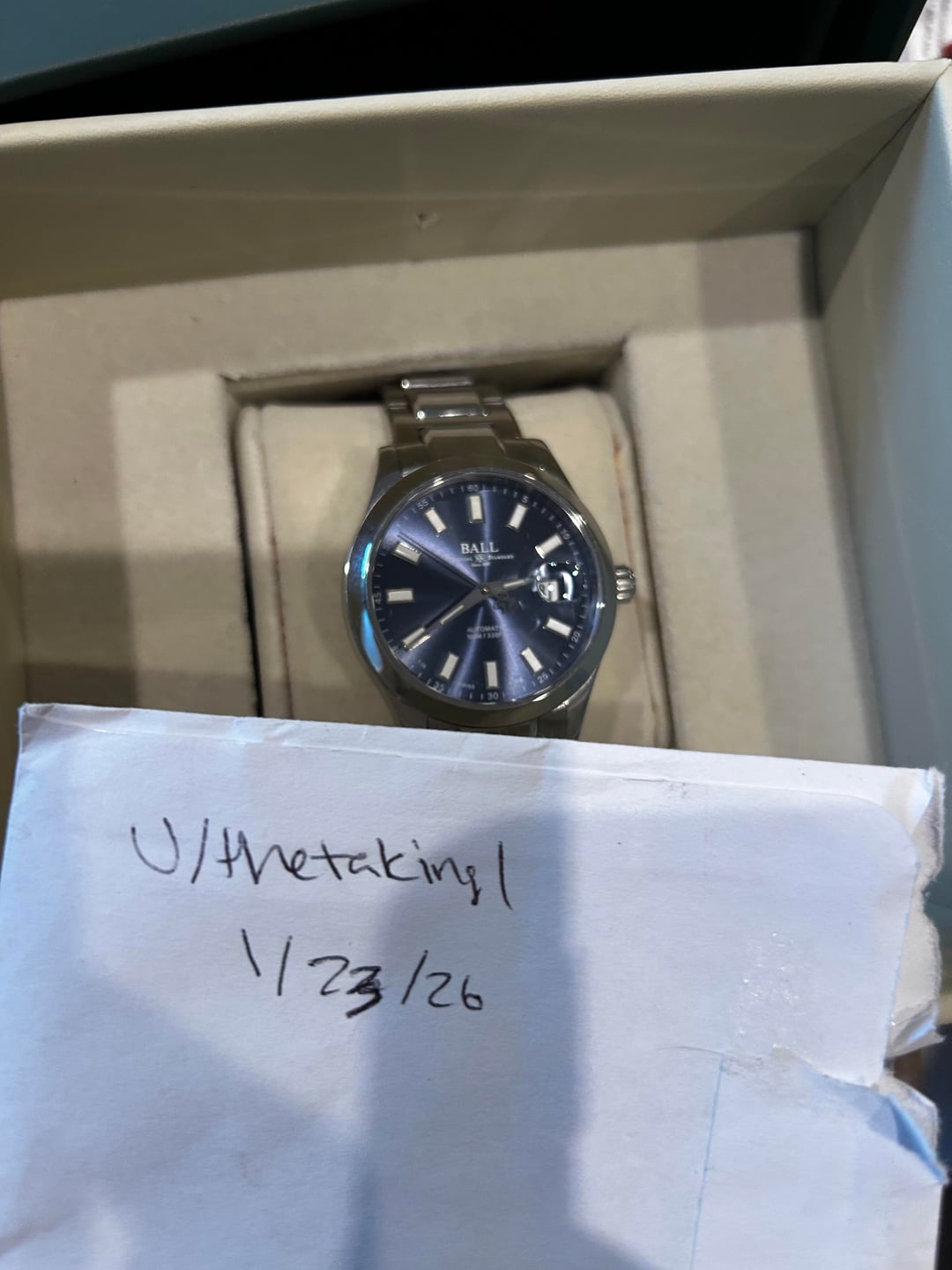 Full kit — box, papers, the whole Swiss superhero origin story. That gorgeous blue dial does that Ball thing where it looks calm one second and absolutely electric the next. Built like a tank, tritium tubes glowing strong, and ready for daily duty without breaking a sweat. Condition is solid, exactly what you want from a watch meant to be worn and enjoyed, not locked in a safe. If you’ve been curious about Ball but didn’t want to pay new-retail “ouch” prices, this is your chance. $1095 + label No trades unless it’s something really cool or in my favor.