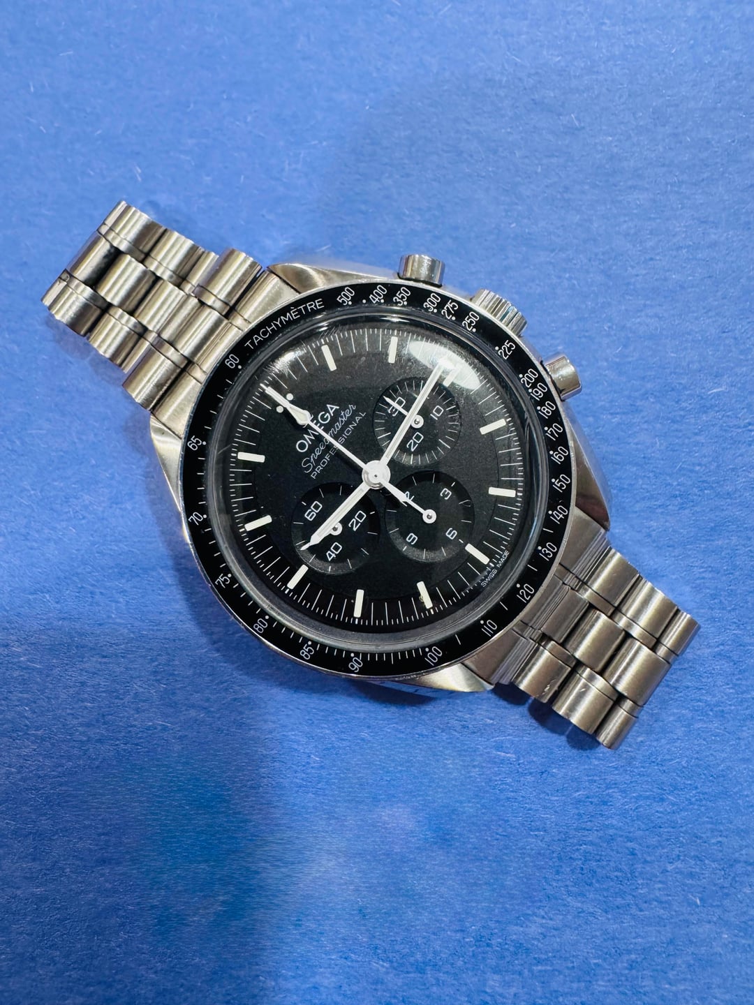 For sale is an Omega Speedmaster Professional Moonwatch 3861 Hesalite, purchased from an Authorized Dealer with a 6/2024 dated warranty card. Condition This has been a daily for ~1 year Shows normal wear/use consistent with daily rotation Never polished Crystal is Hesalite and presents well Details Movement: Cal. 3861 (Master Chronometer) • Bracelet: Current bracelet with tool-less sliding clasp adjustment Fit & function: Running properly, no issues Upgrades / Extras Spiralwinder sapphire display caseback installed Makes this a true Hesalite sandwich (Hesalite front, sapphire back) Original Hesalite caseback included Genuine Omega brown leather NATO included Included Full AD kit: inner/outer box, cards (dated 6/24), booklets All original bracelet links Price: Was $5,995, now $5500 shipped CONUS, fully insured & tracked Photos / timestamp: Available on request References: Available Priced to reflect honest daily wear while keeping the value-add upgrades intact.