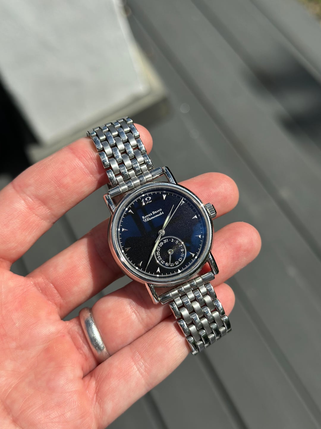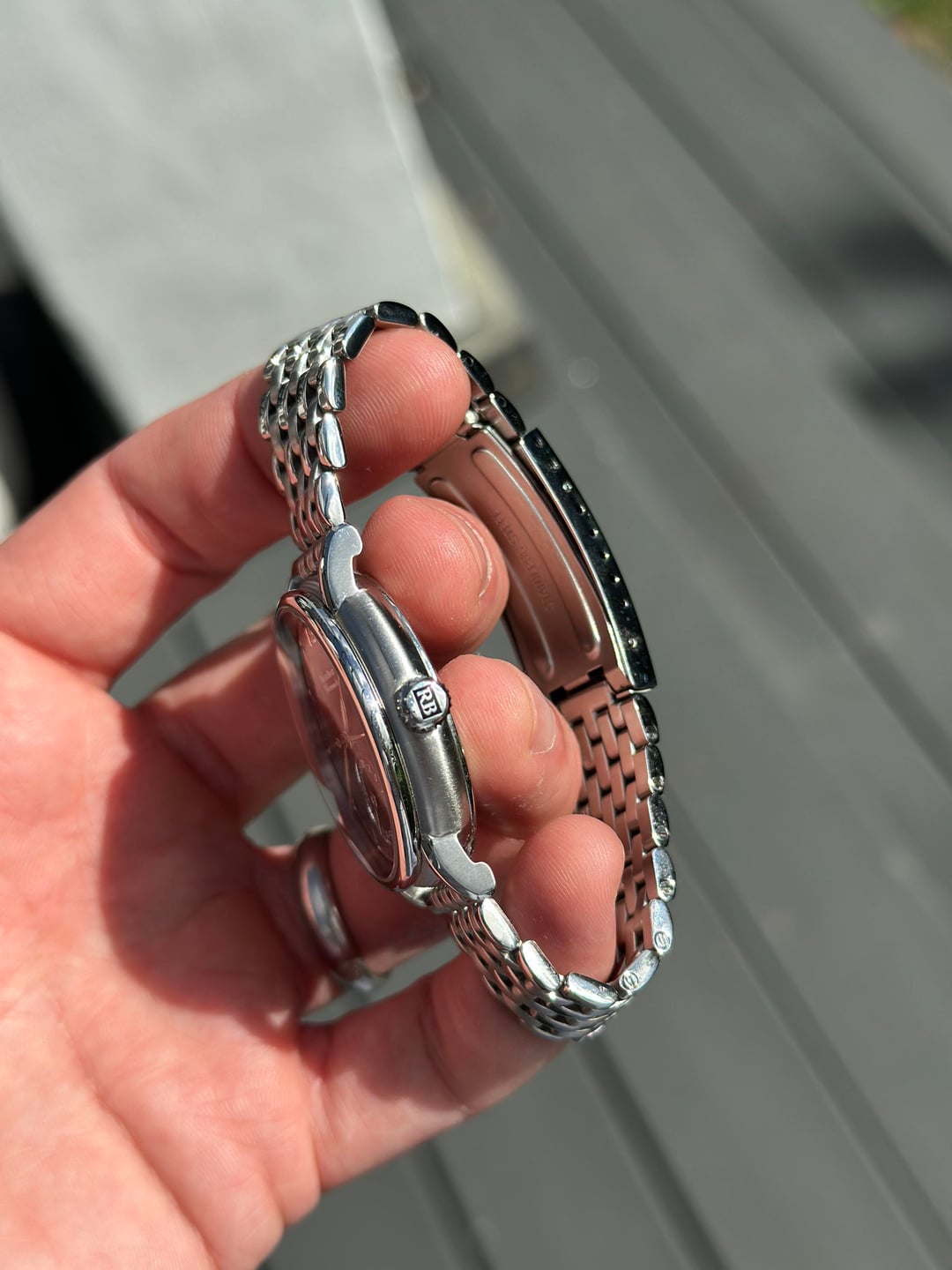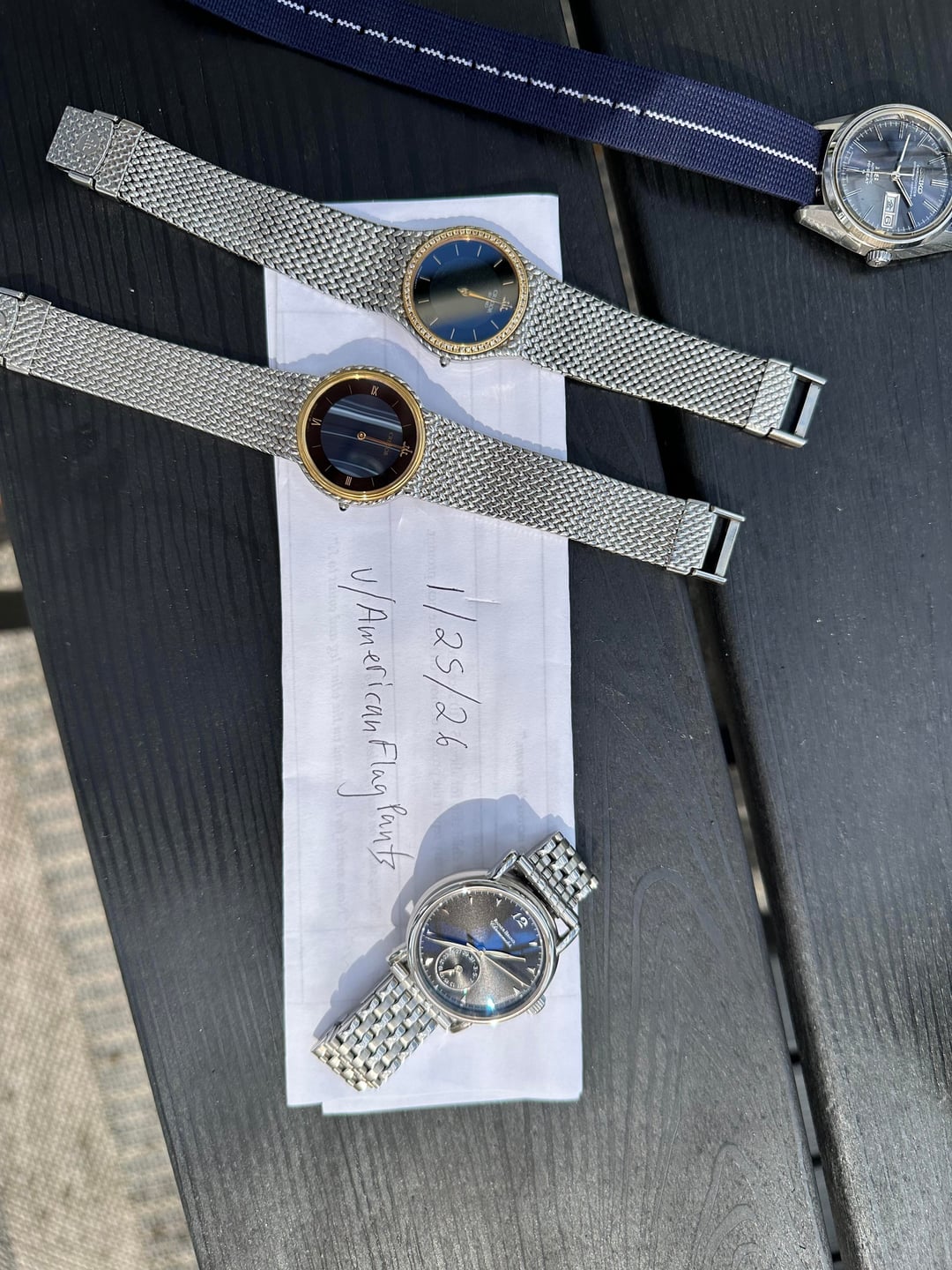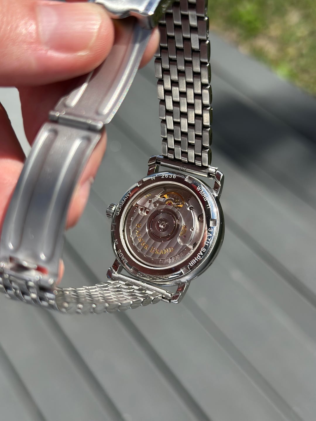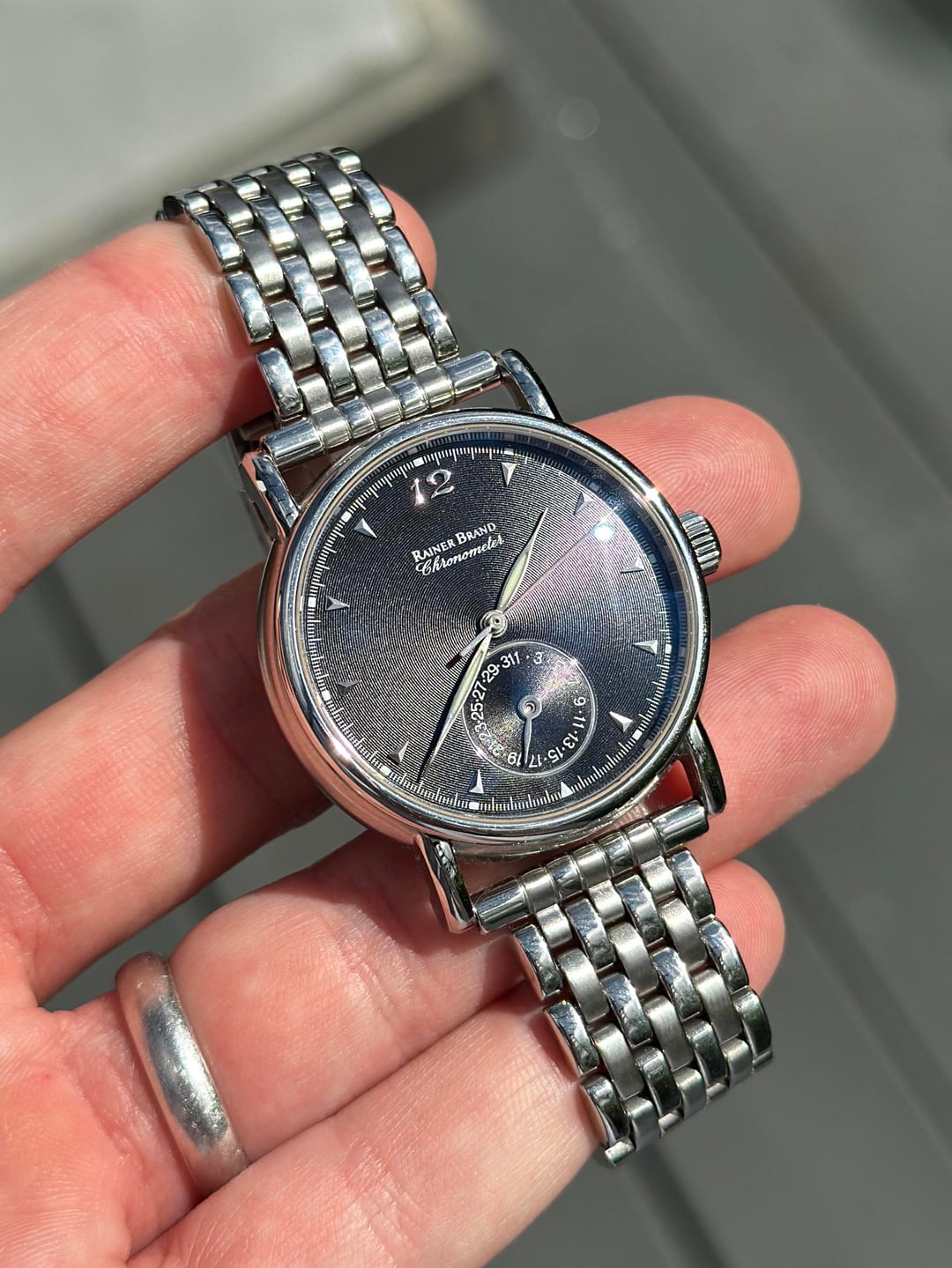 Up for sale is a Panama Chronometer from Rainer Brand. Rainer Brand (a person) is a German watchmaker located in Bavaria who launched his own eponymous watch brand (Rainer Brand) in the early 1990s. Rainer Brand produces around 400 watches each year. It makes its watches in Germany and has a strong focus on hand finishing its dials and other elements of its watches. I like their watches because Rainer Brand generally produce designs that seem restrained until you look more closely, when at which point the details start to shine. This watch is a Panama Chronometer model dating to the 2010s. The watch measures in with a 36mm diameter dial, though it wears larger because of its thinner bezel and wider 20mm square lugs. The black dial features polished fang indices, a single Breguet Numeral (12), and a pointer date sub dial. The black dial, however, is not simply a matte black, but rather a sunburst concentric guilloche pattern. The dial is beautifully executed and the centerpiece of this watch. While I see some elements of other watch brands in the design, it really is a unique combination of wonderfully executed elements that I haven't seen elsewhere. The case similarly has a unique touch. In terms of shape, it is a convex cylinder or something like the shape of a macaroon. The case shows different finishing techniques as well: the bezel and lugs are polished and the sides of the case are matte finish. Because of the shorter lugs, the case has cutouts between the lugs to prevent bracelet or strap rubbing--this is a case feature I see often on ultra thins produced by Audemars Piguet but otherwise do not see too often. The crown is signed with "RB" and the negative space is blacked out. The back of the watch features an exhibition caseback that shows off a modified and decorated ETA 2892-2 movement. The movement is chronometer certified. Overall, Rainer Brand is a small watchmaker that's been operating for more than 30 years with--from what I can see--very little following in the US (I believe this is the first ever posted in this subreddit). But nevertheless Rainer Brand makes one hell of a watch, and at that it makes a watch that keeps giving the more you look at it. This one comes with a Forsner beads of rice bracelet with alternating polished and matte links, which perfectly compliments the case of this watch. **Price:** $2,100 **Timestamp:** in photos **Videos:** I can send a video of the watch through my instagram, @WarmDials **Payment and Shipping:** to be agreed upon by the buyer and myself, taking the buyer's purchase history into consideration. I'm located in the United States and frequent user in this community. I have bought and sold often, and I'm happy to answer any questions you may have / provide more photos or a video. You can find me on instagram at @WarmDials. Don't hesitate to reach out if you have any questions or want to chat