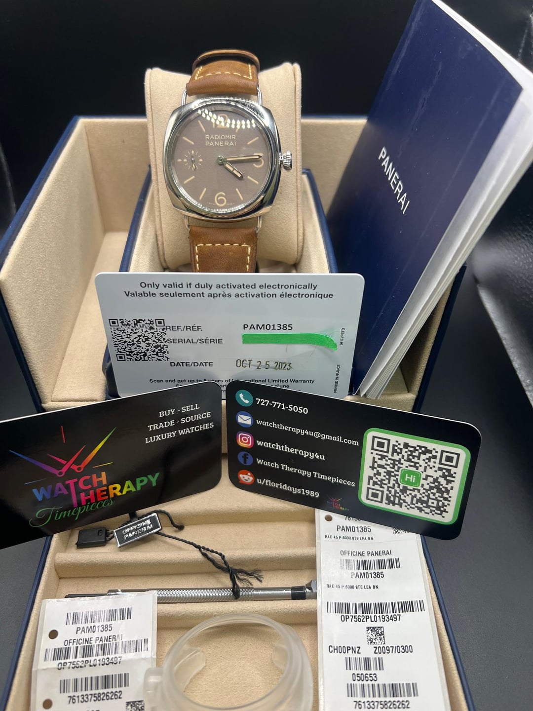 **F/S: Panerai Luminor Officine Brown Dial B&P PAM01385/PAM 1385 45mm** **Limited Boutique Edition 1 of 300, warranty through 2031!** **Specs:** \* Beautiful Matte beige dial- Sapphire crystal \* Manual-winding \* 45mm SS case \* 100M Water Resistance \* 72-hour power reserve \* P.6000 movement with small second’s display **Includes**: Warranty card 11/2023, all boxes, stickers, hang tag, screw driver, booklets/manual. **Condition:** Great pre-owned condition- there are a few superficial hairlines on the polished areas. Crystal is clean. **Price: $4199.00+ Insured shipping to your local FedEx for pick-up in Con US.** I am also open to a face-to-face public transaction in or around the Tampa Florida Region, within reason. I have many strong and viable references within Reddit and from Buy/Sell/Trade Watch Facebook groups. Always willing to jump on a call or meeting link to show you the watch. Thank you and please reach out if you have any questions or concerns. Florida residents may be subject to sales tax w/o a valid reseller cert. ***No Trades, TY*** **Location**: Tampa Florida **Payment:** Zelle or Wire Timestamp: [https://imgur.com/a/w2Gcren](https://imgur.com/a/w2Gcren) FB: Watch Therapy Timepieces IG: [watchtherapy4u](https://www.reddit.com/u/watchtherapy4u/)