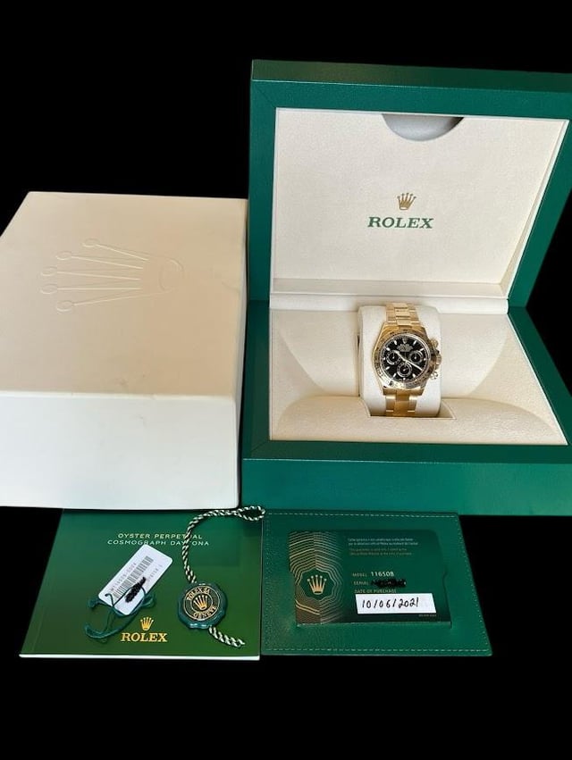 New to selling on Reddit. Just got my first Reddit transaction reference this week selling a Rolex Pepsi. I run a licensed watch selling biz in good standing and have tons of references selling in FB groups and elsewhere online. Happy to jump on video calls with serious buyers. This 2021 yellow gold Daytona 116508 comes as a full set including the white tag and new style warranty card. Factory warranty is valid until October 2026. The watch is in retail ready condition. Please view pics closely. Happy to provide more pics and video. Wire price is only $45,000 which is cheapest in the world for a full set. The hard to find black dial 116508 reference typically goes for around $50k on the high fee platforms such as ebay and chrono24. Look around. For whatever reason the black dial is far more rare than the John Mayer. Price is shipped CONUS fully insured to your nearest Fedex store where you will show a valid drivers license to pick it up. If I am not shipping to WA state (where my biz is registered) I do not need to collect sales tax. WA residents will have to provide a resale certificate or pay sales tax.