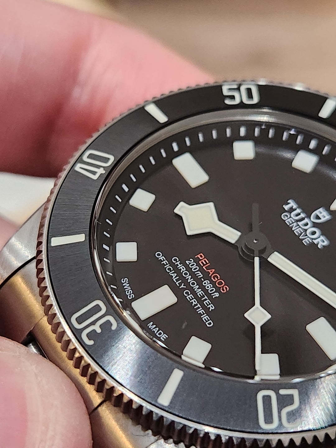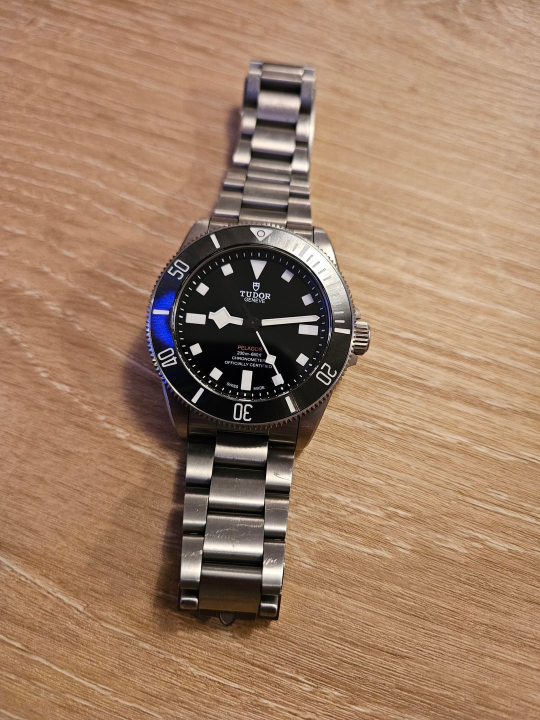 Price: $3,400 including 2 days US shipping (wire, Zelle, or Paypal F&F). For sale is my Tudor Pelagos 39 (39mm titanium grade 2 case, black dial, 25407N). Purchased new from an AD in June 2023, still under Tudor’s 5-year transferable warranty until June 2028. Comes as a complete set: - Inner & outer boxes - Warranty card dated June 2023 - Booklets, hang tag, extra links - Original Tudor rubber strap and rubber dive extension - Includes Uncle Seiko titanium half link, which was essential for getting the right fit on my boney 6.5"wrist. Condition: Very good used condition. Typical wondrn condition marks and light swirls on the case clasp and bracelet from normal wear. Grade 2 titanium picks up minor scuffs very easily but no deep scratches, dings or dents anywhere. Very slight mark on the crystal just after 5:00. Bezel and lume are perfect. Keeps outstanding time – consistently -1 to -2 sec/day on wrist. Best 60 click bezel action on the market. This is the “just right” modern Tudor diver: 39mm, 200m, in-house MT5400 movement, titanium lightness, and that killer sunburst black dial. Easily one of the best do-it-all watches on the market. No trades at this time, please. Happy to FaceTime or provide as many photos/videos as needed.