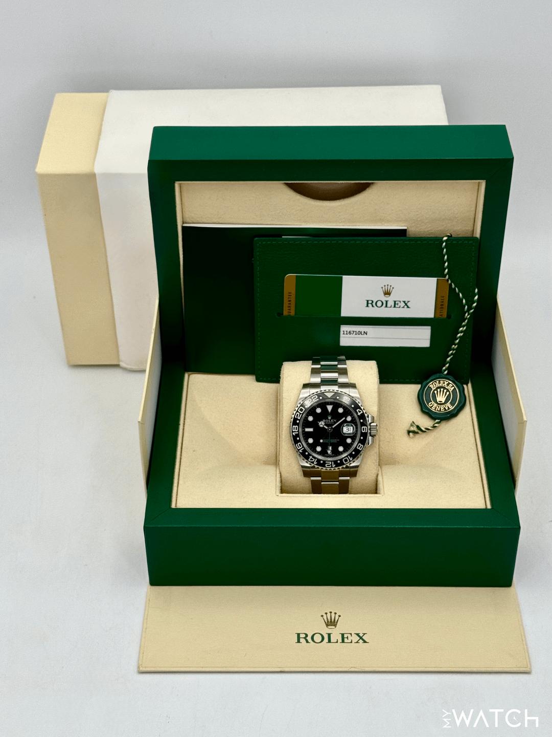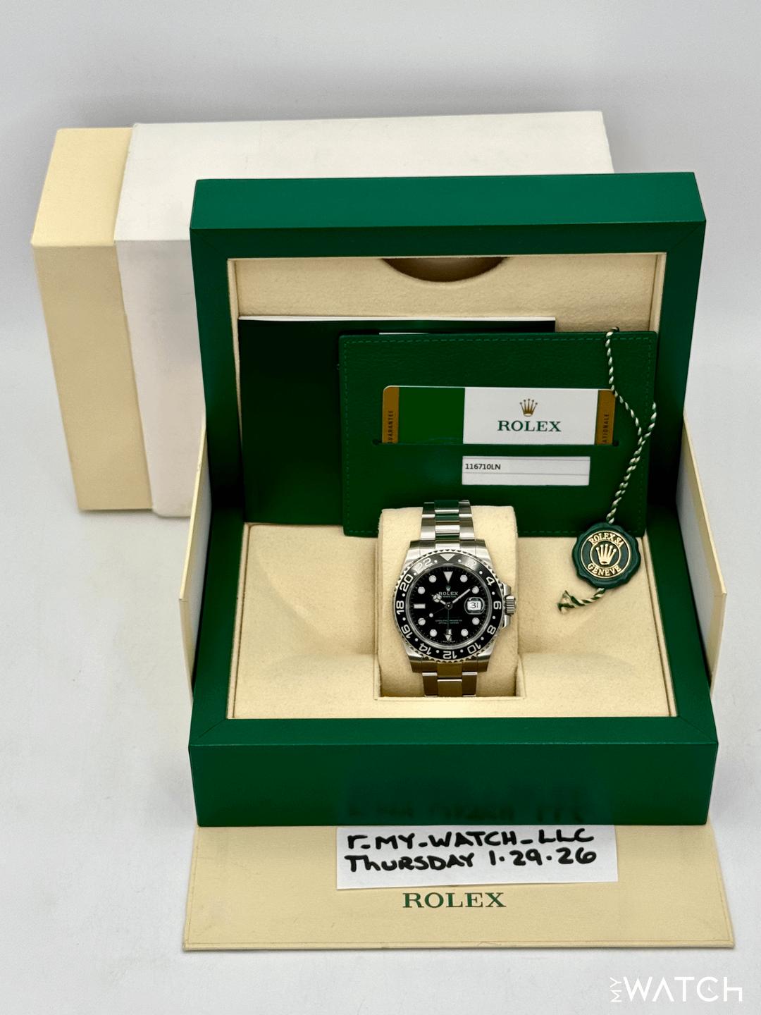 🔵**2018 Rolex GMT-Master II 40mm 116710LN Stainless Steel Black Dial** 🔵**TRADE or SELL us your luxury watch, all brands considered. Message me details.** **Includes the following:** **✔️Original Rolex Double Boxed** **✔️Box and Papers - Yes** **✔️Warranty card dated 2018** **✔️Manual and Warranty booklets** **✔️Green Hang Tag included** **✔️Size: 8.0inch wrist (Full Links)** **✔️Watch is in excellent overall condition. Please see photos for details.** **✔️**[**Trades**](https://mywatchllc.com/pages/sell-rolex-watch) **welcome** Business Name: **My Watch LLC** LOCATION: Oak Park, Michigan ✔️[MyWatchLLC.com](http://mywatchllc.com/) for current inventory ✔️Google Business Listing [https://g.co/kgs/Cmd6FPW](https://g.co/kgs/Cmd6FPW) ✔️Business Hours M-F 9-6 ✔️Facetime/Video chat/calls welcome to view the watch interested. ✔️Contact: 248-422-0909 via text or call for quickest response. 🟢TERMS: Visit [MyWatchLLC.Com](http://mywatchllc.com/) for payments accepted 🟢REFERENCES/REVIEWS: We are well reviewed on all platforms from google, trust pilot, rolexforums, additionally we have 300+ reference in multiple FaceBook watch groups, reference checks welcome. 🟢SHIPPING: If you are not local, we offer Fully Insured FedEx overnight shipping in the USA for a fee. International shipping available. [https://mywatchllc.com/products/2018-rolex-gmt-master-ii-40mm-116710ln-stainless-steel-black-dial-9](https://mywatchllc.com/products/2018-rolex-gmt-master-ii-40mm-116710ln-stainless-steel-black-dial-9)