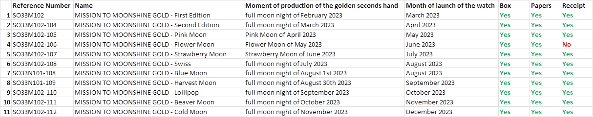 I am offering for sales my full collection of the Mission to Moonshine Gold MoonSwatches. This is a complete set of 11 watches - all limited editions with gold seconds hand, produced throughout 2023. Each piece made separately on monthly basis.