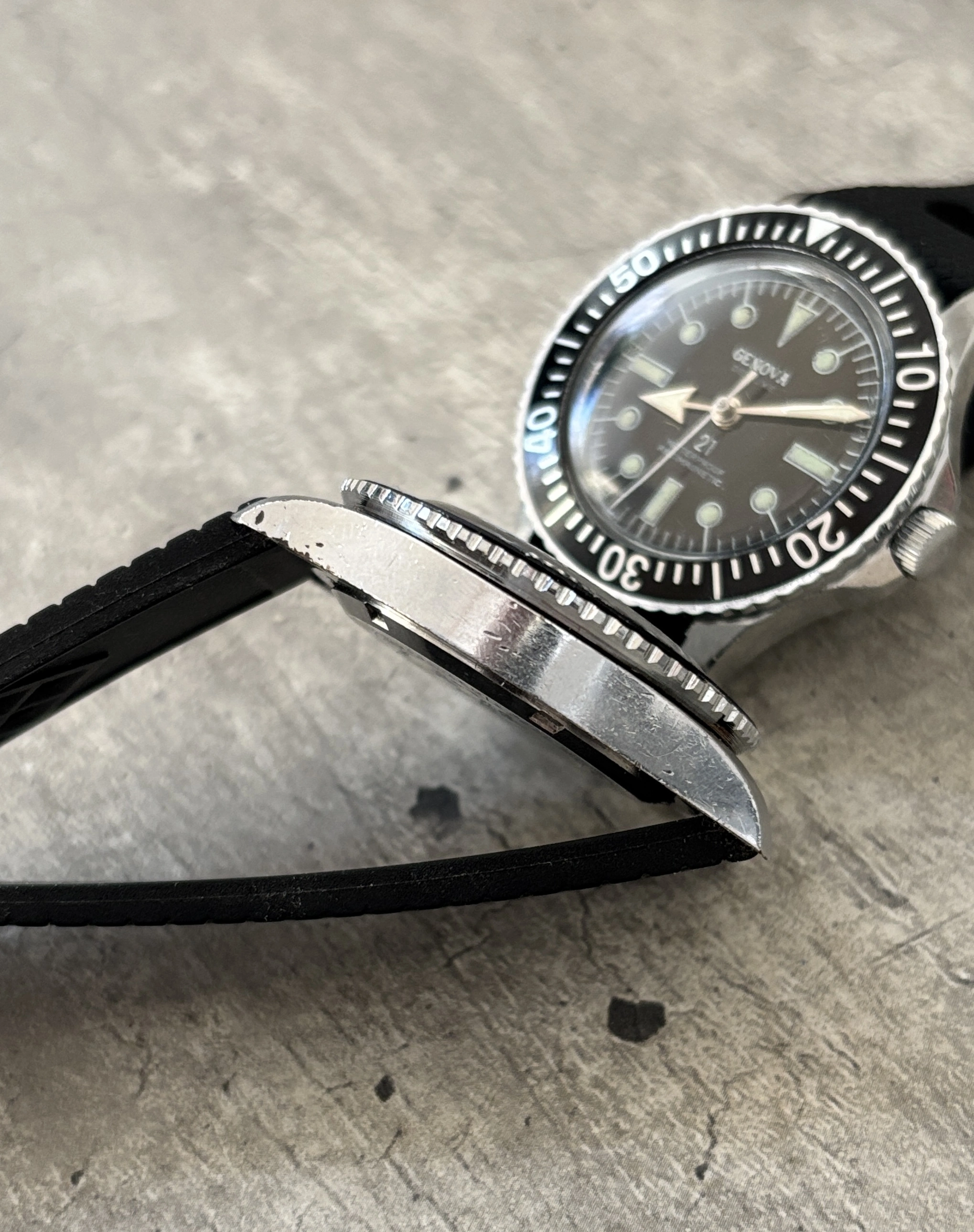 Watch with DATE mechanism presents as slightly older - mid 1960’s - with what I would describe as a “Maxi” dial based on large lume plots and beautiful Genova logo and script. Dial has faded to a lovely “tropical” hue.