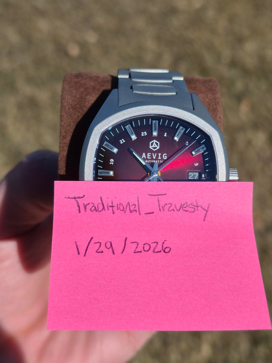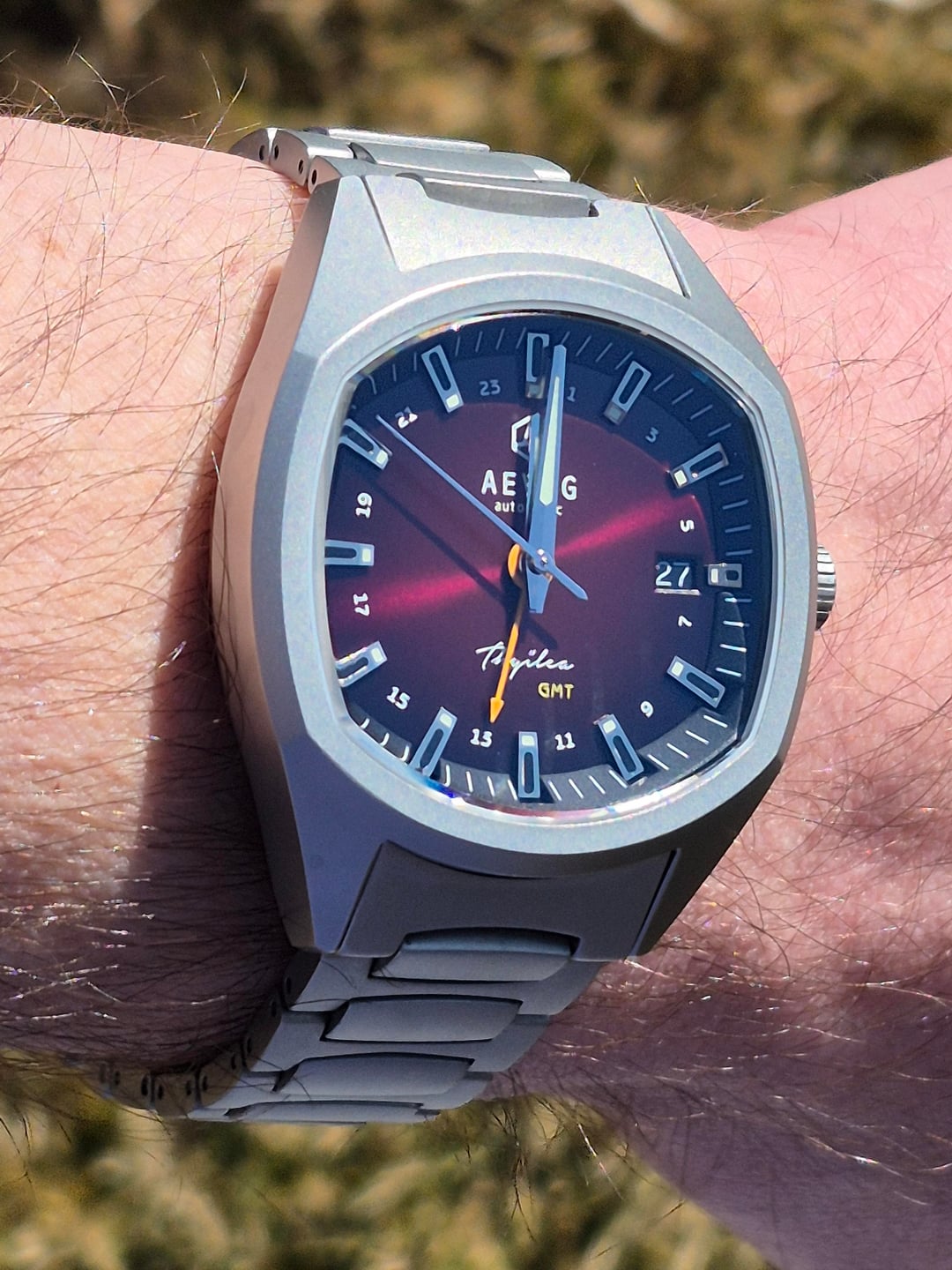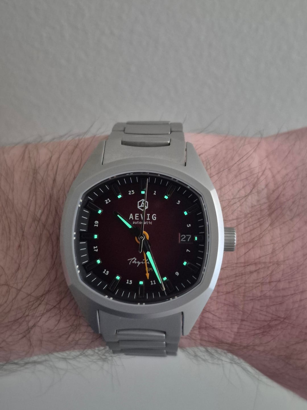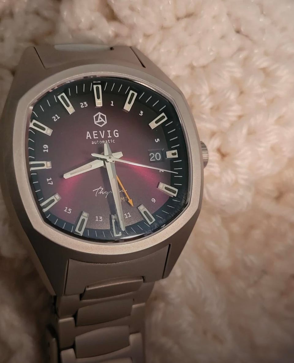 Up for sale is this unique take on the TV-style case from Aevig. Aevig is a microbrand producing a range of its watches with a modernized 60s-70s aesthetic. Aevig's Thule is a callback to a time when the TV-style case made a much more frequent appearance. A sure way to add a bit of variety to the collection with its merlot tones and its unique shape, the Thule is a watch that manages to look both classy and sporty while featuring a very effective scratch resistance. Material: Titanium Scratch Resistance: 1200 HV Quick-release bracelet tabs for easy, toolless removal In-house regulated NH34 Crystal: flat sapphire with bevel edge, AR coated on the inside Dimensions: 39mm width x 48.5 mm length 100 M of water resistant and screw-down crown This watch is in near-perfect condition with faint wear on the INSIDE of the bracelet not apparent while it's worn. Regulated and clocking in with fantastic accuracy. The last I checked, it was running at less than a second per day. Going for $425, this one is a steal. But also made of titanium 🙄 CONUS and PayPal only, with shipping covered by me