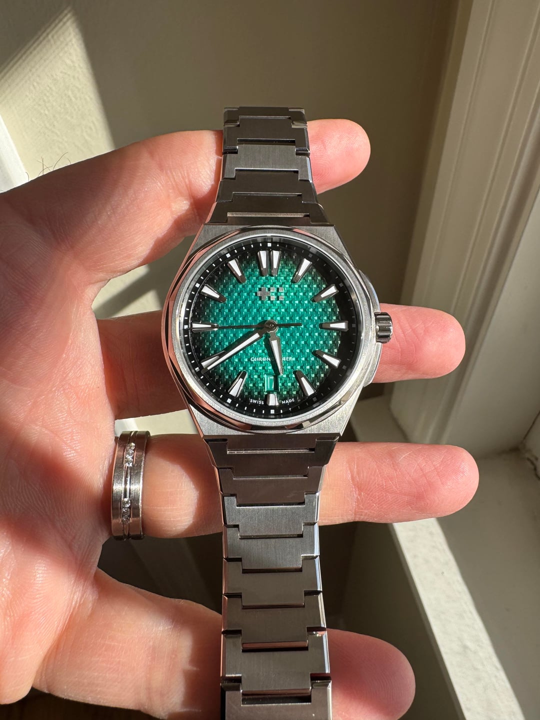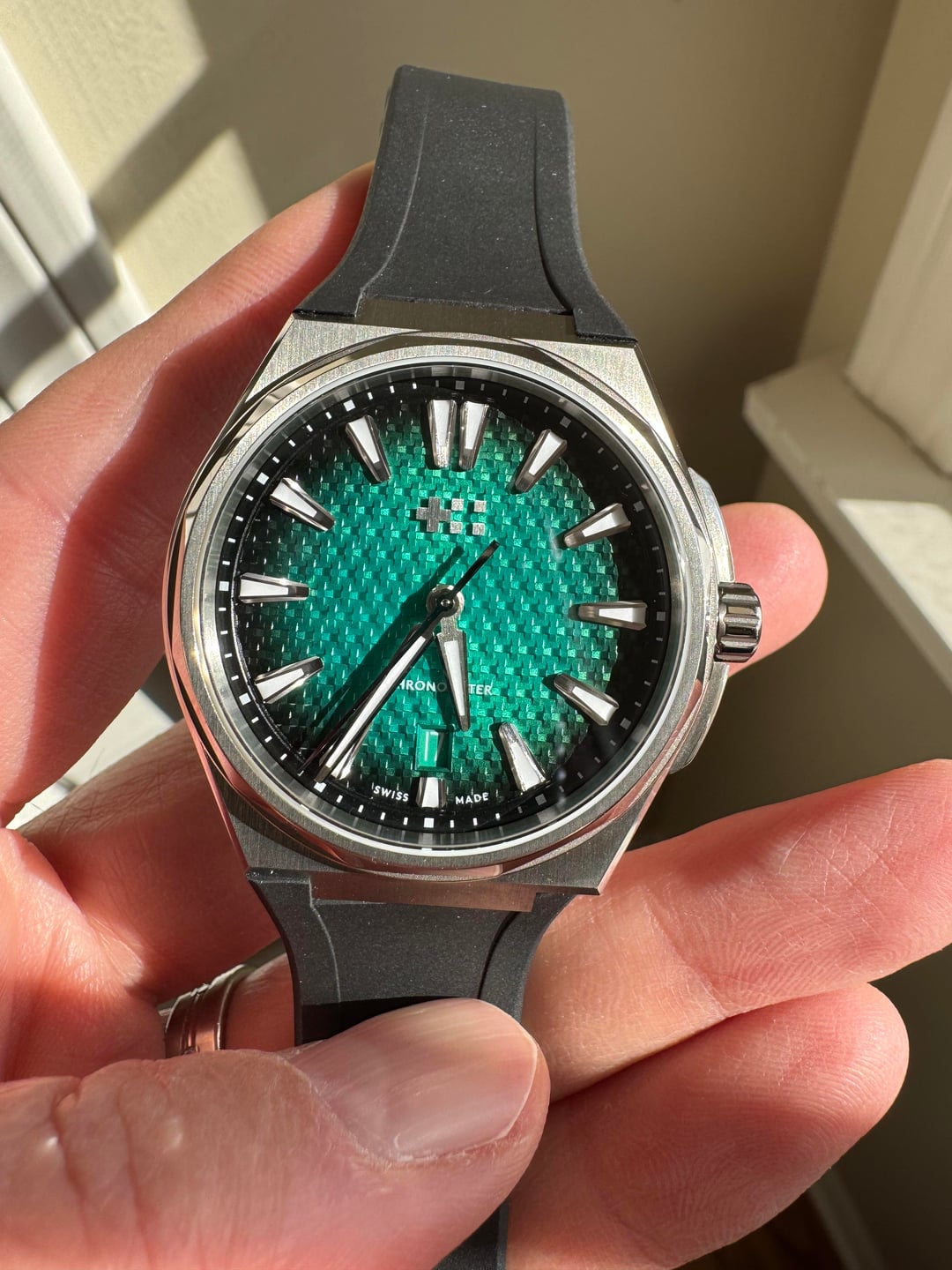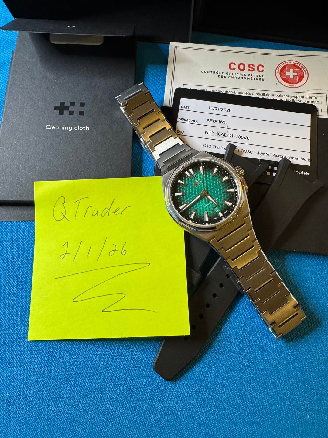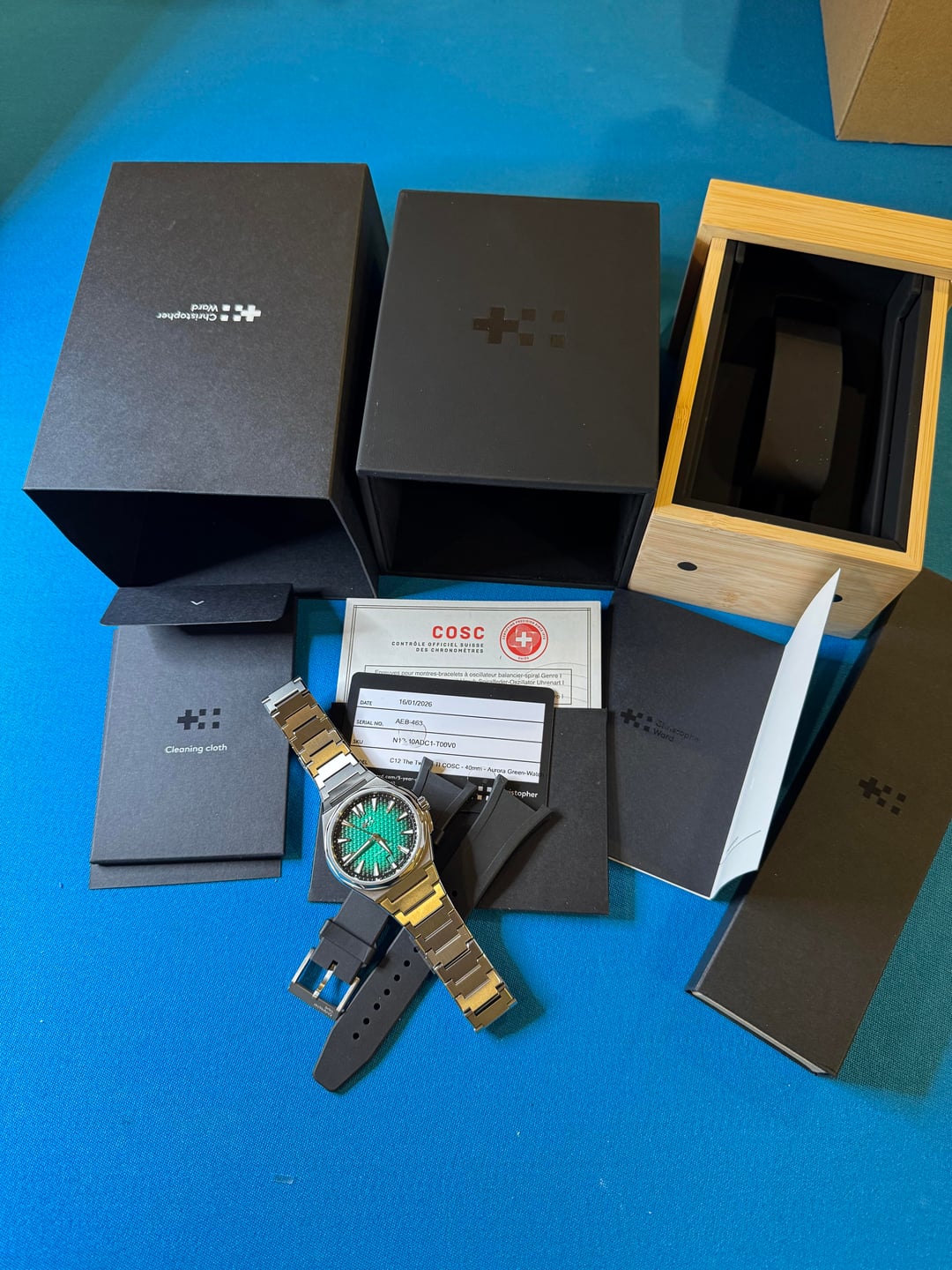 Putting up this beautiful Aurora Green Christopher Ward Twelve 40mm Titanium! This watch is essentially new along with the bracelet it includes a black factory rubber strap. I am offering this one up at $1550 shipped.
