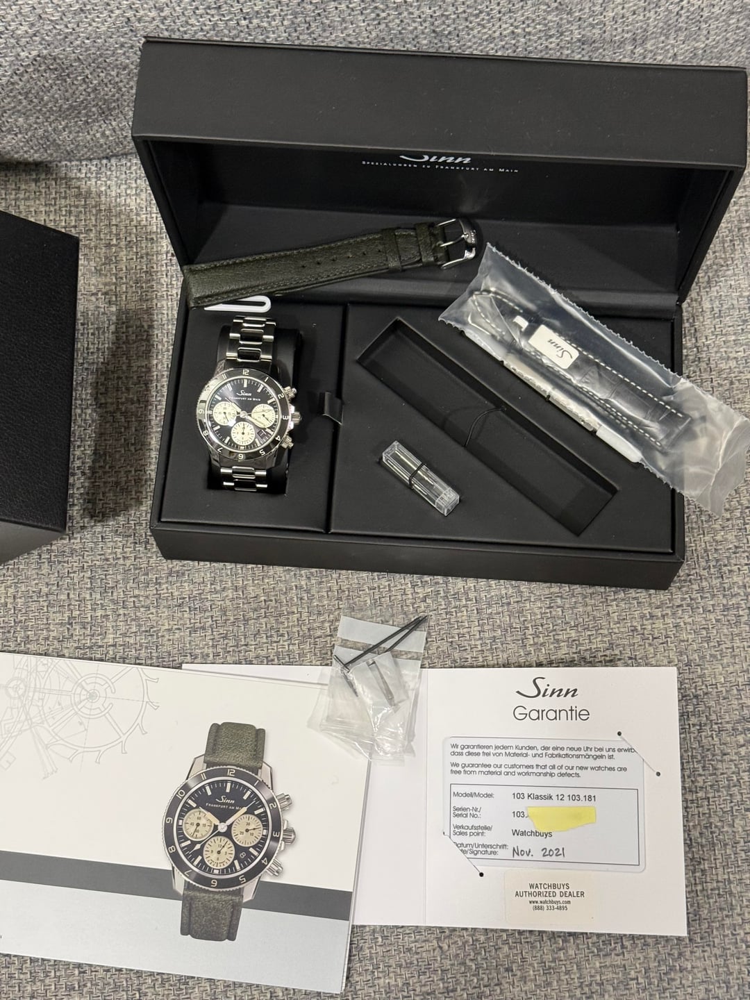 Stunning Sinn 103 Klassik 12 LE Automatic Chronograph on H Link Quick Adjust bracelet ($600 addition). Also comes with unworn OEM leather straps, along with full kit with boxset and warranty card. Timestamp in last photo. $3650 shipped CONUS. No trades at this time. Thank you!