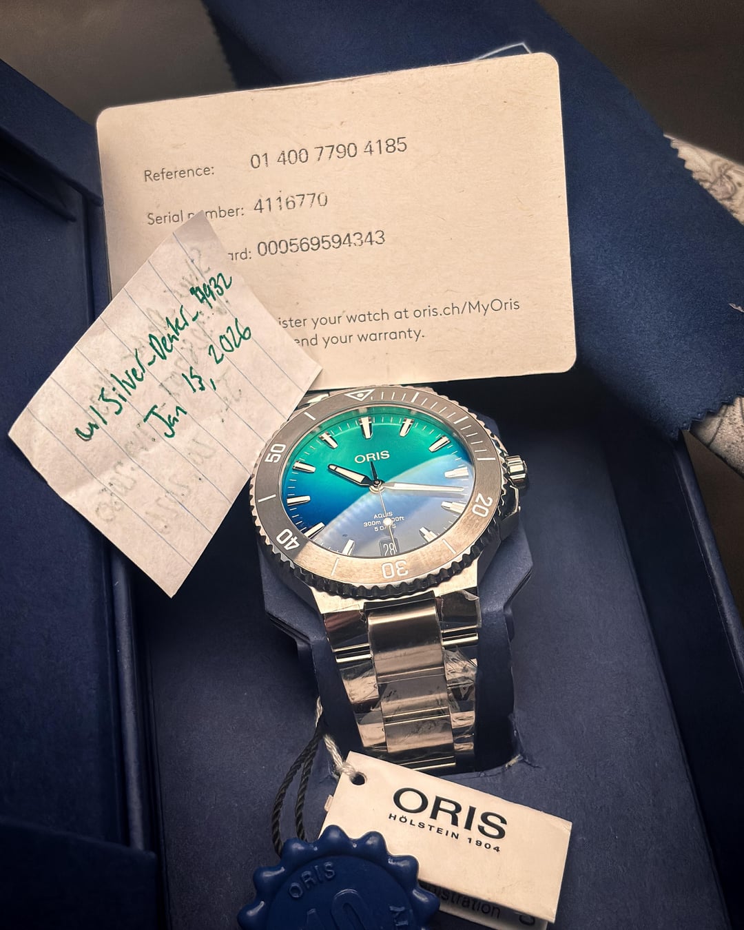 Condition Condition — Near new / excellent. Watch is a few weeks old with purchase date 1/12/2026. Stainless steel case and bracelet appear essentially unworn with no visible dings, dents, or scratches; factory protective plastic remains on the clasp and portions of the bracelet. Tungsten bezel is clean with crisp numerals and no chips or marks visible. Sapphire crystal is flawless with no scratches or blemishes. Gradient blue-to-turquoise dial is pristine with clean indices and hands. Lume is strong and evenly glowing (see lume photo). Screw-down crown operates smoothly. Caseback engraving is sharp and clean with no wear evident. ⸻ 📦 Box & Accessories Includes: Oris outer box and presentation box. Warranty card dated 1/12/2026 (QR-registered with Oris). Hand tag and factory stainless steel bracelet with all original links Calibre 400 warranty eligible for up to 10 years when registered with Oris. ⸻ 💰 Price Price — $2,499 shipped (Zelle / Wire preferred. Apple Pay / Venmo +15. Sales tax required for GA buyers without resale certificate.) Retail price: $4,750 — priced aggressively for a near-new, fully warrantied Calibre 400 Limited Edition. ⸻ 🚚 Shipping Shipping — Fully insured FedEx 2-Day, ships within 24 hours of cleared payment. ⸻ ⏱ Timestamp Timestamp — Included in photos. ⸻ 🔍 Overview Overview — Oris Aquis Date Calibre 400 Great Barrier Reef IV (Ref. 01 400 7790 4185), individually numbered 1637/2000. Features a 43.5mm stainless steel case, striking gradient blue-to-green dial inspired by the Great Barrier Reef, unidirectional tungsten bezel, sapphire crystal, and 300m water resistance. Powered by Oris’s in-house Calibre 400 automatic movement with 5-day power reserve, elevated anti-magnetic resistance, and 10-year warranty. A modern, technically impressive diver offered here in near-new condition at a substantial discount to retail.