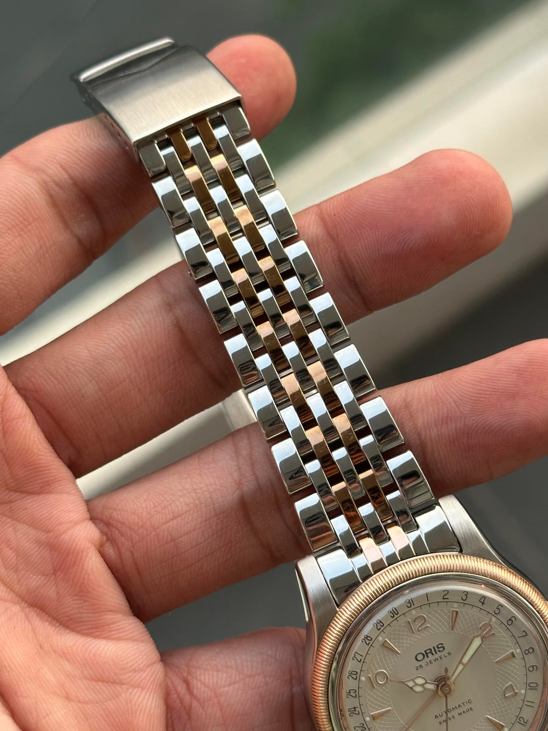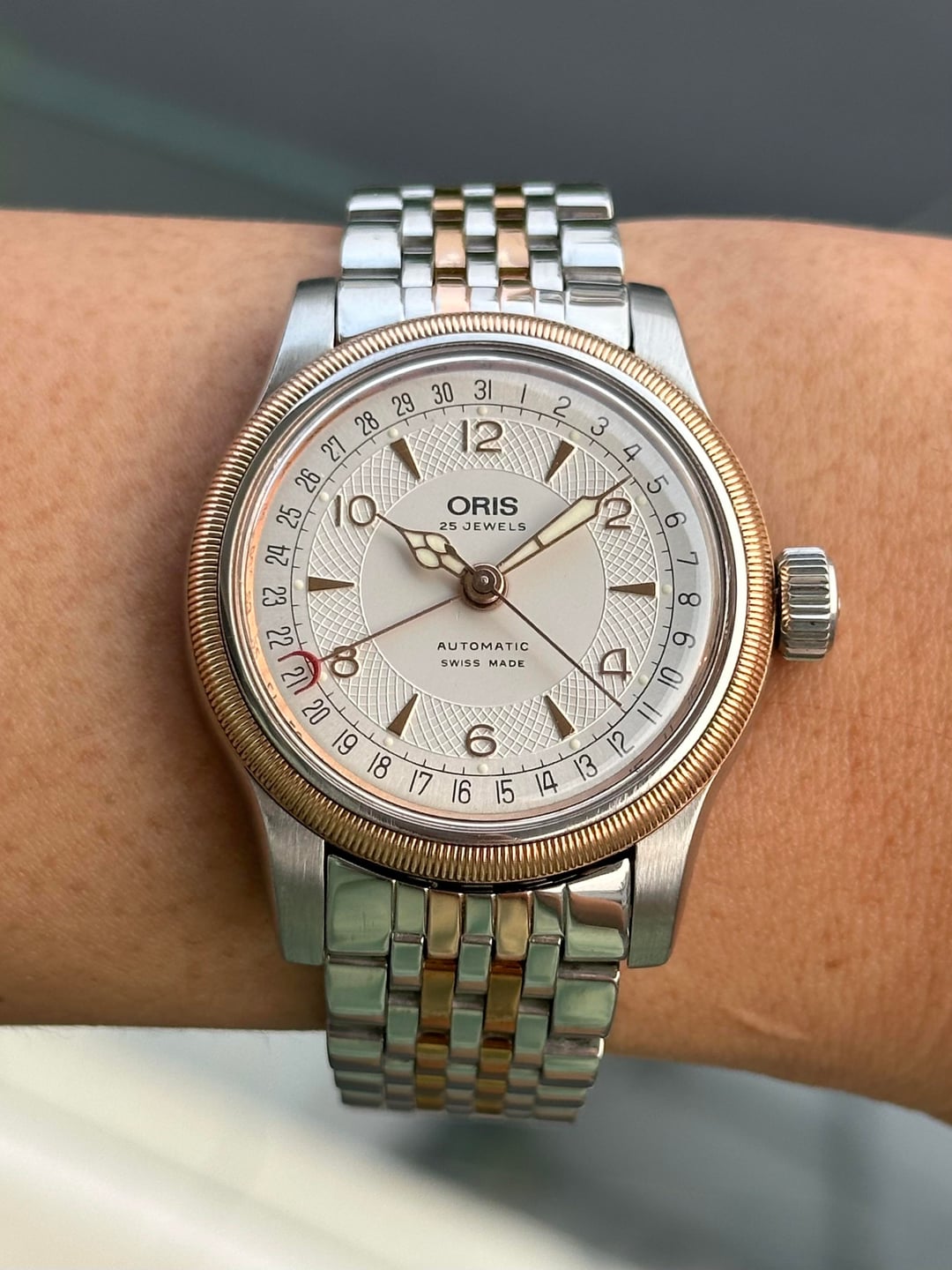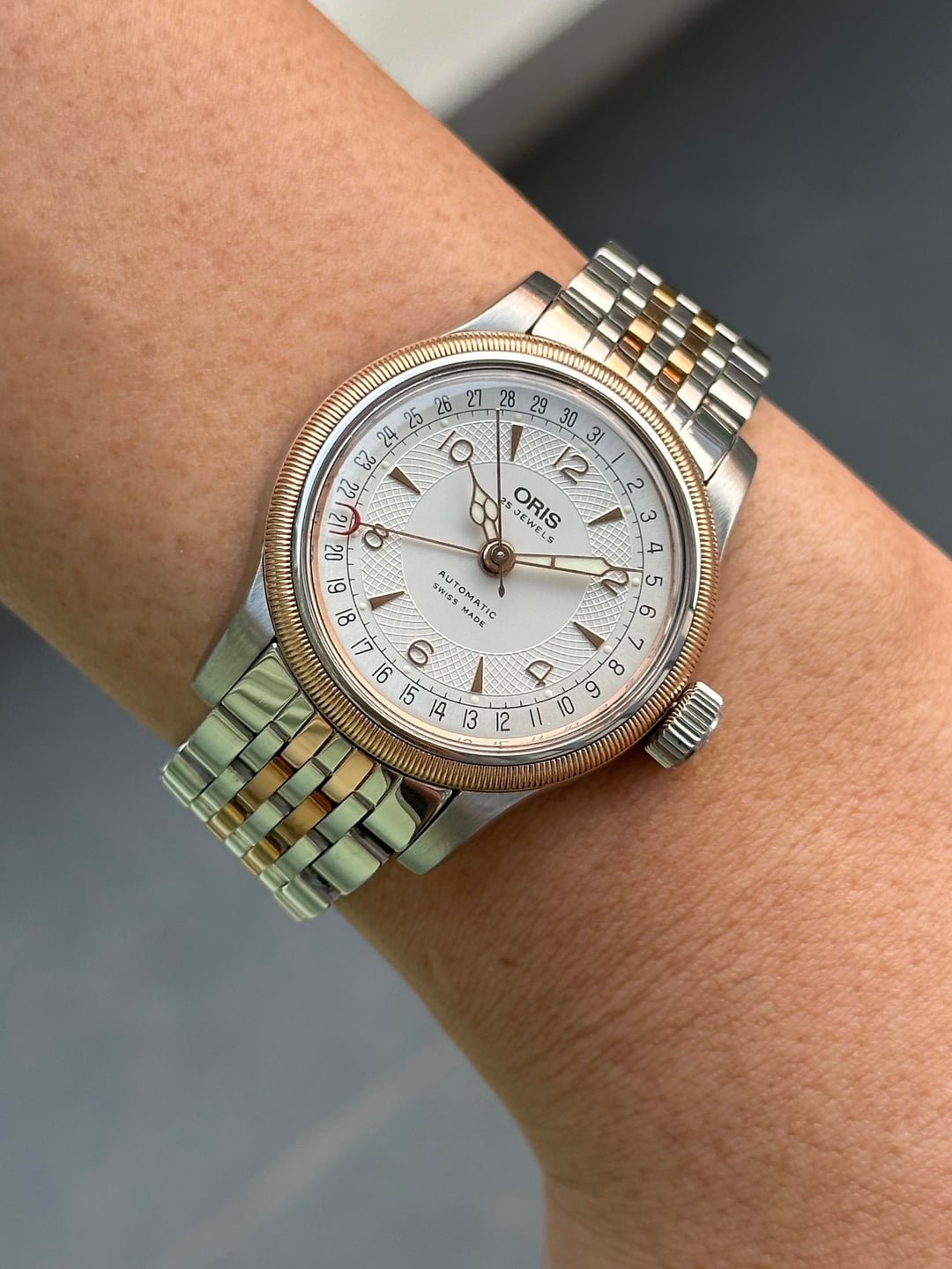 Hello r/watchexchange, For sale is an Oris Big Crown Pointer Date Two-Tone ref. 7551 (36mm). Automatic Oris Cal. 754 pointer date. Running well and recently serviced. Watch is in excellent overall condition with light wear consistent with careful use. • Silver textured dial with applied gold-tone numerals • Original hands with red crescent pointer date • Case and bezel are clean and sharp • Crystal is clear • Original two-tone bracelet fits wrists up to approx. 18.5cm Price: $999 USD Shipping: Included worldwide (UPS / DHL, tariff covered) Payment: PayPal F&F / G&S (+4.6%) No trades. Feel free to ask any questions.