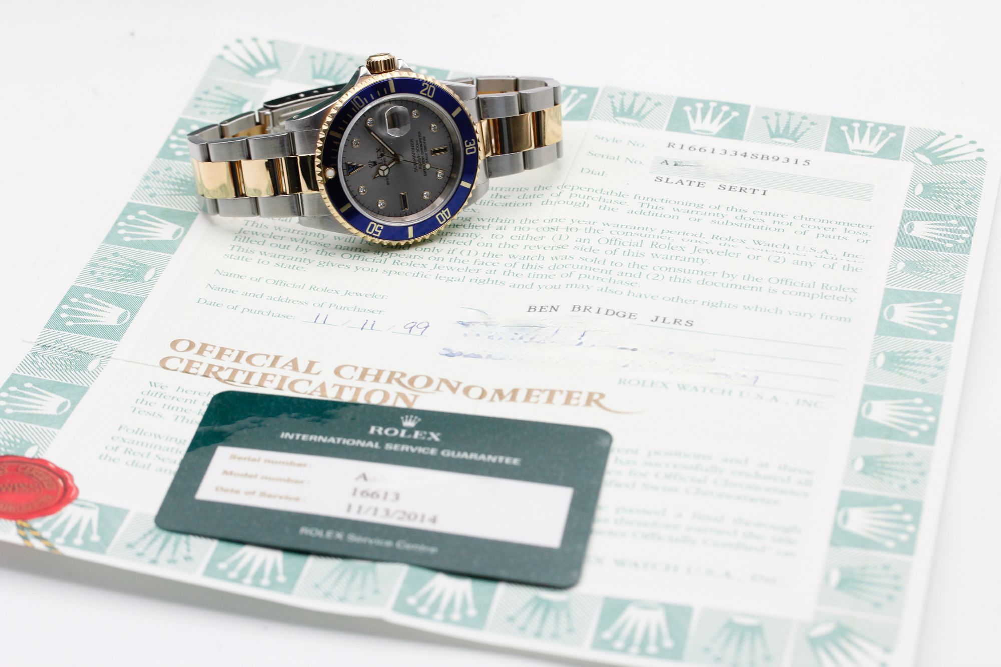 Brand: Rolex Model: Submariner Reference: 16613 Condition: Pre-Owned Grade: Excellent Case Size: 40mm Material: Stainless Steel / Yellow Gold Dial: Silver Serti Bracelet Type: Oyster Movement: Automatic Serial: A Age: Modern Box: Yes Papers: Yes Additional Notes: Certificate Dated - November 1999 - RSC Card Dated November 2014