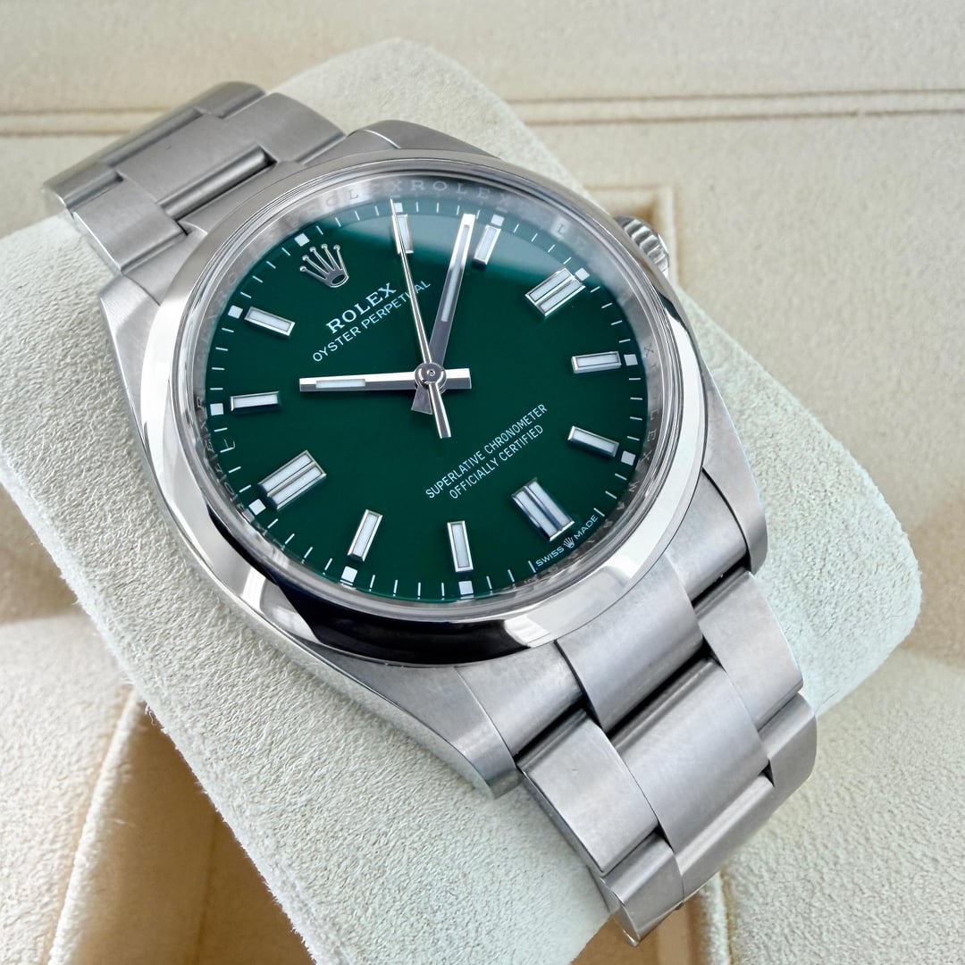 Available for sale is an exquisite Rolex Oyster Perpetual featuring a captivating green dial.