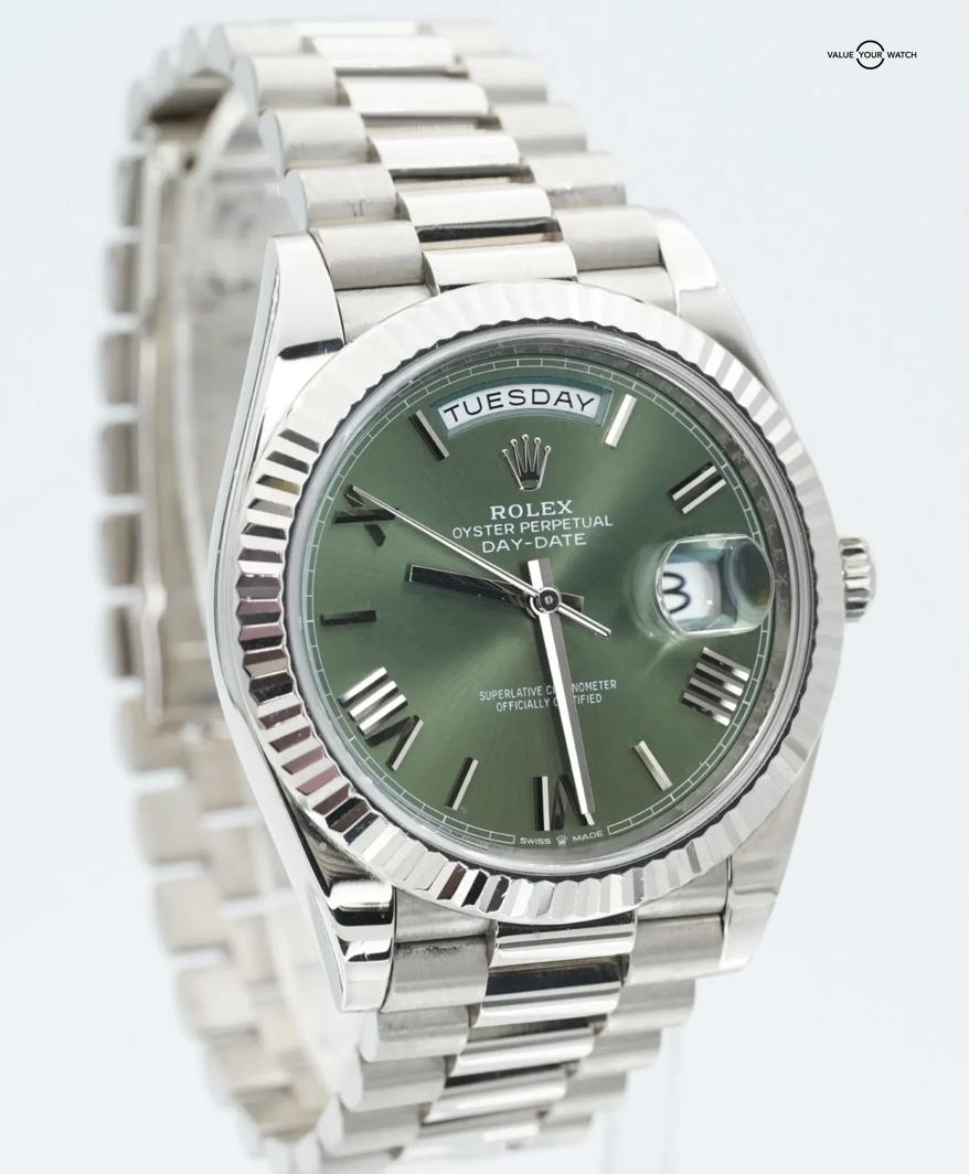 Rolex Day-Date President 228239 40mm OLIVE dial 18K White Gold Box/Papers!