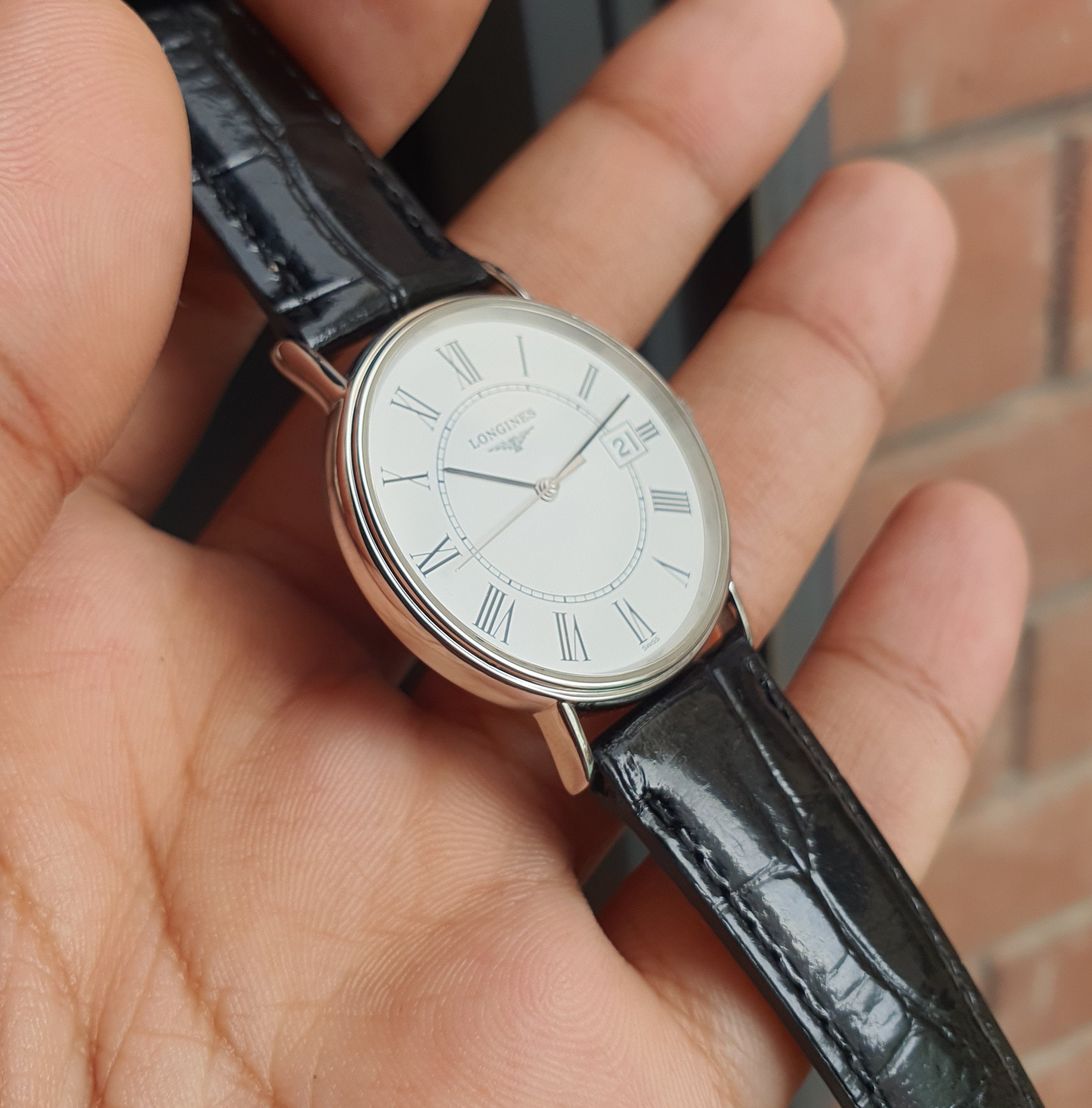 This is an ultra thin Longines Presence La Grande Classique watch in good condition. White sunburst dial with roman numerals, makes the dial pop. Sharp straight numerals indices with no lume, a true dress watch piece. Tastefully done symmetrical date window. Slim robust case. Superior build quality. Good time keeping. Signed crown. Comes with a black unsigned leather strap, signed buckle. One of the most classic watch from the brand. Looks amazing under sunlight, pictures really don't do justice. Handling it, I can definitely guarantee this is superior to modern watches of the same price zone. Great everyday use watch.