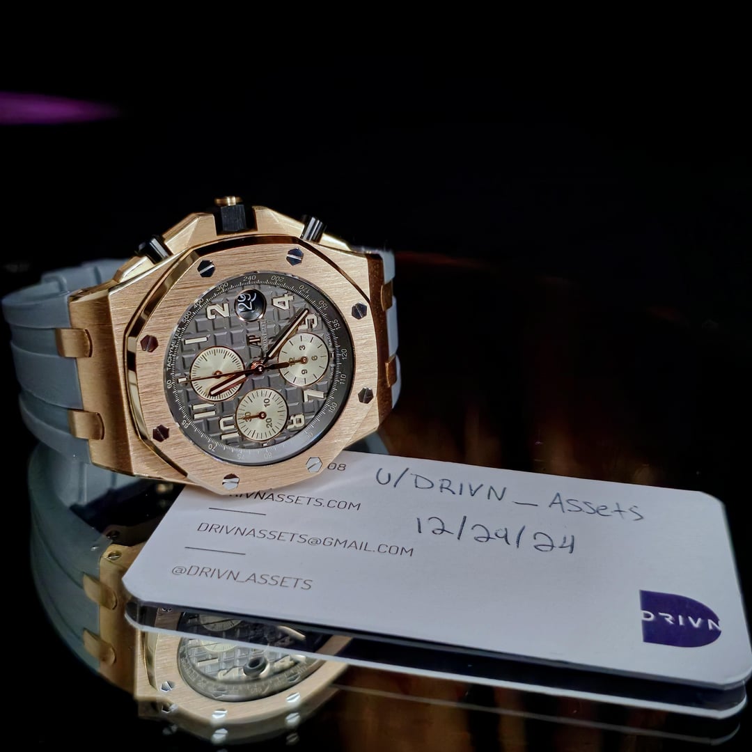 The AP Royal Oak Offshore Half-brick Rhodium is an elegant and commanding watch. The gold trimmed rhodium “Mega Tapisserie” dial provides a refined alternative to traditional gold styles, seamlessly complementing any attire. The 18k rose gold case & bezel subtly catches the eye from afar and impresses with intricate detail up close. ◇ Price: **$37,500** Condition: **Mint** Contents: **Complete set** (boxes, card, & booklets) Ref #: **26470OR.OO.A125CR.01** ◇ 🌎 St. Petersburg, FL. 🛩 Fully insured priority overnight via FedEx. 💰 Wire or cash payment, Crypto +2%. 💯% Authenticity & accuracy guarantee. 🤝 Many references available. ♻️ Trades are considered. ◇ I aim for clear communication with honest and fair deals every time. Video calls & face to face meets are welcomed.