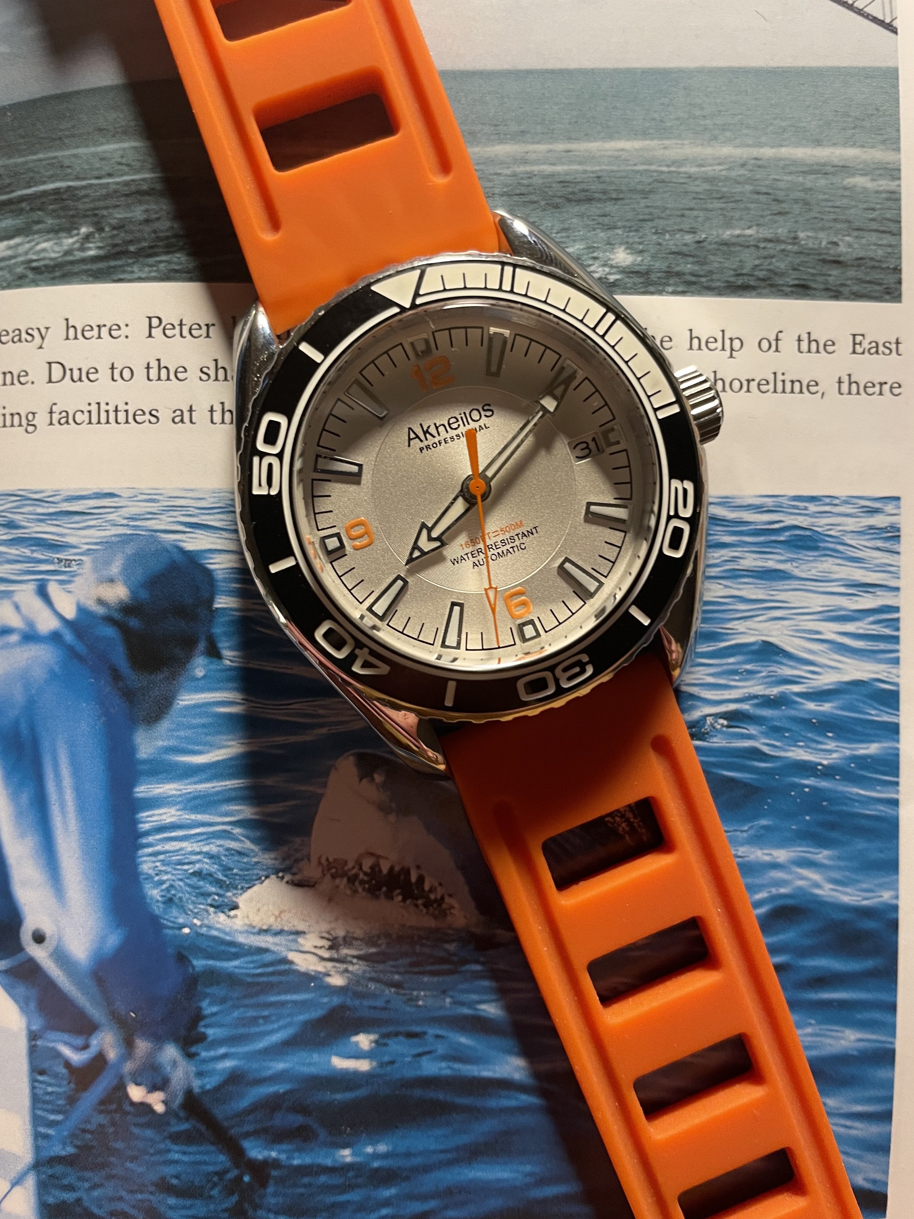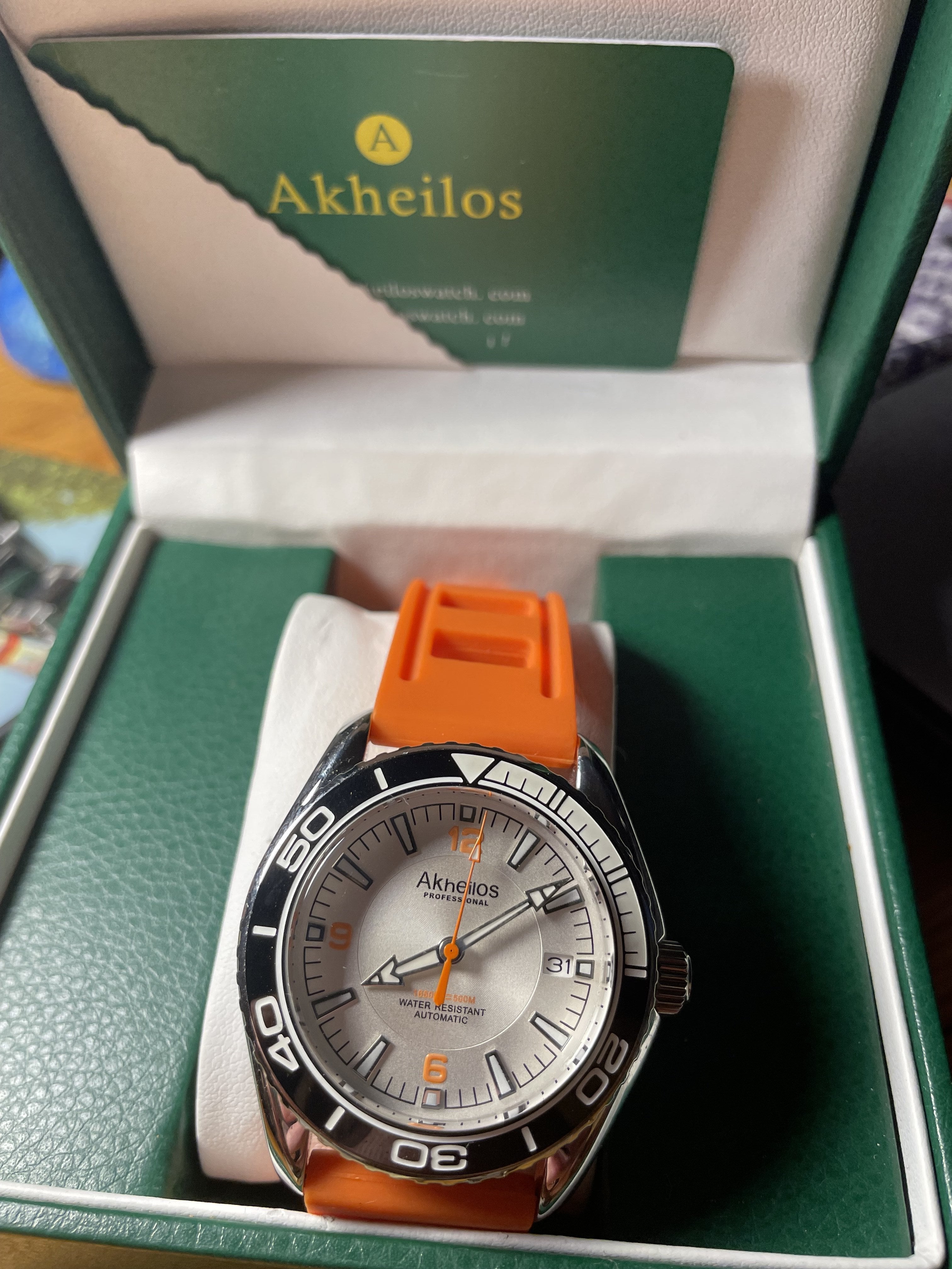 Asking 125 net for this Akheilos 500m dive watch. What does Akheilos mean well here you go. Akheilos (Modern Latin: Acheilus, Latin: ACHEILVS) was a demon of the sea from Greek mythology. This watch has 500m water resistance sapphire crystal NH35 lumed bezel and a helium escape valve. Comes on an orange iso style strap and a shark mesh strap. These sold new for 359 the decade size is 40mm lugs are 22mm