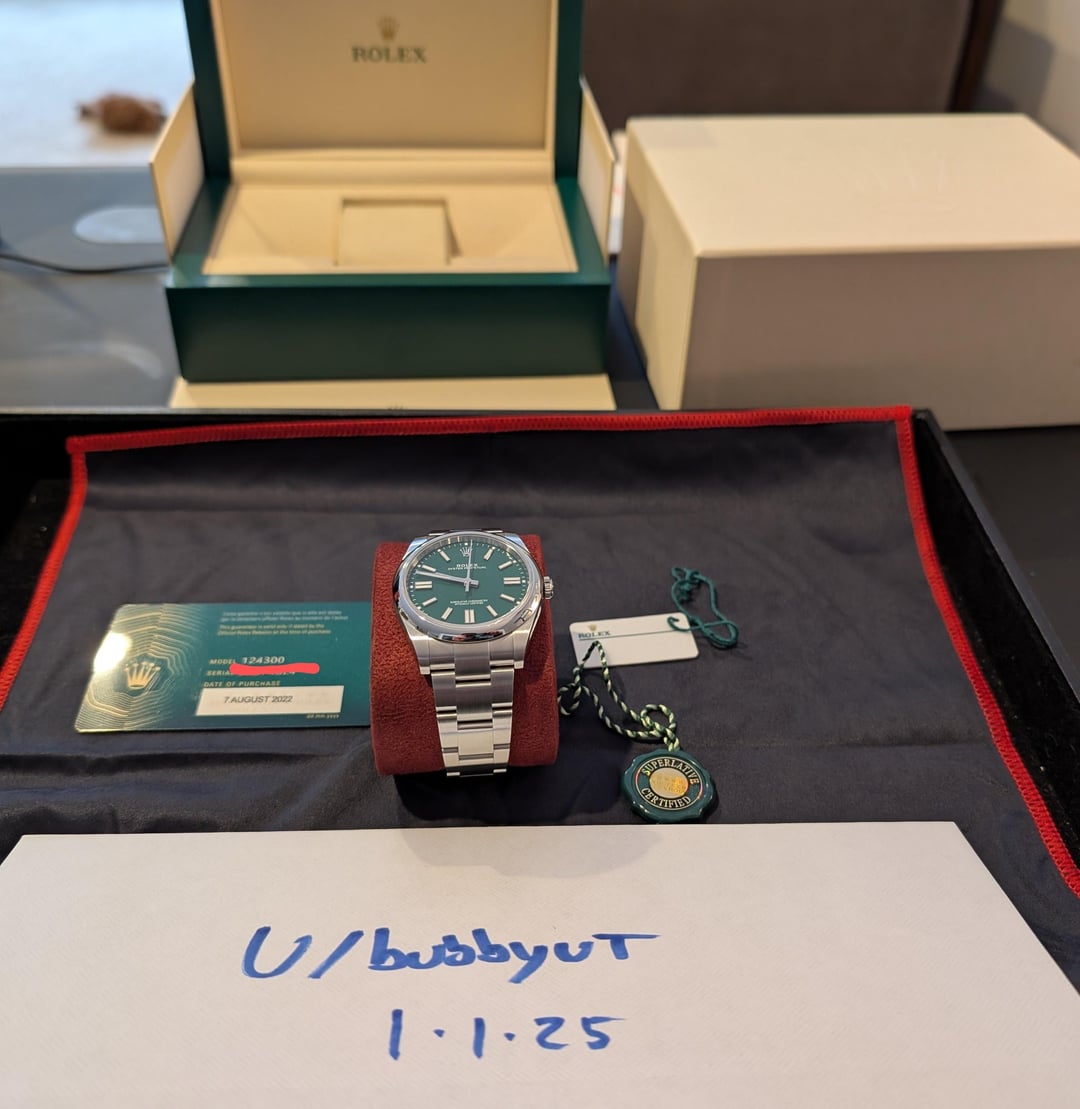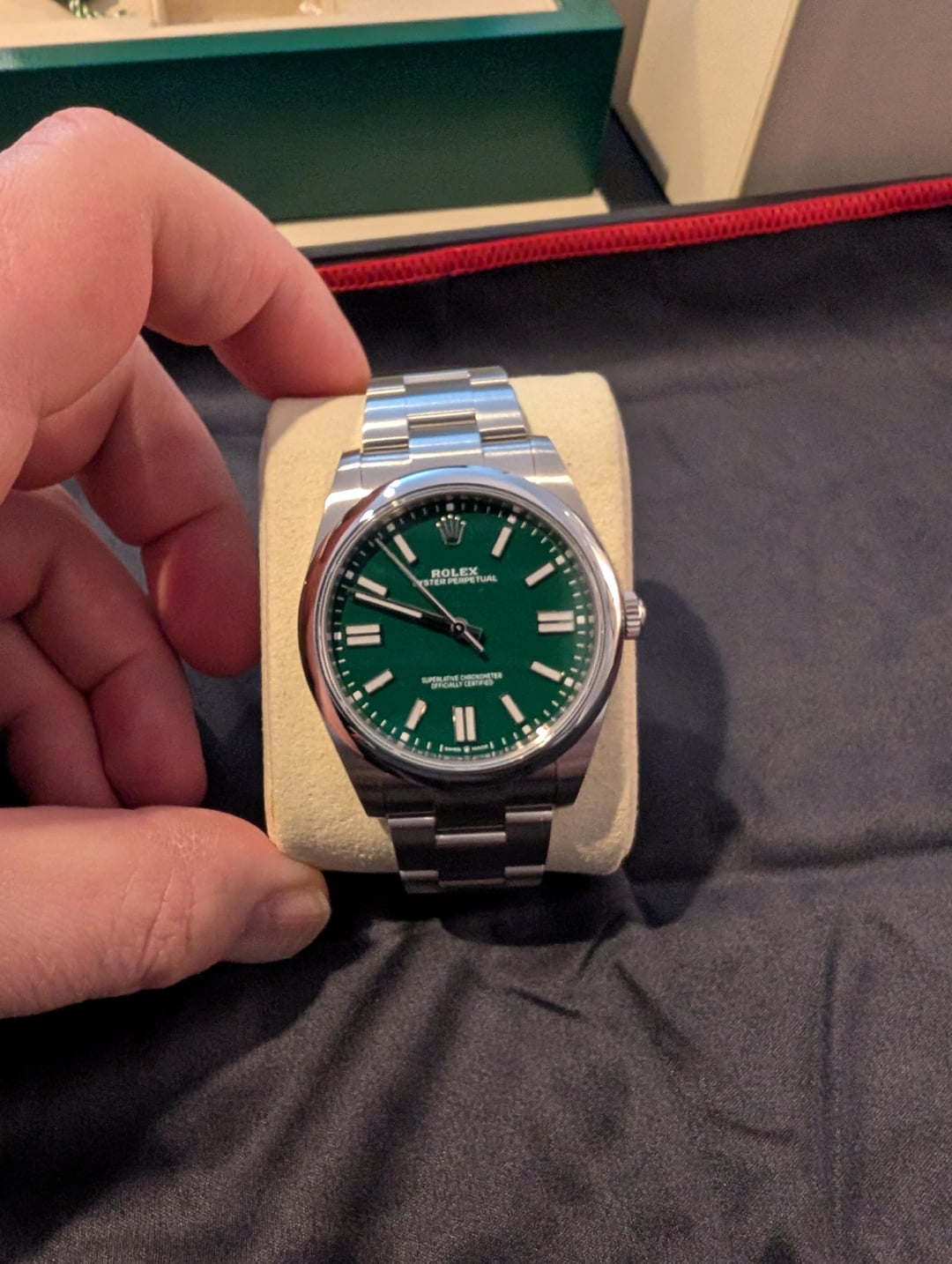Up for sale today is my LNIB Rolex OP41 Green dial. Completely full kit. 9.9/10 condition (watch has been sized but is blemish free as far as I can tell). Card dated 2022 so plenty of warranty remaining. Was a safe queen. Price: $8,650 + shipping Price is firm - please do not reach out unless you are ok with the price - cheapest by far for similar condition CONUS only - shipping from the west coast 30 perfect transactions here on reddit so buy with confidence!