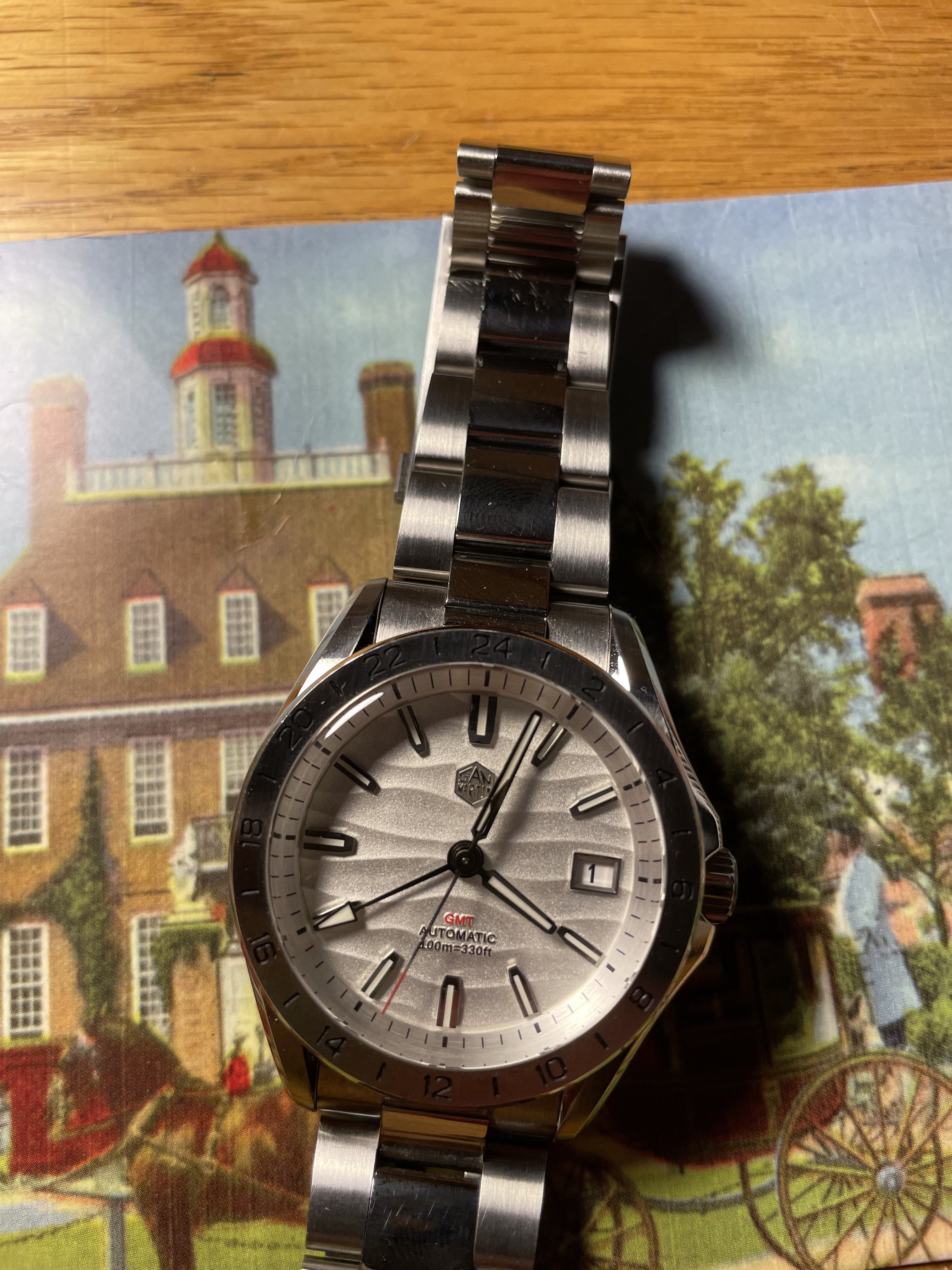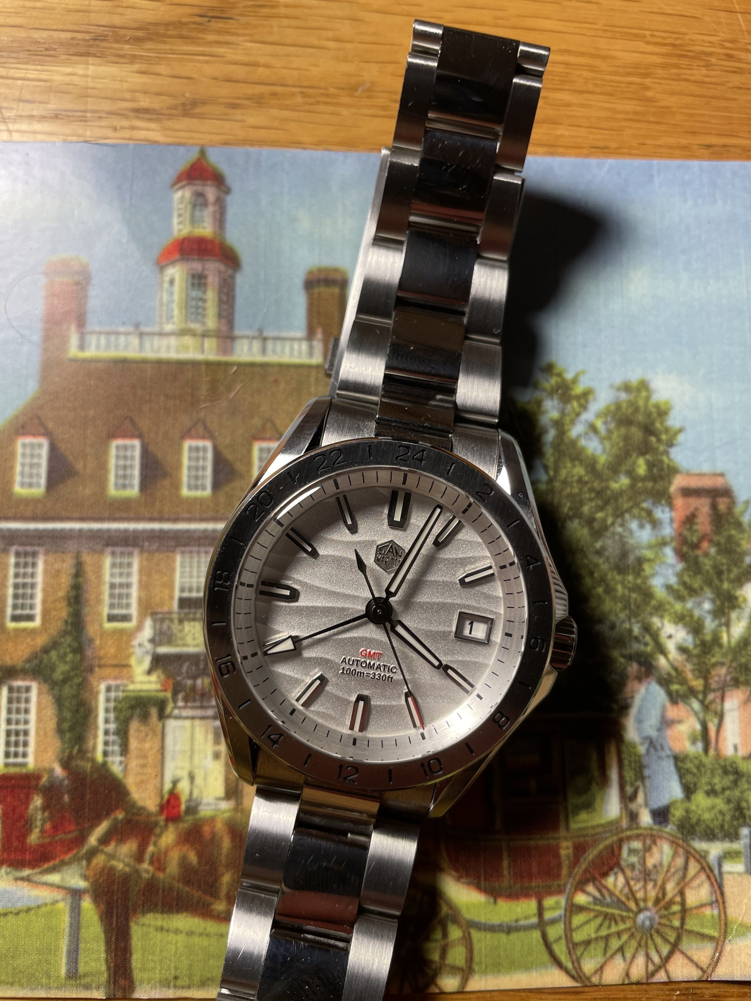 Asking 135 net for this San Martin GMT Jody of just one lore watch called it the best finished watch under 300usd. It has a sapphire crystal NH34 BGW9 lume and an on the fly adjustable clasp. Comes with case and extra links sized for a 7.5 inch wrist. This is the cheapest one out there grab it while you can.