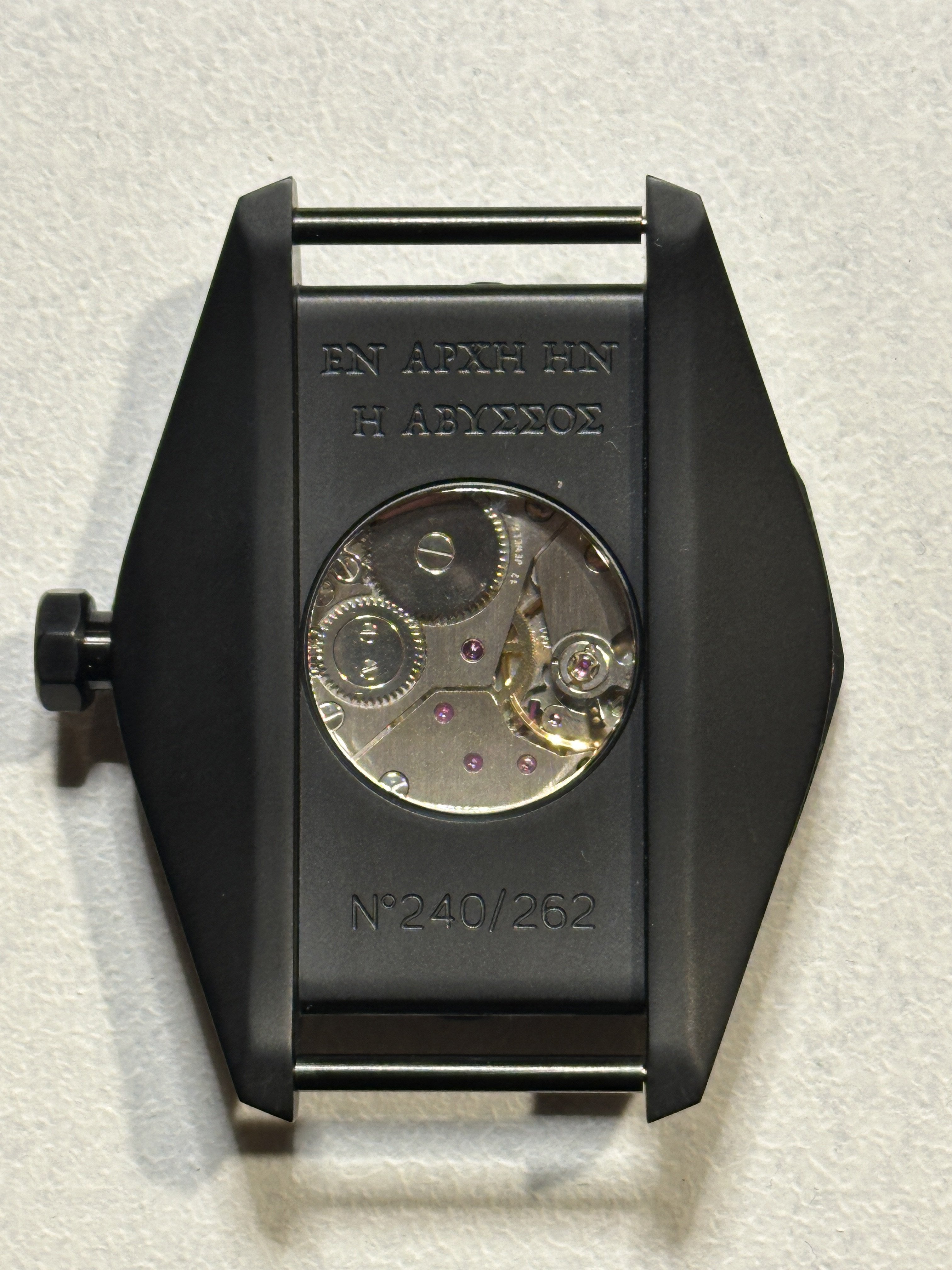 Inscription on the case back of each watch with the phrase “ΕΝ ΑΡΧΗ ΗΝ Η ΑΒΥΣΣΟΣ” meaning “IN THE BEGINNING [THERE] WAS THE ABYSS” in ancient Greek (from the original campaign batch)