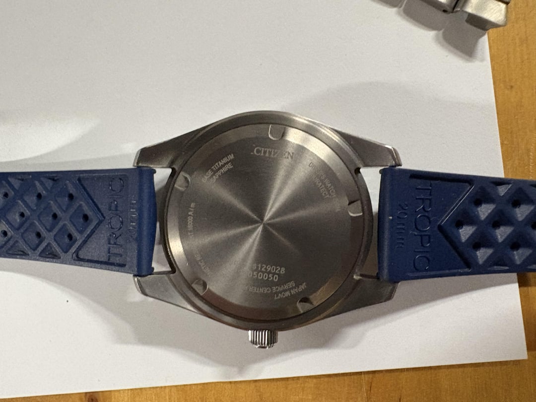 Hello! I am selling my navy blue Citizen challenge diver. This has box & papers, and I am including a genuine tropic strap. The watch came on a titanium bracelet, included. The watch is running well and in excellent shape. I’m asking $400 OBO, no trades. Thanks!