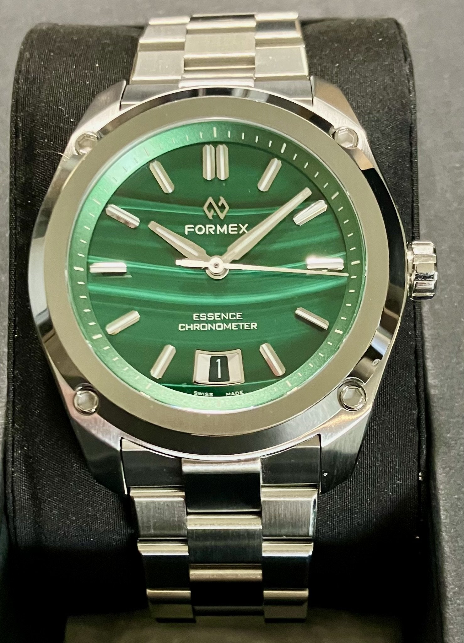 Thinning the herd. The first to be offered is my Formex Essence 39 Malachite on bracelet. This piece is not only one of the most beautiful watches in its price bracket, but also one of the best values. Formex is known for producing pieces with fit and finish on par with brands costing more than twice much.