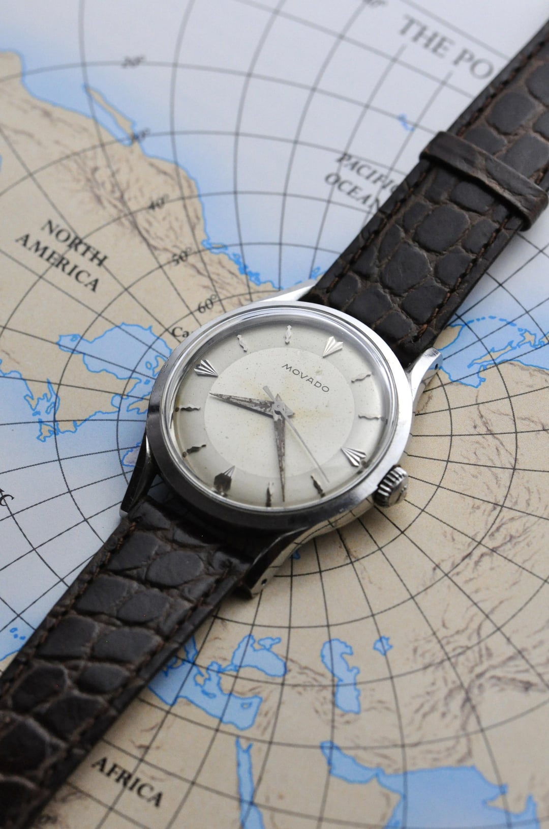 1950's Movado Watch (ref. 18241) This beauty is over 70 years old. It features a 35mm Stainless Steel "Francois Borgel" Case (FB was a famous case maker for the likes of Patek Philippe). The well known Movado hand logo is seen on the original crown. The Case houses a Manual winding movement by Movado. It Sets, Winds and runs properly. Timekeeping data and service history is unknown. The Case shows minor scratches and marks throughout, consistent with its age. There is patina and light oxidisation evident on the dial and hands. It is accompanied with a dark brown vintage leather strap with stainless steel buckle. The watch was acquired from the Blackshaw family. It is believed to have been owned by an Australian WW2 Fighter Pilot. You will notice the engraving on the caseback with the last letter B assumed to be for the last name "Blackshaw". **Quick Specs:** • Brand: Movado • Reference: 18241 • Case Number: 3171456 • Year: 1950's • Material: Stainless Steel • Dimensions: 35mm (without crown) • Crystal: Plexiglass (New) • Movement: Swiss, Manual, Movado • Crown: Original Movado 'Hand' • Strap: Vintage brown leather strap with stainless steel buckle • Lug width: 18mm • Box & Papers: No, Watch Only **Condition/Things to Note:** • Watch is over 70 years old. The Case & Bracelet is in well loved condition with scratches and marks also visible on the case back. • Dial exhibits patina with Oxidisation evident aswell as on hands. • Crystal is New. Just been replaced. • Running, winding and setting as it should. Last service unknown. • Avoid Water exposure, as with all vintage watches If you have any questions, please PM me **Photo Album:** https://imgur.com/a/Y5j6CkO **Timestamp:** https://imgur.com/a/ZLov5fr **Price:** $550 USD Shipped Worldwide **Shipping:** Express (Fully Insured) **Watch Location:** Sydney, Australia (Local Pickup or Drop-off can be arranged) **Payment method:** Wise (Formerly Transfer wise) low fees.