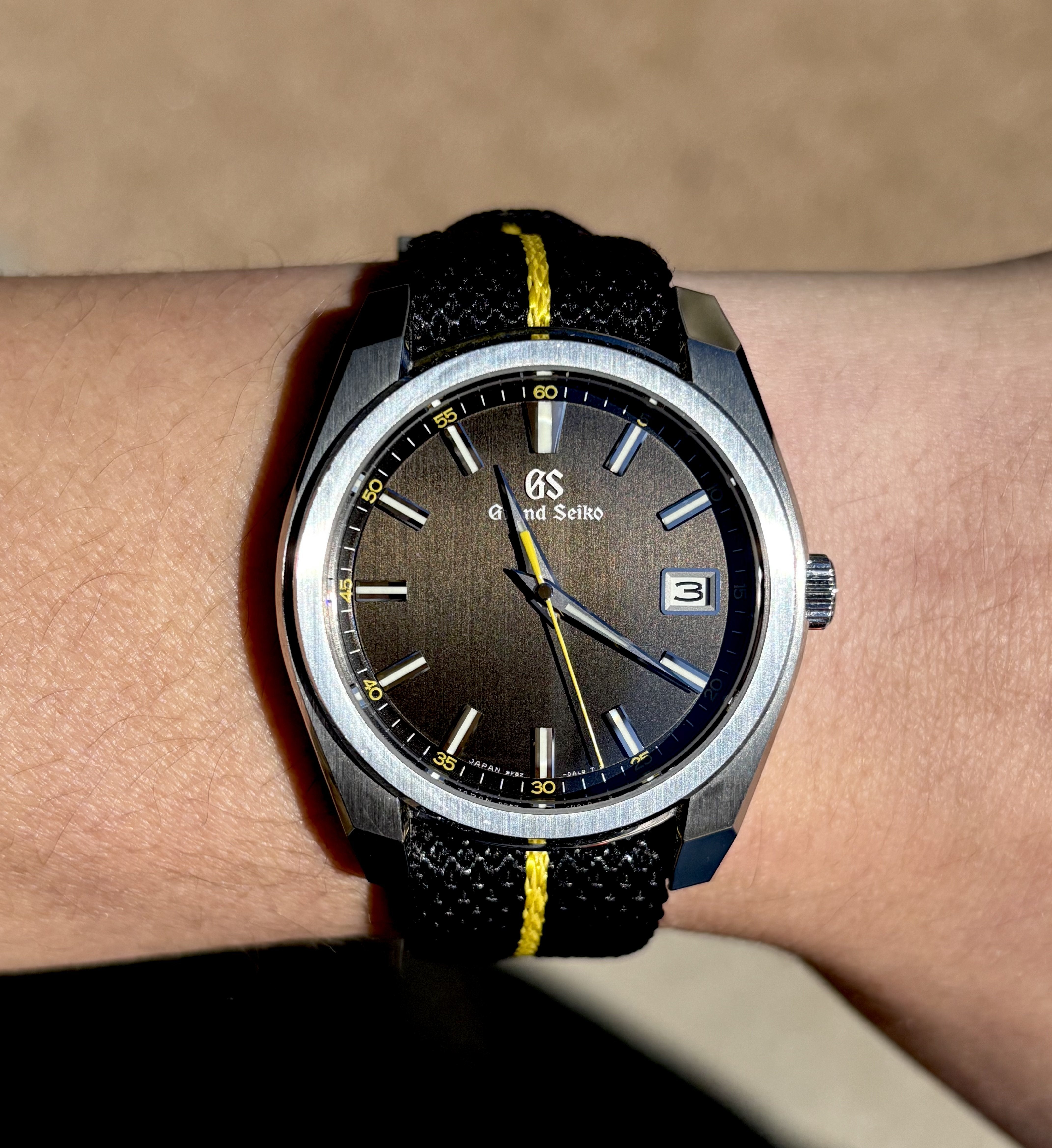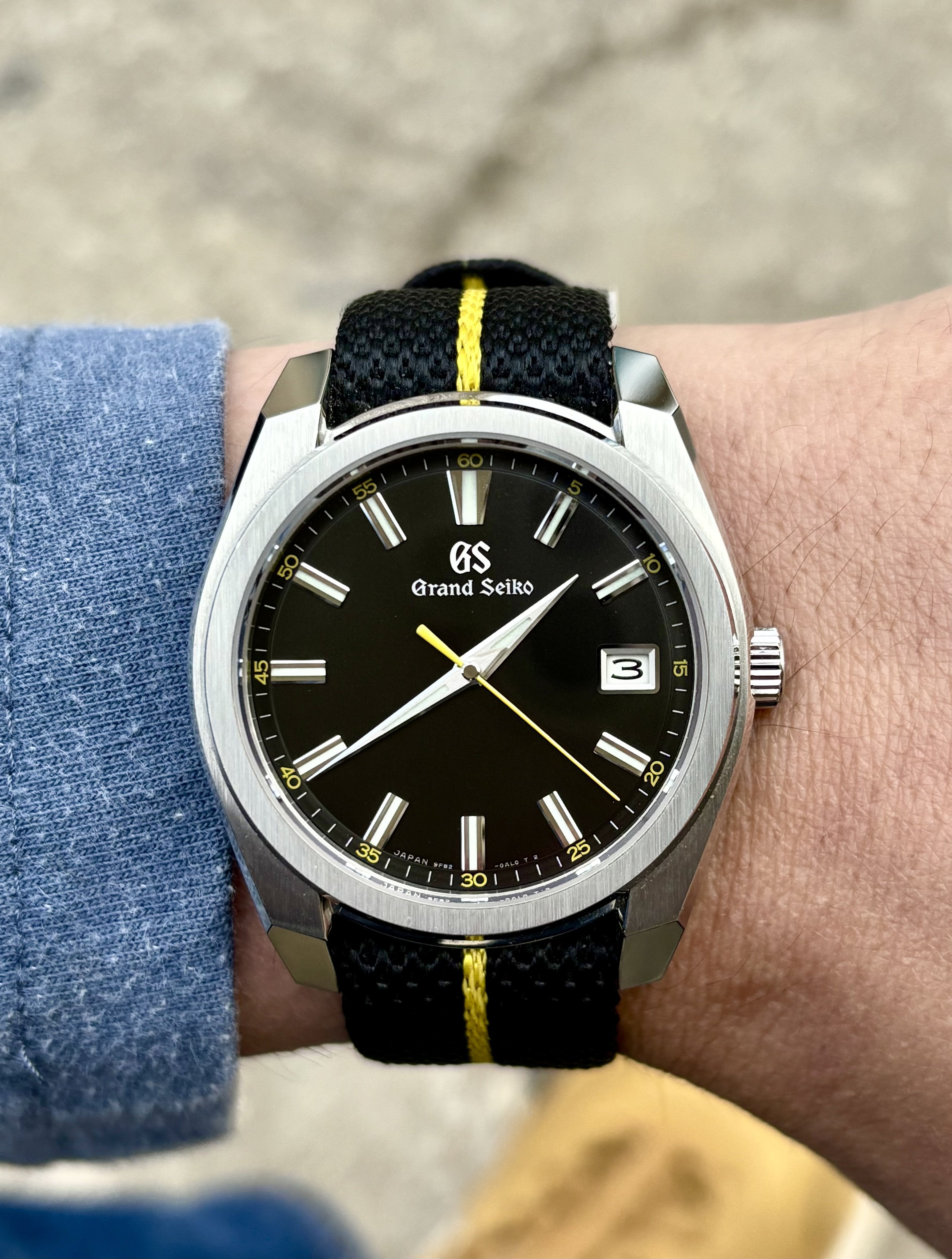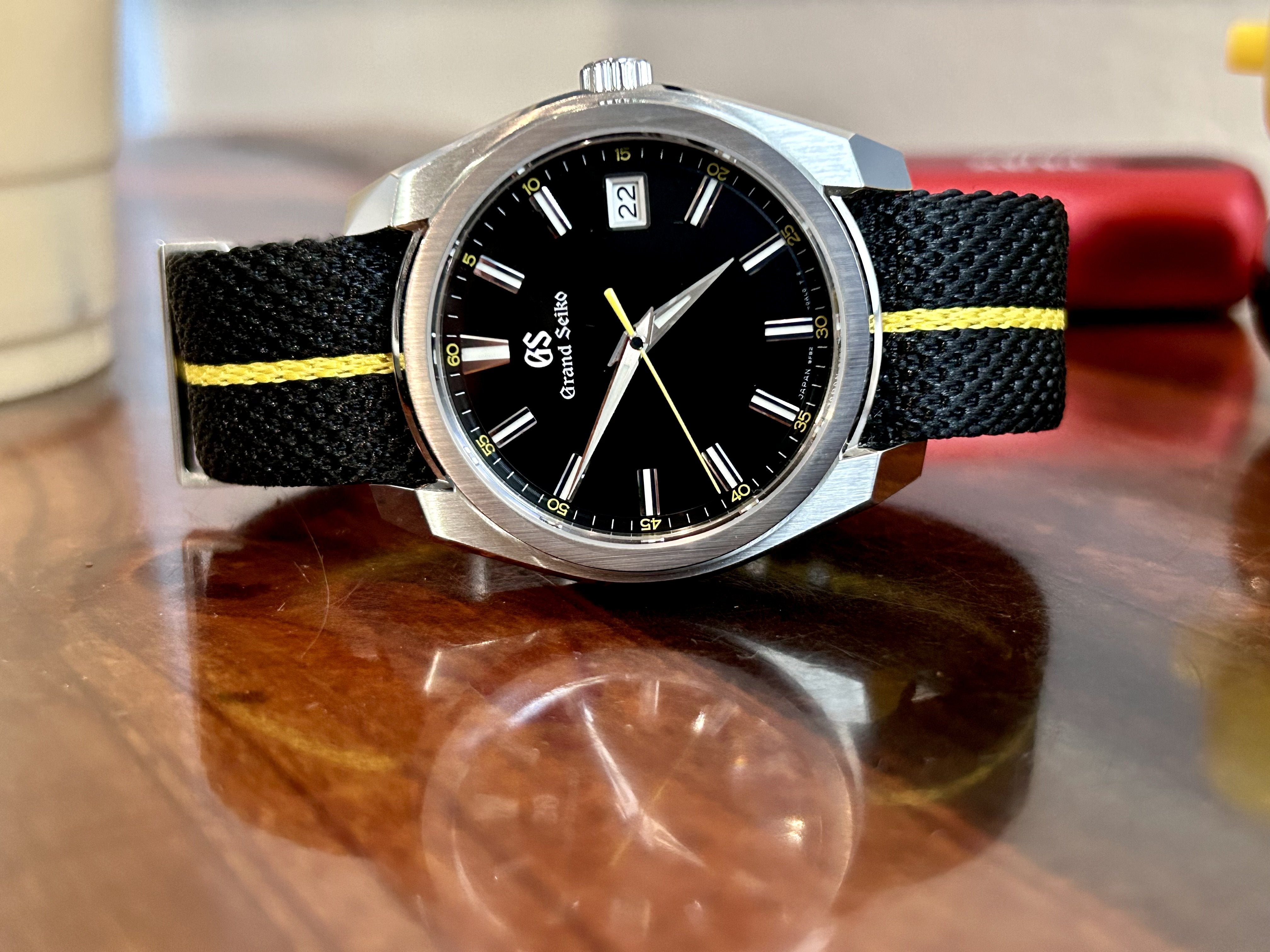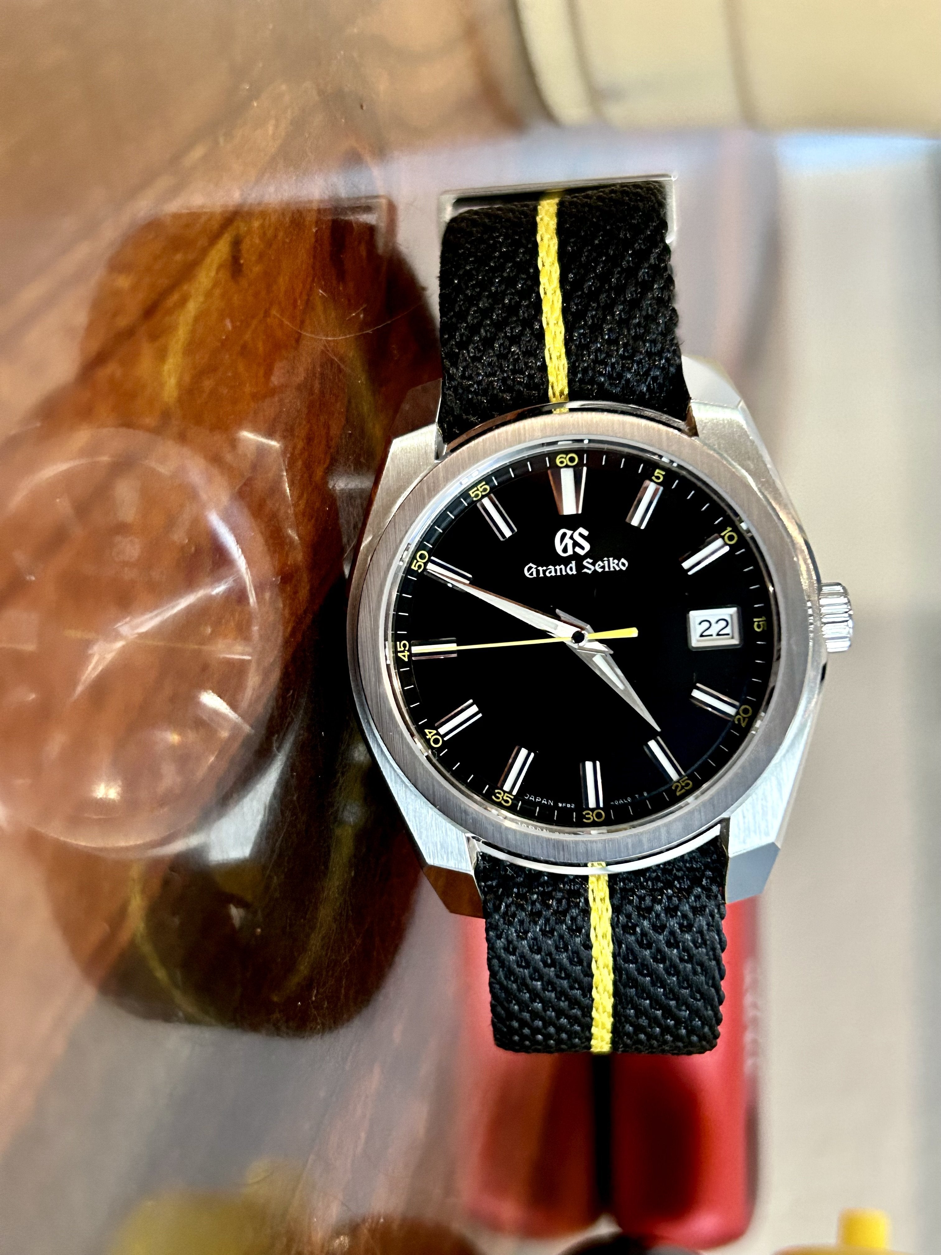 Listing another one that I am reluctant to sell. I am committed to trying to downsize. Watch is in fantastic shape! I bought this in May, 2024 and have worn it sparingly. I have the original GS strap and will include the pictured Chevron single-pass strap as well, as I believe it complements the watch perfectly.