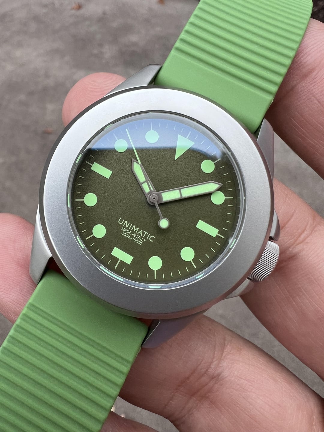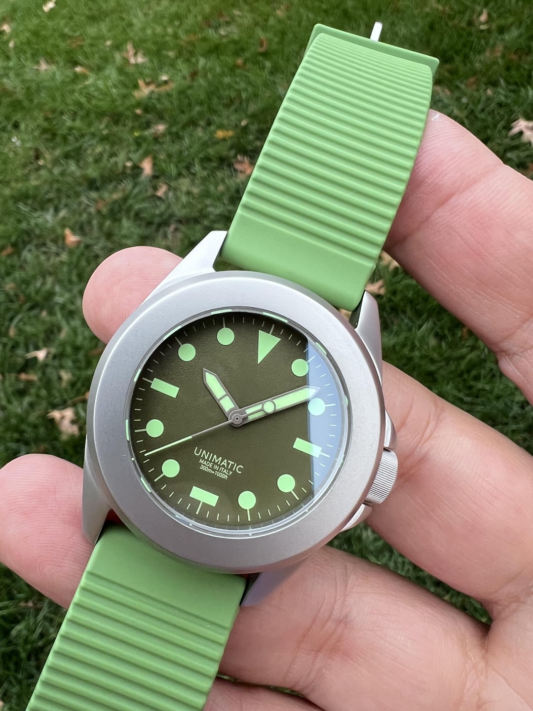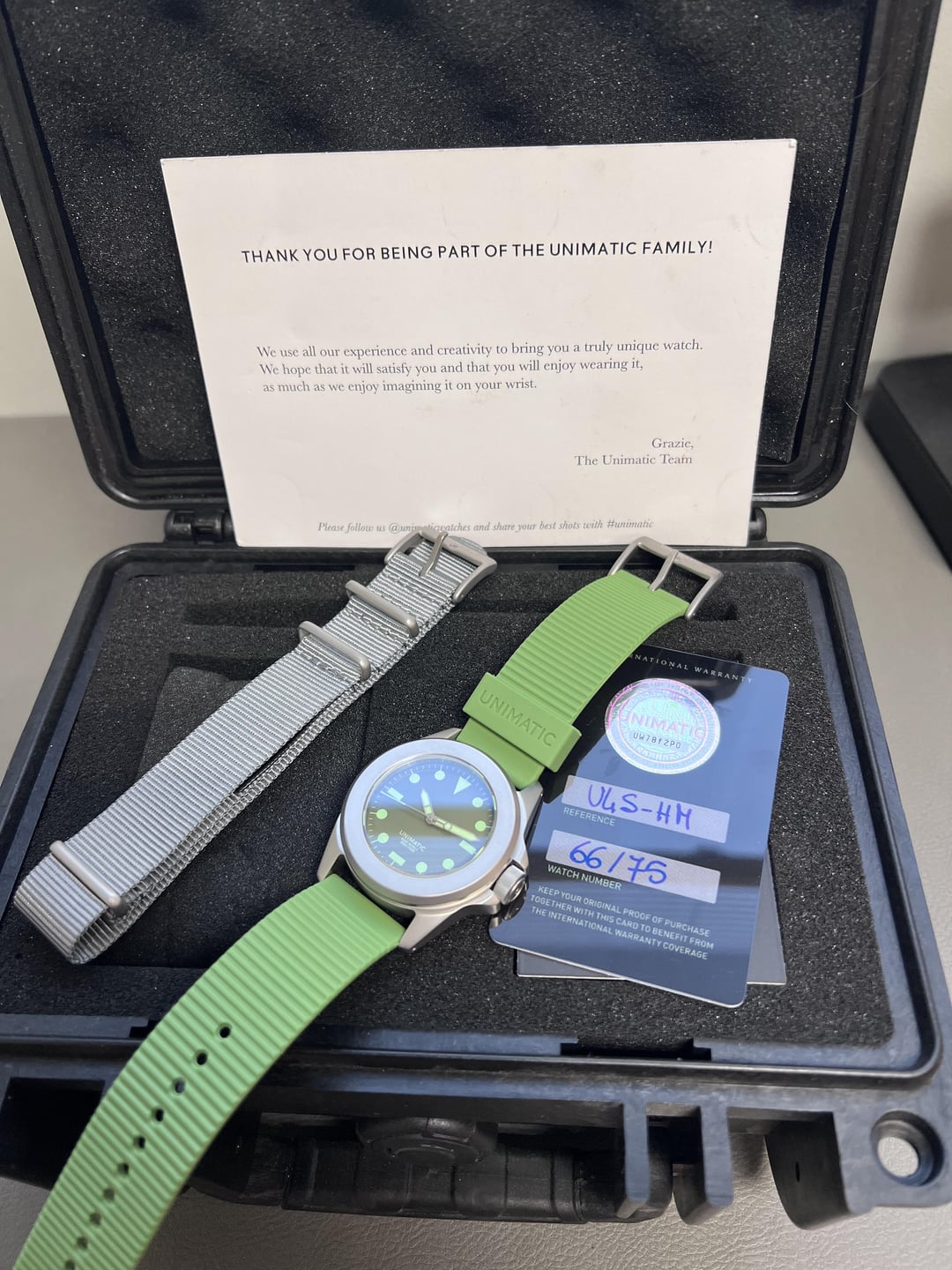 Hey Watchexchange! **Reposting after buyer flaked.** Up for grabs is my awesome collaboration between Unimatic and outdoor lifestyle brand Huckberry. This U4S is a nature inspired “field” watch with a diver rating. It’s one of 75 made in this moss green colorway that takes cues from the Redwood forest. The sandblasted steel case and SW200-1 movement make it tough as nails. **Condition:** Excellent condition. I couldn’t spot a mark on it. Keeping great time. **Scope of delivery:** Comes with warranty card, branded NATO and rubber straps, and Unimatic branded Pelican style 2 watch case. **Specs:** Reference number: U4S-HM Case size: 40mm Lug-to-lug: 49mm Case thickness: 12.4mm Water resistance: 300m **Price:** $699 shipped CONUS **Methods of payment:** Zelle is preferred. **Trades:** Not at this time. **References:** Hundreds of successful transactions in watch trading. See my eBay account under the same name. Many references in Facebook groups, watch forums, and on WUS. **Timestamp:** https://imgur.com/a/1pKR5JX **Photo album:** https://imgur.com/a/LA6HuON