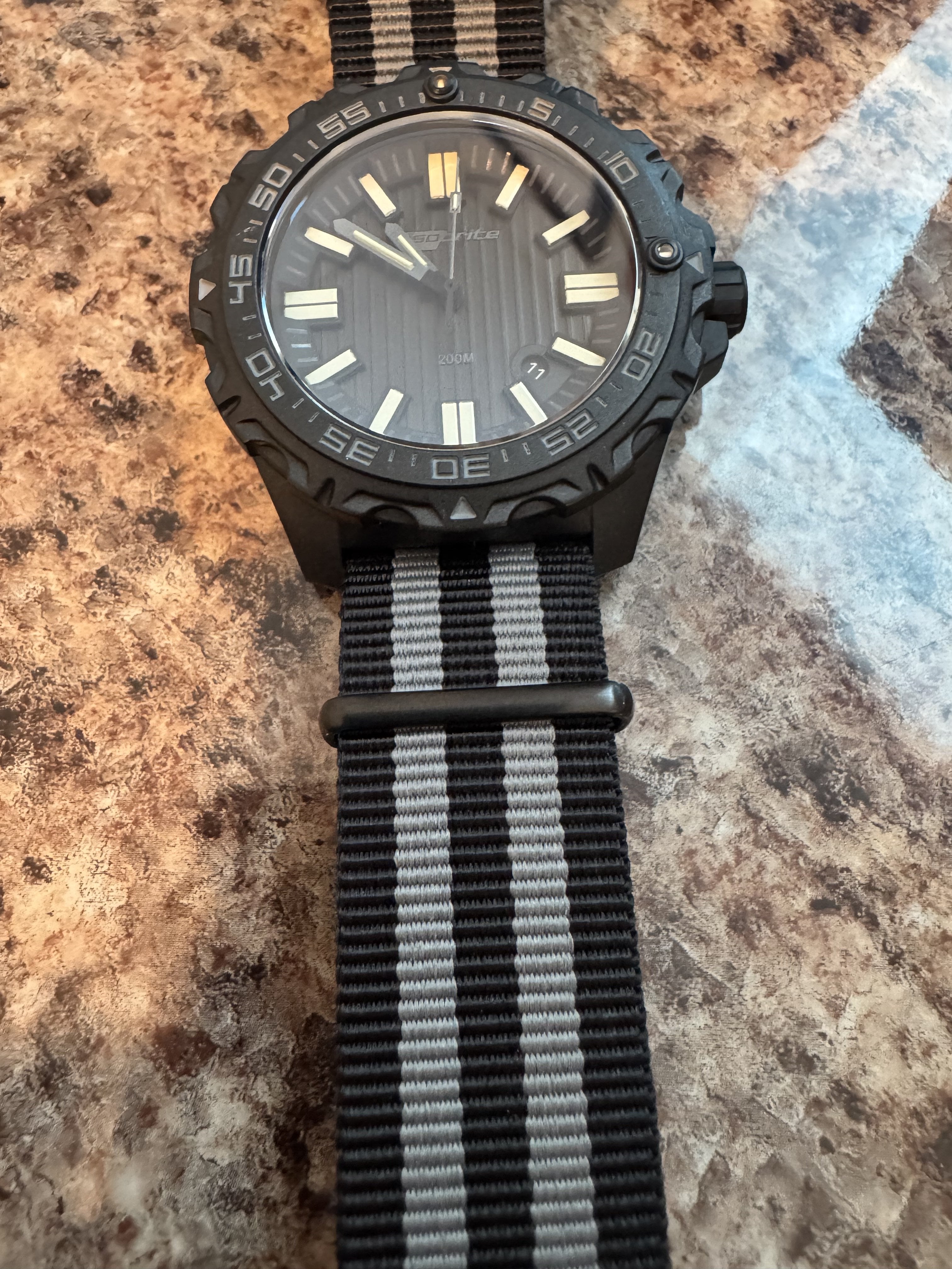 Here is my Isobrite Afterburner with t-100 tritium tubes on oem grey and black nato as it came direct from them. No box or papers. Watch is super light as it is a carbon composite case, sapphire crystal, 200 meter water resist. Amazing condition as it was only worn on rare occasion.