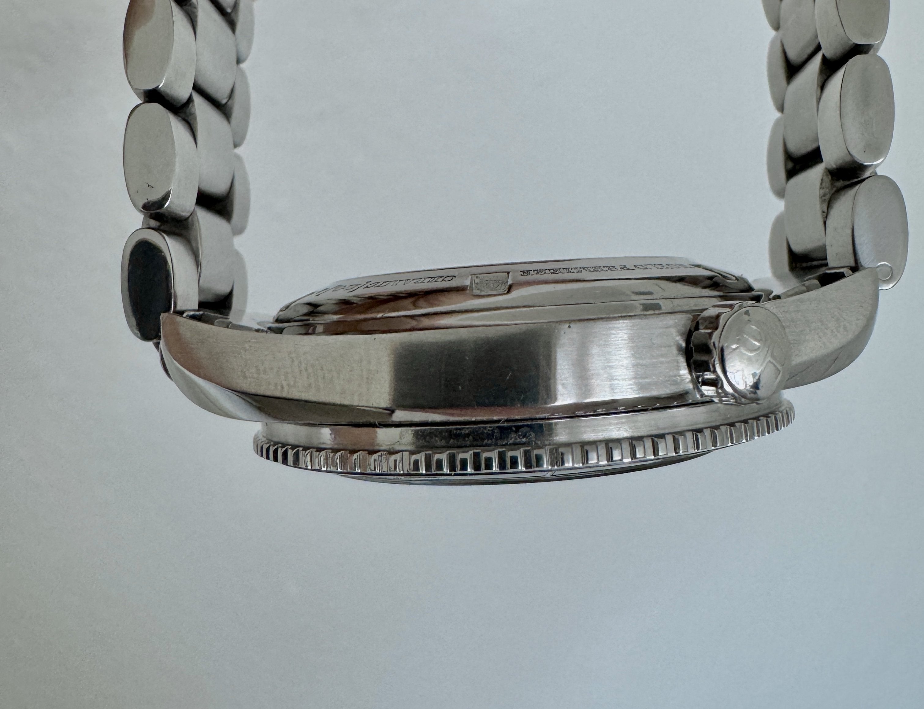 One thing to know - the bezel insert was replaced by previous owner with non-original one. It is ceramic, looks very sharp and fits perfectly but it has slightly different color than original (white and less dull than original metal gray numerals and minute marks) and the lume pip is green not blue. The bezel itself is original.