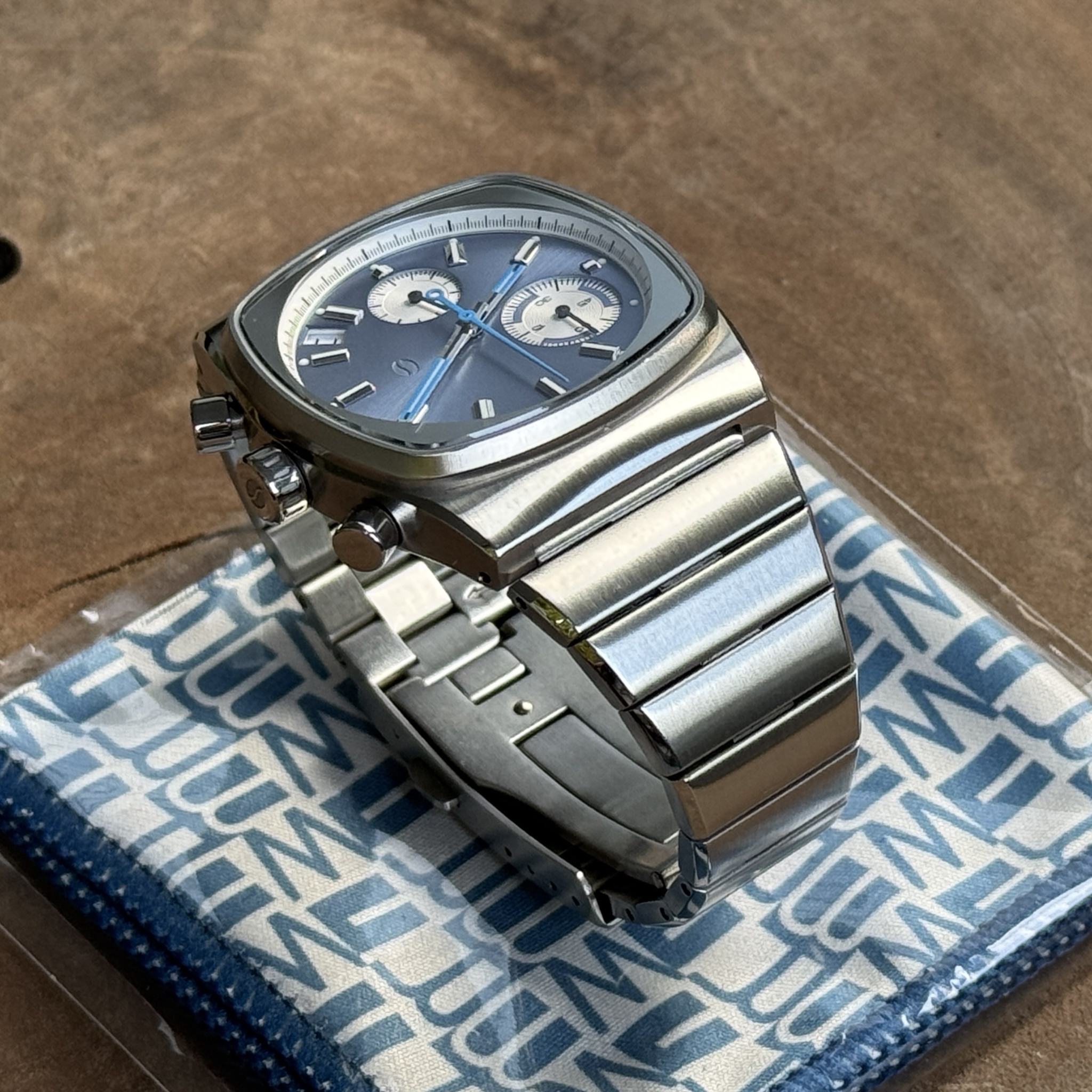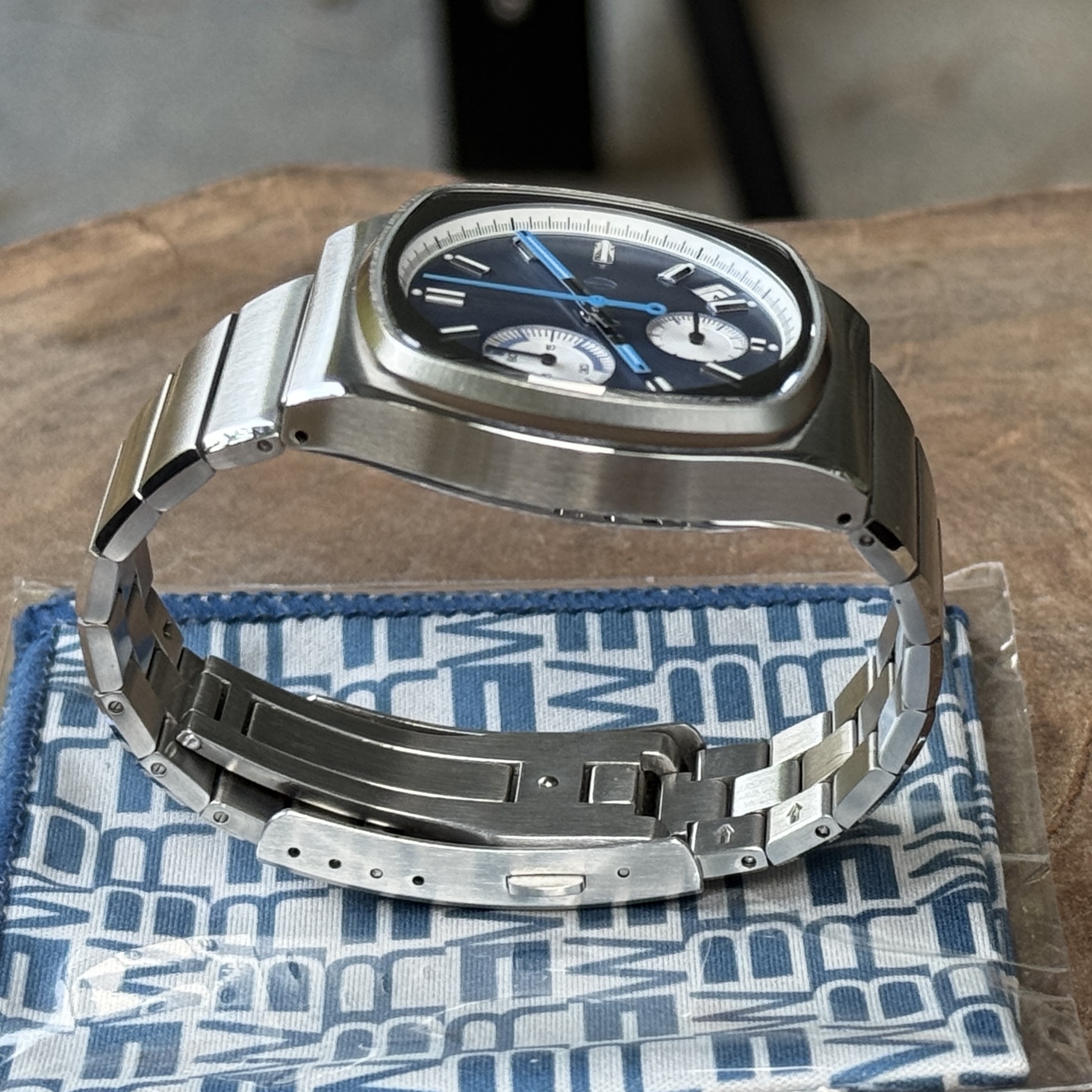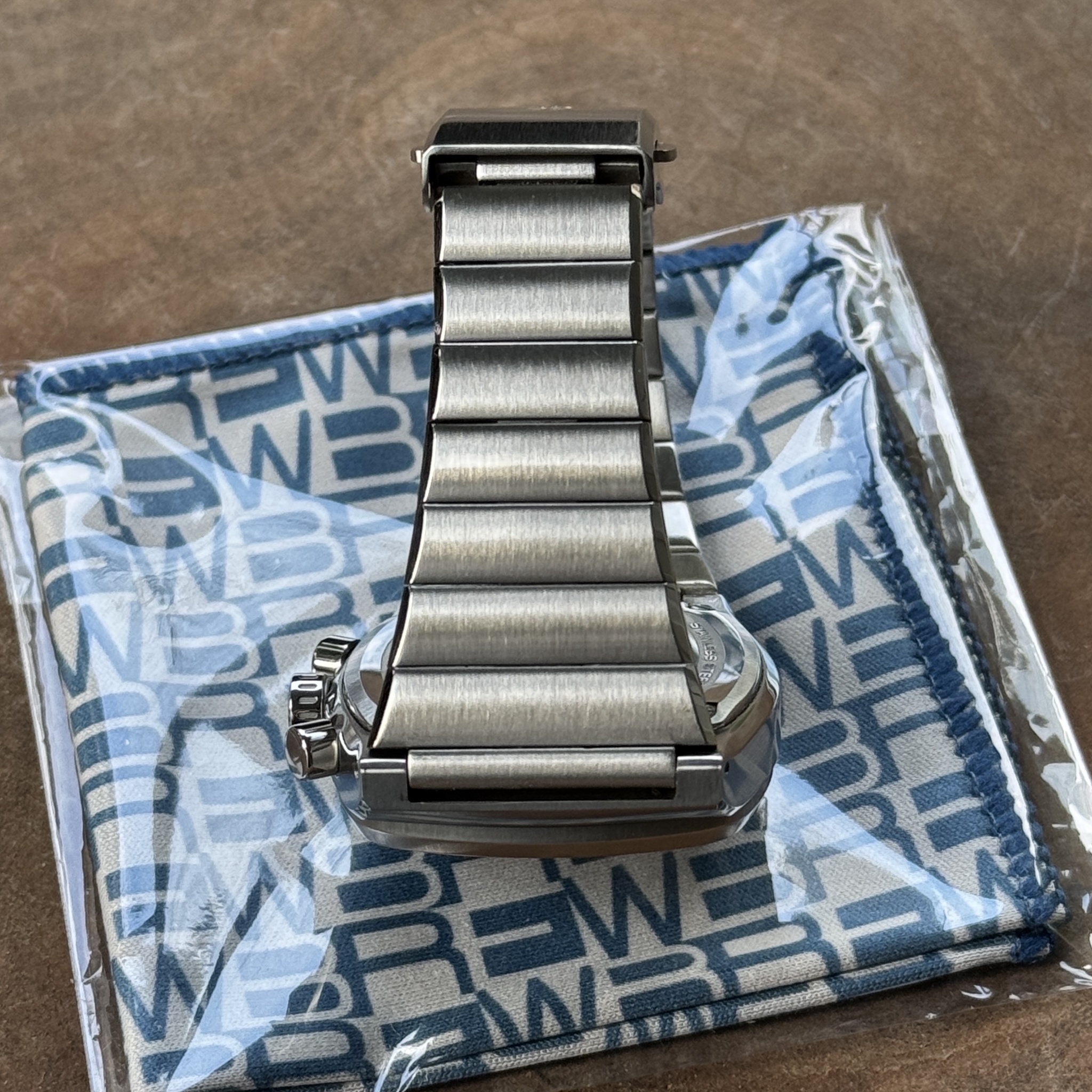 For sale is my 36mm Brew Metric meca-quartz chronograph with light blue sunburst dial. This iteration was a limited production run in early 2022 and has not been made since. Also includes drilled lugs which current models have lost. Watch comes with extra links, its original box, and unused Brew microfiber cloth.