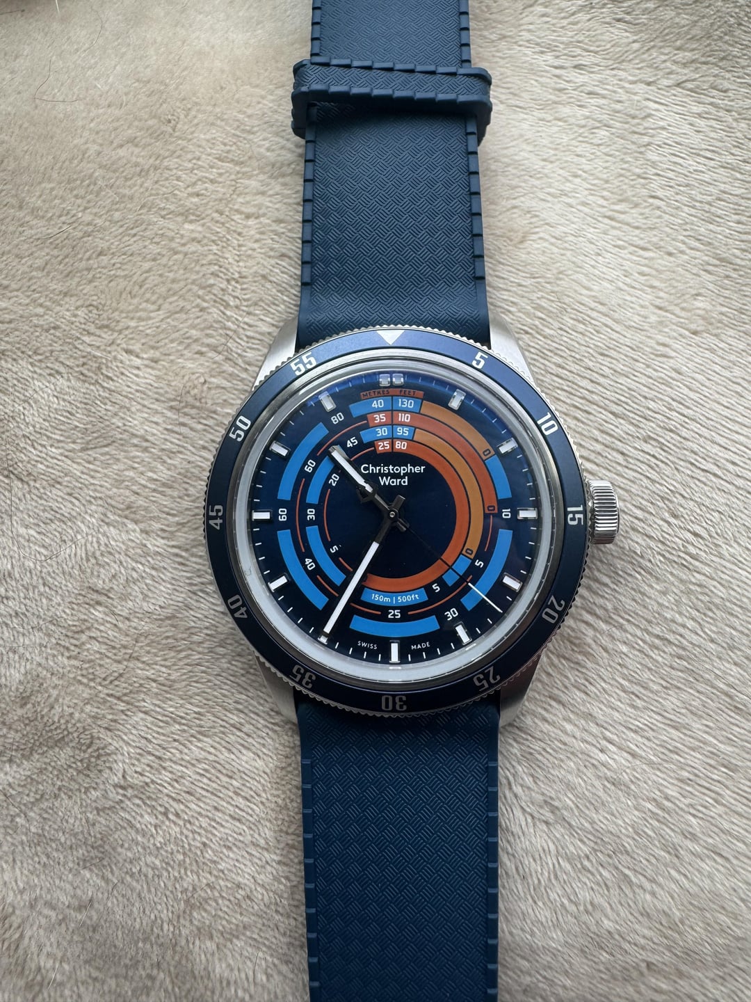 Hello all, this will be my very first sell here on r/watchexchange, but I’ve been using Reddit for over 10 years and have been an active, honest, and helpful member in other subreddit communities. Today, I am offering my Christopher Ward C65 Divetimer Special Edition 2021. Only 150 were ever made, and its dial serves as the predecessor to the Christopher Ward C65 Super Compressor Elite, except it wears much more elegantly on the wrist. **Price**: I am pricing this to sell at $800 via PayPal, Zelle, or Venmo (currently, the lowest asking price on eBay is $1,276.47) **Condition**: I would categorize its condition as unpolished and excellent, with no visible dents, nicks, or hairline scratches present on the crystal or case. **Items included**: Full set as shown in the timestamp image (CW box, warranty card, owner’s handbook, cleaning cloth, original tag that has been disconnected from watch, original protective film still on case back) **Technical Specifications:** In my opinion, these are one of the watch’s greatest strengths. With a slim profile and relatively small lug-to-lug, it will fit well on a wide variety of wrists. * Case: Stainless Steel * Diameter: 41.0mm * Height: 11.55mm * Lug-to-Lug: 47.1mm * Lug Width: 22mm * Movement: Sellita SW210 * Power Reserve: 42hr * Water resistance: 150m * Strap: Rubber, Blue **Shipping:** Free for CONUS Timestamp: [https://imgur.com/a/0J6UgbV](https://imgur.com/a/0J6UgbV)
