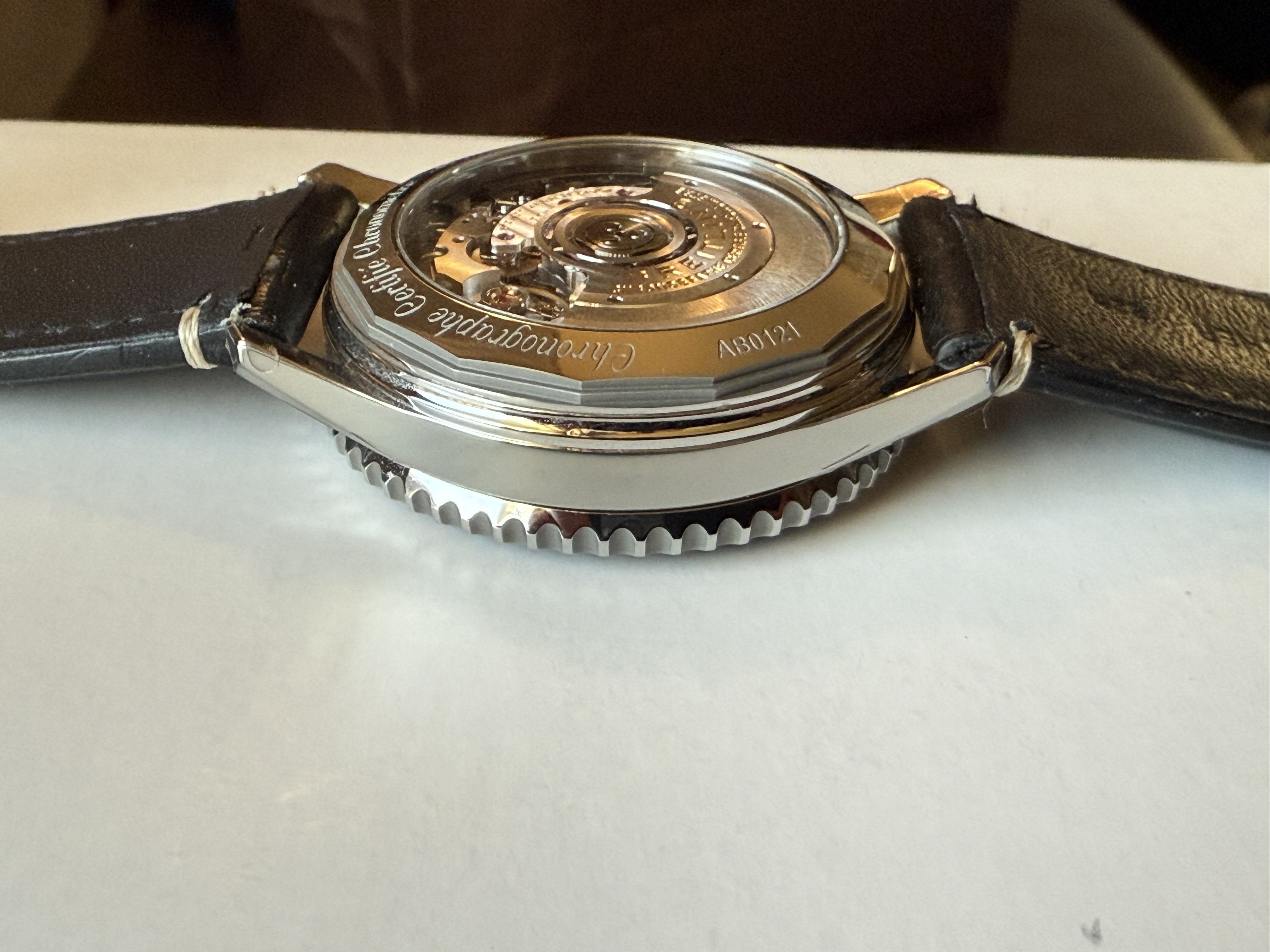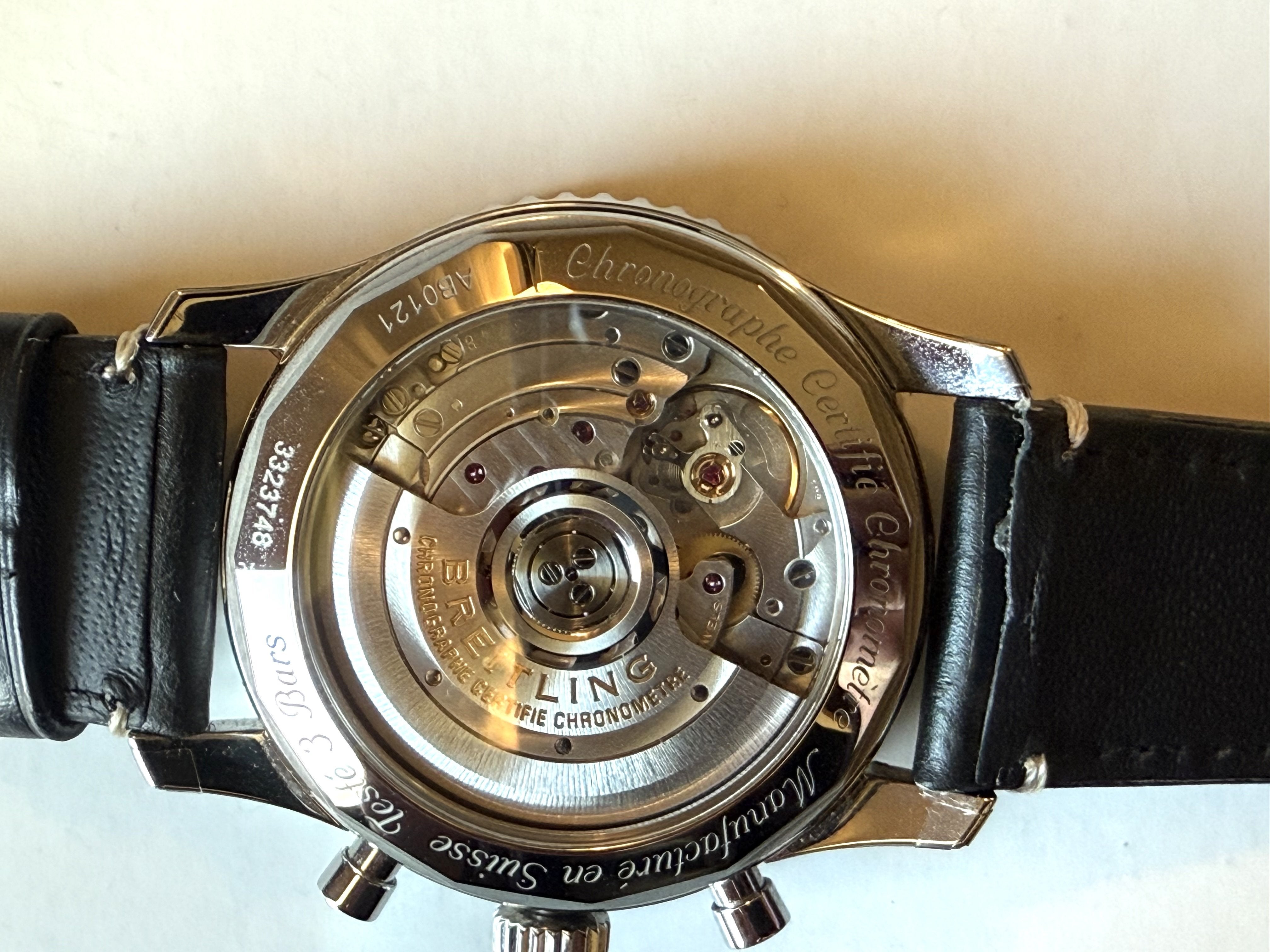 Up for sale is like new Breitling Navitimer 01 43mm…model AB0121. This was given as a retirement gift late 2020 and only worn a couple of times in the house since as I wore my other watches more. It still has the stickers on both sides of the case!. It comes on a Hadley Roma calf strap with a 20mm Breitling buckle in superb shape. The watch functions perfectly and keeps time well within cosc. Again, this watch is in superb shape!. I would rather have someone enjoy it than just sit in my safe.