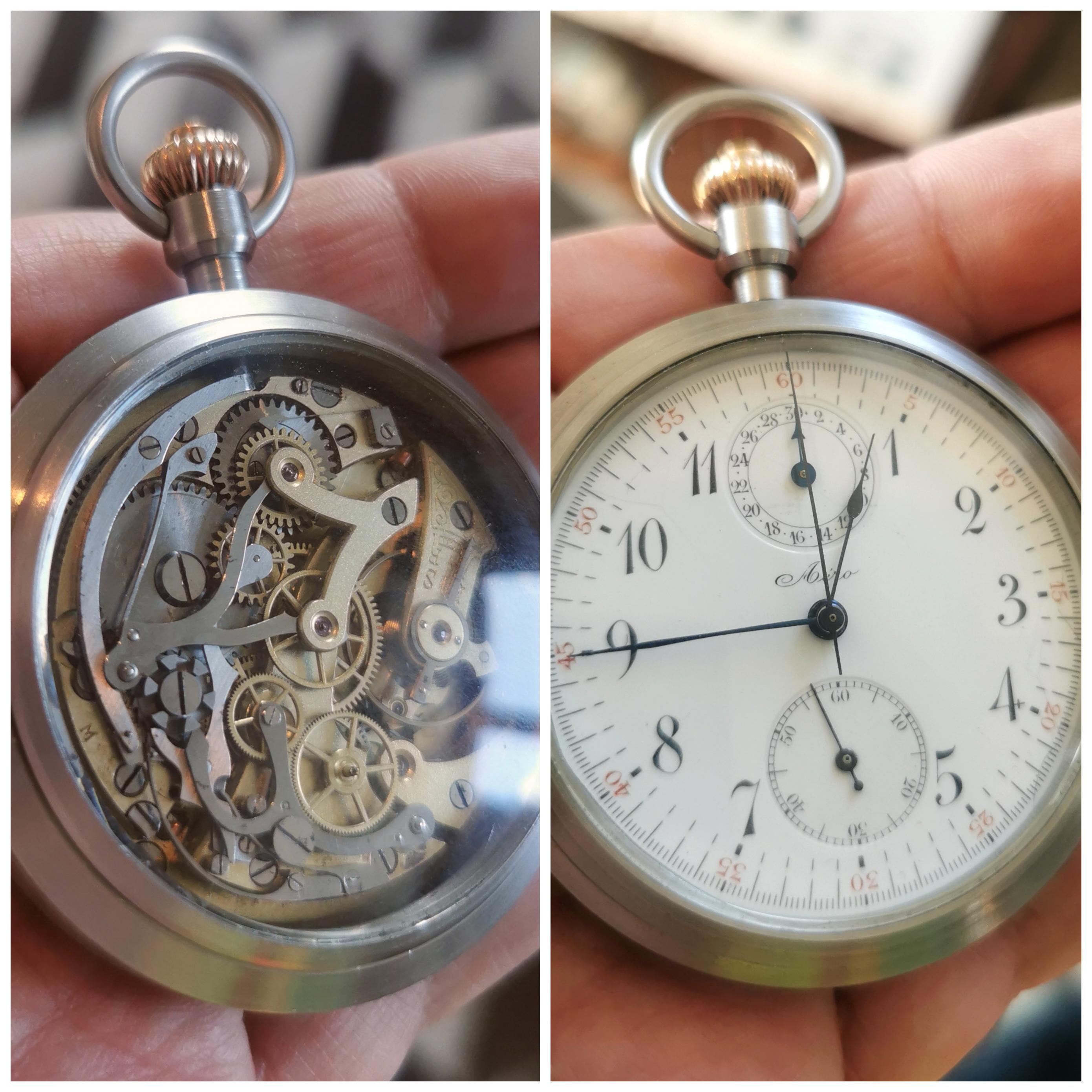 Wow, this is a truly spectacular pocket watch! Honestly one of the coolest timepieces I have ever held in my hands, I just love it. This is a Swiss-made Aero one-pusher chronograph from the late 1910's with a unique custom handmade lathe-turned stainless steel case. Movement by Minerva. The new case was handmade by my friend Lothar. He is an older German guy with incredible watchmaking skills, but zero internet skills. So far, I have had the privilege of being the only person to offer his works for sale online. I have sold many of his pieces right here on r/watchexchange and I will provide several examples of his other works in the comments. The original case for this movement was gold, and someone melted it at some point. Now, the movement, dial and hands have been saved and placed in a new home. Pics: https://imgur.com/a/Mq4jmKQ Video: https://imgur.com/a/RegtRKq Timestamp: https://imgur.com/a/88IYBNn The 54mm stainless steel case is not only beautiful, but also feels amazing to hold in the hand. The steel is solid and has a really nice weight to it, and the brushed finish feels so soft and smooth. This case features an exhibition back that really showcases the incredible movement inside. The case is in mint condition. 12-hour porcelain chronograph dial with arabic numerals. The dial is flawless, no cracks or damage of any kind. This movement was made by Minerva, calibre 19/9. Minerva is still in operation today, but is now owned by Montblanc. Marked "M" on the movement. Push/pull crown for convenient time setting. The pusher for the chronograph is on top of the crown. This is a one-pusher chrono, so the pusher activates the chronograph with the first push, the second push stops it, and the third push resets the chrono hands to their zero-position. The Swiss made movement is in amazing condition, and despite its age, it is functioning perfectly, running very smoothly and keeping great time. I have tracked the timing for about 36 hours, and the time is still bang-on. It's amazing to see a 100+ year old movement in such clean condition. This is a completely unique timepiece, and there will never be another one exactly like it! Asking $399 USD OBO including shipping within North America. Great international shipping rates available too. Price reduced $51 from $450 original price.