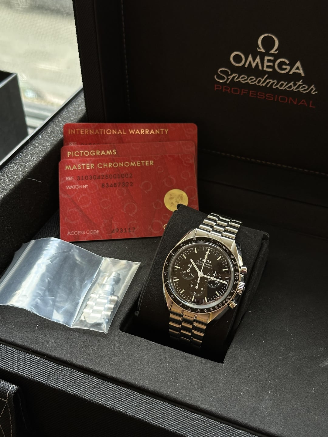Hi everyone, Up for sale today is an Omega Speedmaster Professional Sapphire Sandwich with the newer 3861 movement, reference number 310.30.42.50.01.002. The watch comes in almost mint condition with only minor clasp marks from daily wear and will come with the full set (inner/outer box, booklet, all 3 cards including warranty dated 10/2021, and all links). Please note, this has the 2 pin micro adjust and not the quick micro-adjust with the newest Speedmaster bracelet. Looking for $5400 shipped, though for full insurance that cost will have to be covered on the buyer’s side. If you have any questions or want additional photos/video, please let me know. Thank you!