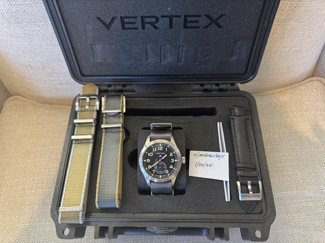 Vertex M100 in almost flawless condition. Price includes USPS Priority shipping in the US. I'm comfortable doing Facetime or videos to show the watch. Please PM me for any questions. I don't have a lot of trades on [r/watchexchange](https://www.reddit.com/r/watchexchange/), but I do have over 30 each on [r/knife\_swap](https://www.reddit.com/r/knife_swap/) and [r/Pmsforsale](https://www.reddit.com/r/Pmsforsale/). Includes 4 straps (3 natos, 1 black leather), the pelican case, and all papers 40mm case 20mm lug width 12.2mm depth L2L 48.5mm Manual movement Locking crown Brushed 316L Steel Case Waterproof to 100M X1 Grade Moulded Super-LumiNova dial Album: [https://imgur.com/a/vertex-m100-pZf5Qq4](https://imgur.com/a/vertex-m100-pZf5Qq4) Timestamp: [https://imgur.com/pgXSsnX](https://imgur.com/pgXSsnX) Payment: PayPal (G&S ok) or Venmo