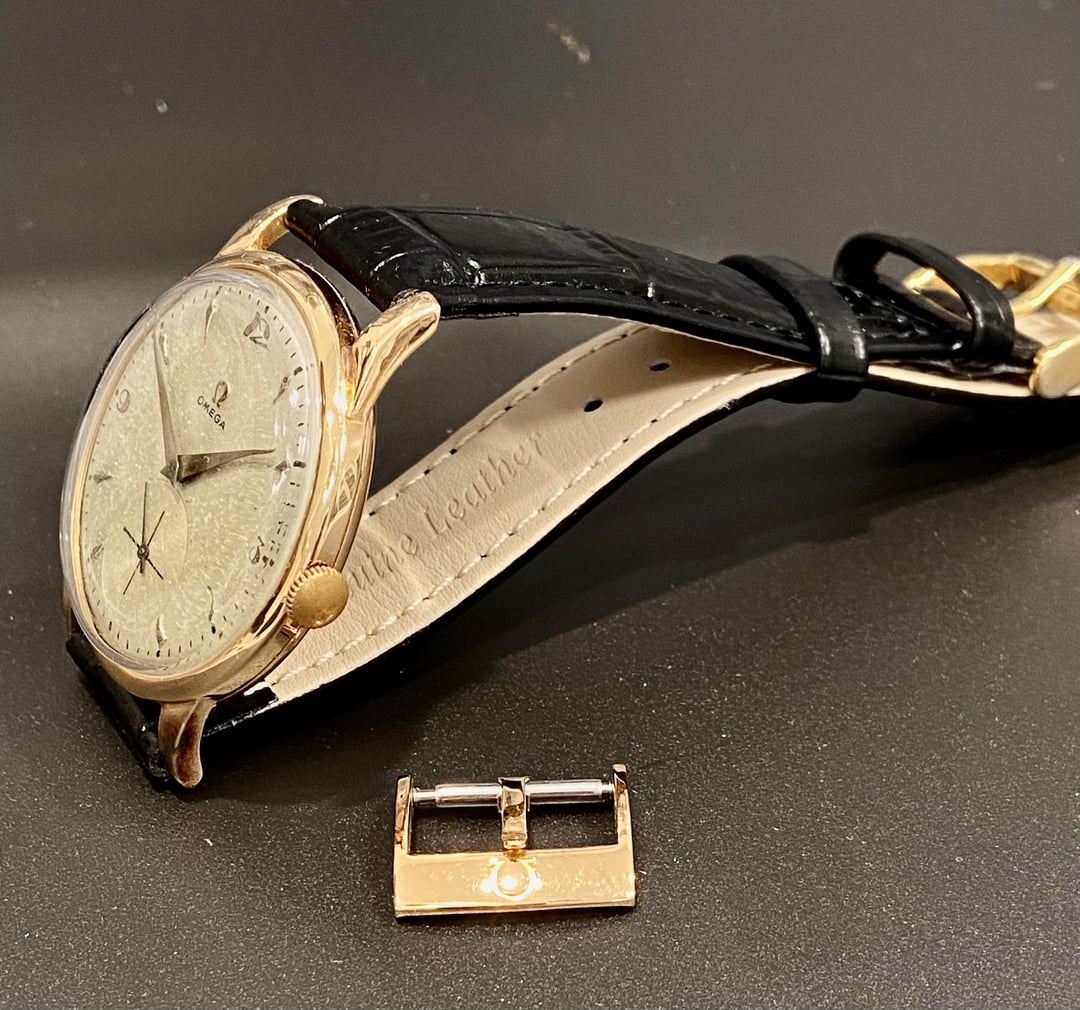 Selling my Omega in a wonderful, “jumbo”sized 18k rose gold case. My wrist is nearly 19.5cm/7.7” so I usually wear larger watches but, with its large dial and nearly 38mm diameter of warm rose gold, it wears beautifully even on my large wrist. It houses an Omega caliber 261, a workhorse manual wind Omega movement from around 1949, making this watch about seventy-five years old. The dial appears to have been refinished along the way and there is a slightly darker hue on a portion of one lower lug suggesting some heat repair was performed in its past, but it is not very noticeable and doesn’t distract from its beauty on the wrist. The rose gold Omega buckle in the pictures is an aftermarket piece I am including since I purchased it for this watch but, unfortunately, the strap I’m currently using does not have enough taper for it to fit. Specifications: width=37.7mm, thickness=8.3mm, lug width=19mm, approx weight (watch head)=1.1 ounces. I have been told that the case usually weighs 30-40% of the total head weight, so my current asking price is only slightly over the current gold spot price. I’m asking $1199 (net to me) plus shipping. I’m located outside Atlanta and will only ship within the United States. I accept payment via PayPal, Zelle, and Venmo. Please do not hesitate to ask any questions, I am happy to jump on a FaceTime video or provide further pics. Thanks for looking! Regards, Jonathan