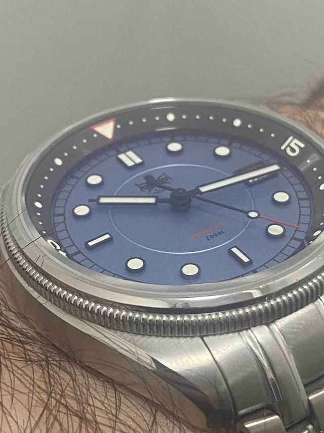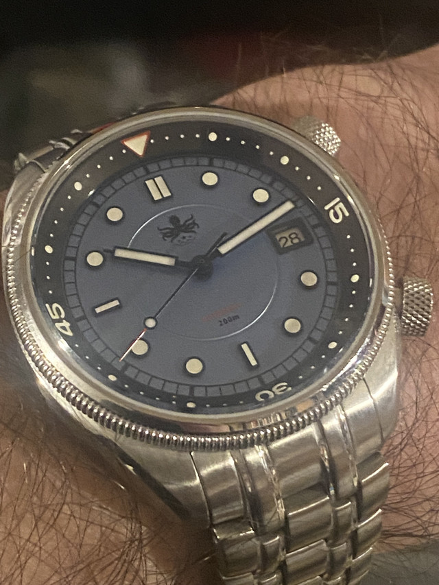 Specs: 41mm, lug to lug 47mm, 20mm lug width. Nh35. Etanche 200m. 2 couronnes vissées, 1 pour bouger la lunette interne, l'autre pour le réglage.