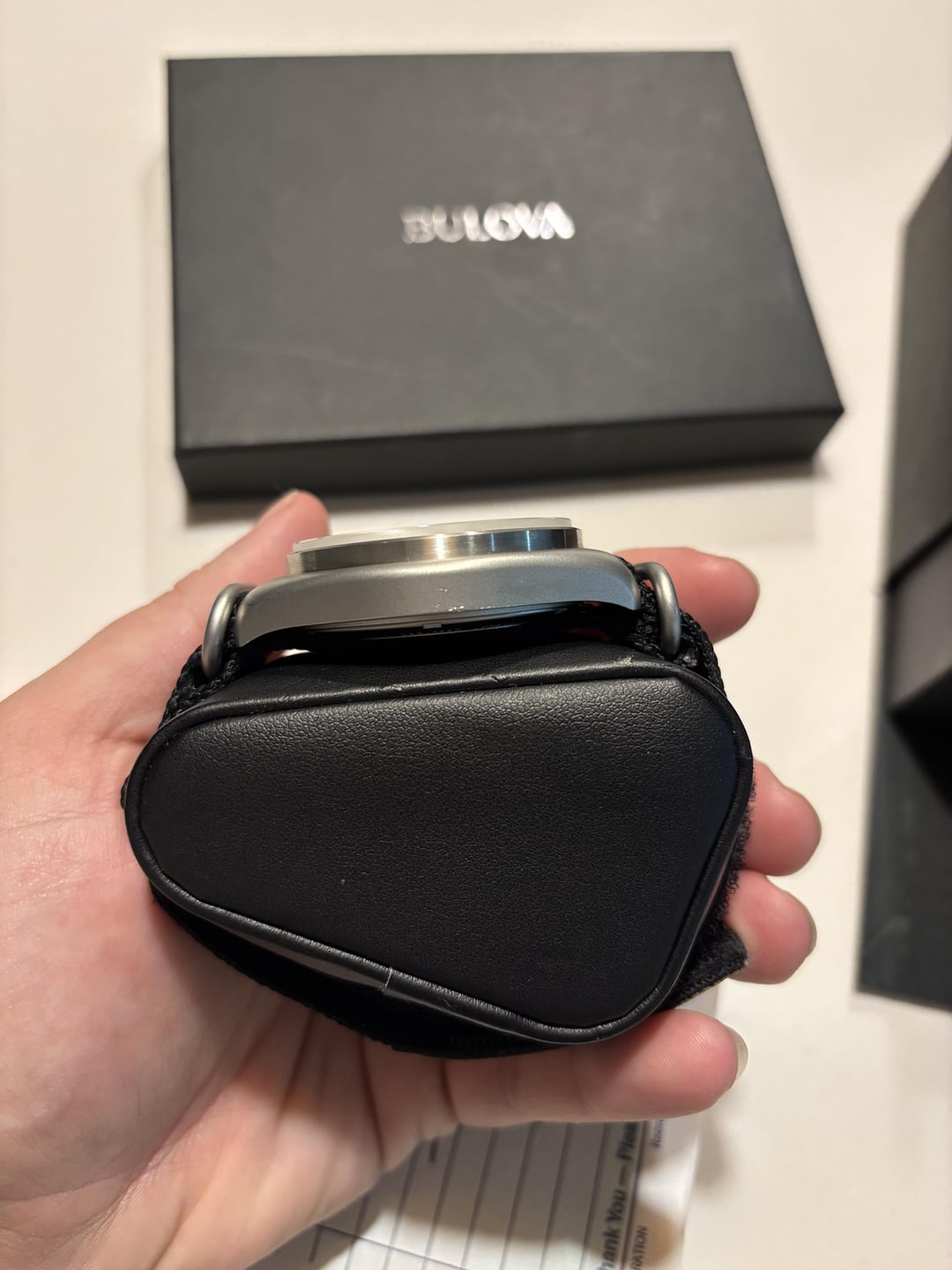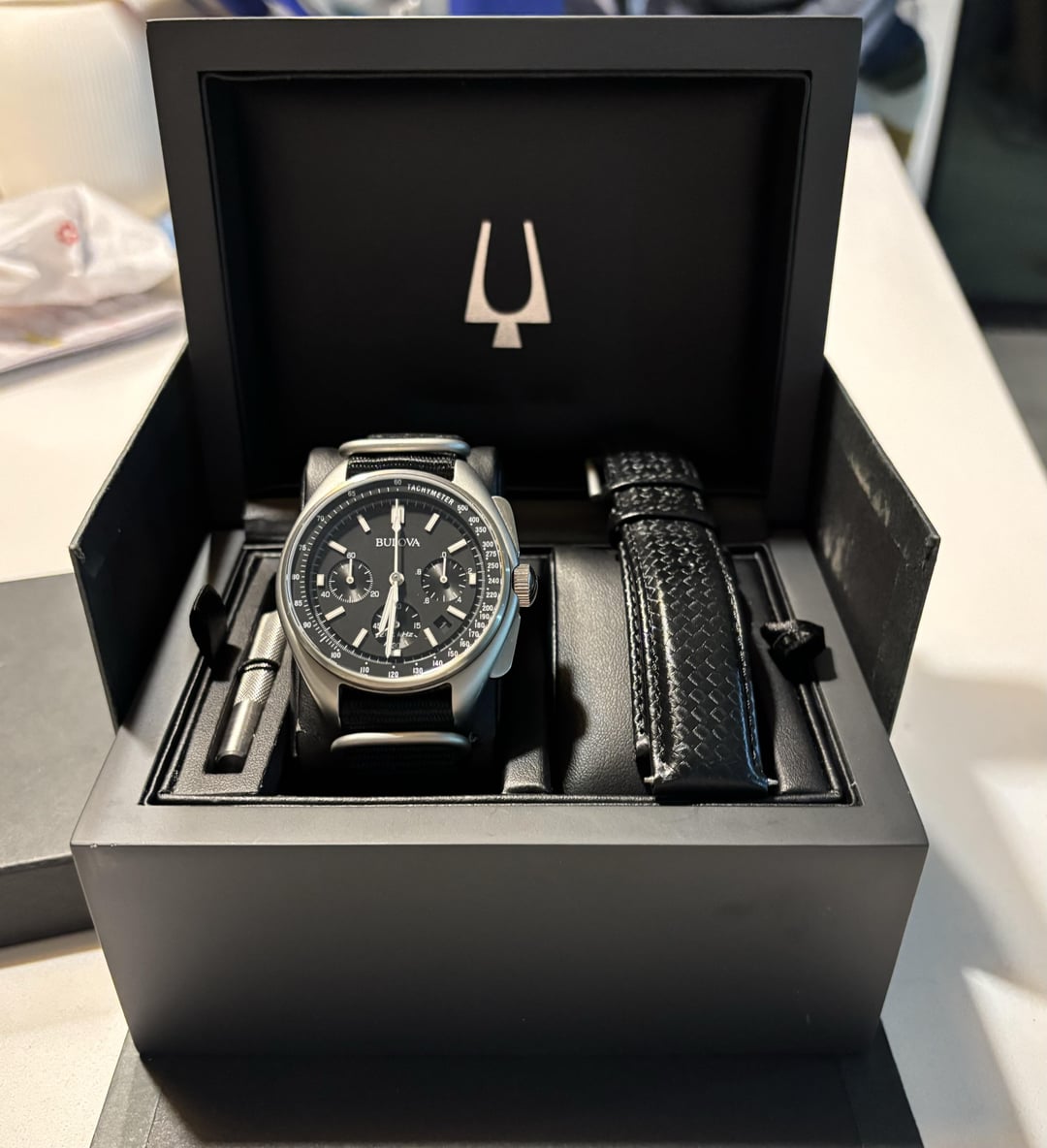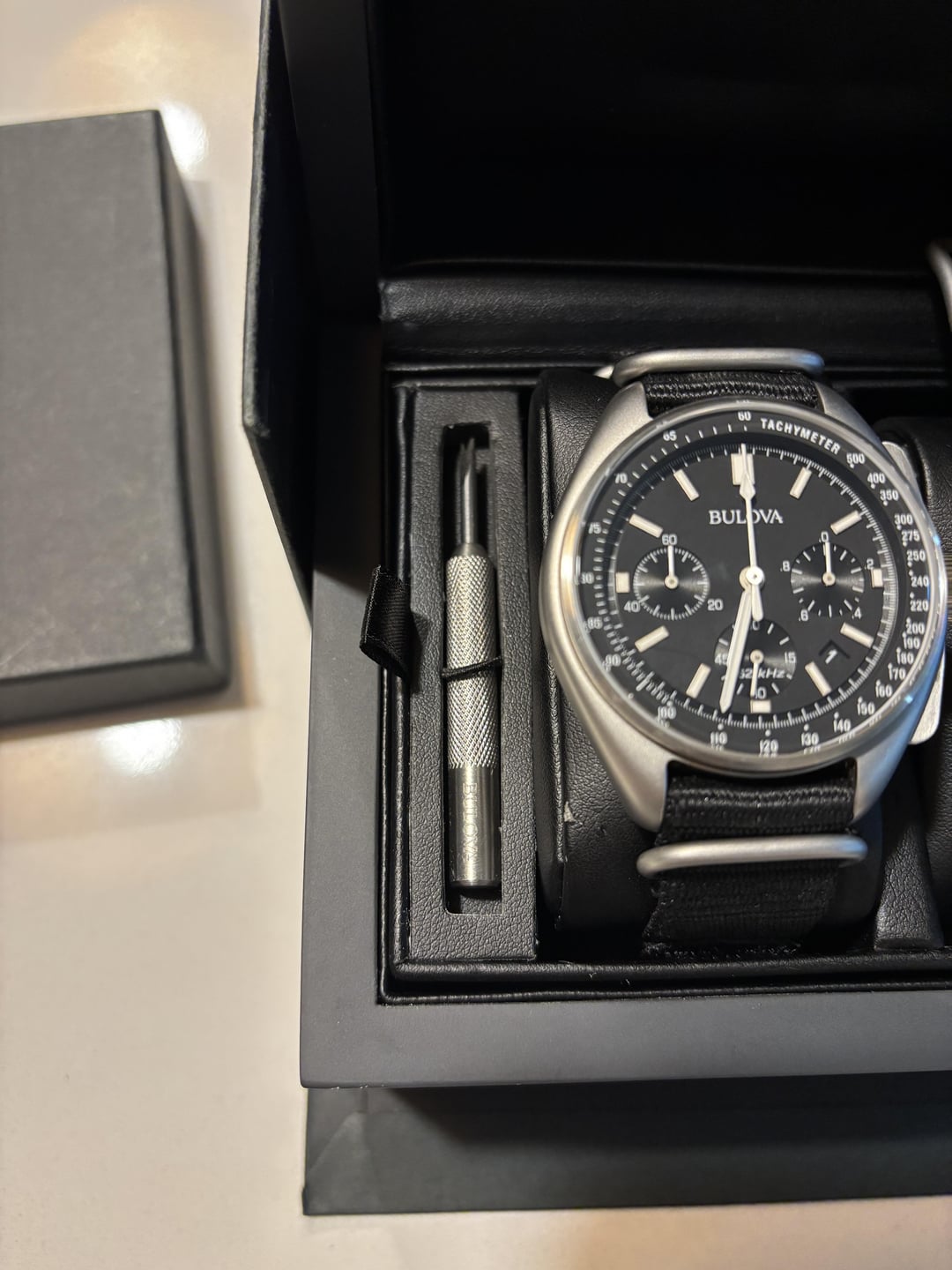 Hello watchex!! Long time no see. Selling our Bulova Lunar Pilot (ref 96B251) today. Bought in 2022 and hasn’t gotten a whole lot of wear, life has happened, and our toddler needs the money, or so he tells us. Watch is in 98.9% condition, I did notice the smallest little knicks/blemishes on the side of the watch opposite from the crown and pushers (see pictures, I tried to capture). Other than that, absolutely flawless. We just changed the battery yesterday; you should be good for a few years with that. Comes with all papers and hang tags, inner and outer box, Bulova branded spring bar tool, and both original Bulova straps. Price: $290 PayPal FF/$295 GS. I haven’t sold in a minute but I do have plenty of references here that you can see in my profile. Shipped USPS priority. Specifications (from Bulova website): • CASE DIAMETER: 45mm • LUG WIDTH: 20mm • CRYSTAL: sapphire crystal • CASE MATERIAL: silver-tone stainless steel • CASEBACK: Solid; bears date of mission & details • STRAP: 2 straps included: leather & NATO • DIAL: Solid black dial with three subdials; white indices & hands • WATER RESISTANCE: 5ATM (50 meters) • MOVEMENT: High performance quartz NP20 with chronograph & six hands; 262 kHz with accuracy of +/- mere seconds a year