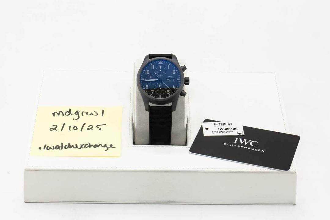 Up for sale is an unworn condition IWC Pilot's Watch Chronograph 41 Top Gun Ceratanium on Rubber & Textile Strap, reference # IW388106. It comes complete with all boxes, papers, booklets, hang tag and IWC Warranty Card dated February 2025. Unworn Condition / Complete Set **Item Details:** IWC Pilot's Watch Chronograph 41 41mm Ceratanium Case IWC 69385 Calibre Movement **Timestamp:** [https://live.staticflickr.com/65535/54319653973\_c52f826930\_b.jpg](https://live.staticflickr.com/65535/54319653973_c52f826930_b.jpg) **Trades:** We are cash buyers and will consider all modern trades. **Payment:** Listed Price is for Bank Wire, Zelle or any no-fee payment method. Paypal is an additional 3.5%. **Price:** $10,450 - Shipped 2 Day Air ! **Shipping:** Fedex Express within the US. International Shipping adds $150. **Returns:** Returns accepted within 48 hours of receipt only if the watch is misrepresented. **Contact:** Please email or text for fastest response. [[email protected]](mailto:[email protected]) or call / text 207-209-4000 Buying a watch on the internet can be scary. We know. You want an established business, accurate presentation of product, followed up by quick responses, and expedited shipping. We understand. That is why we deliver this along with honest, straightforward transactions backed by our well-built reputation. We are new to Reddit but have been selling on forums for many years, and have literally thousands of references. All photography is original. 6.625% state sales tax applies to New Jersey shipping addresses only.