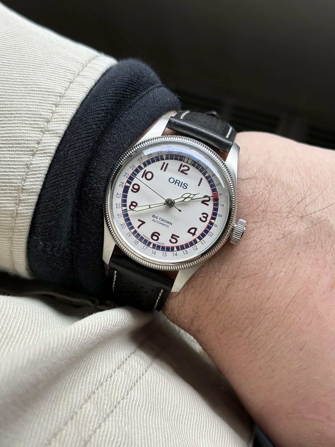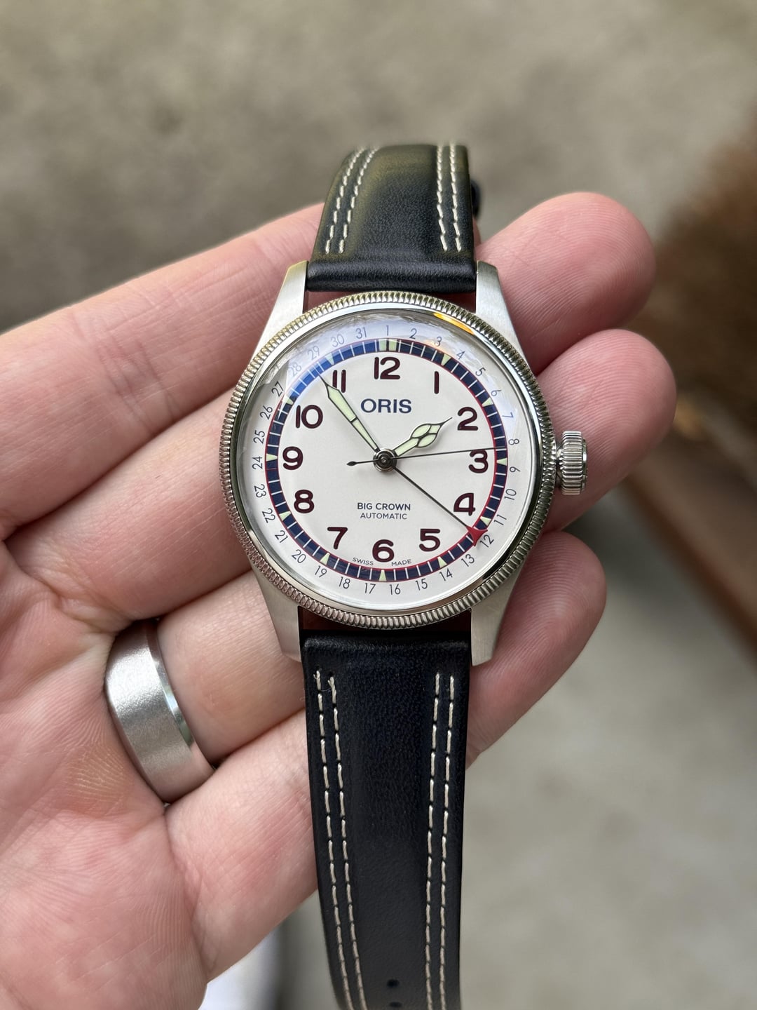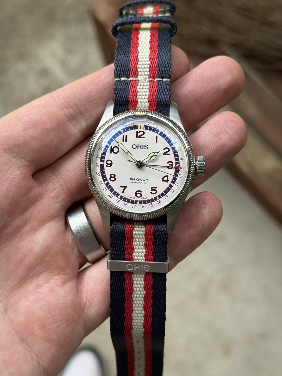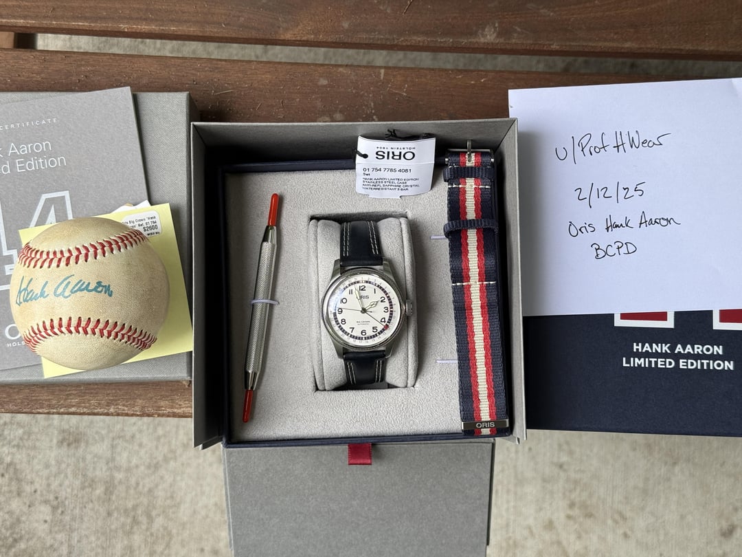 For sale: Oris Big Crown Pointer Date Hank Aaron Limited Edition. 2024 release, this one is AD purchased in 2025 and is only a few weeks old. I've had my eye on this one for a while and snagged it at the end of January, and am only selling because of a family emergency and we need the funds. Had my eye on this one when it was orignally announced, and I'll likely come back for it later on when the time is right. Watch collecting be like that some times. Grab it just in time for Spring Training. Timestamp: [https://i.imgur.com/YpB9gkJ](https://i.imgur.com/YpB9gkJ) Photos: [https://imgur.com/a/WmGf1qF](https://imgur.com/a/WmGf1qF) Included: Full kit with box and papers, OEM nato strap, and replica Hank Aaron signed baseball. Card is dated January 19, 2025, so full warranty left. Everything in terrific condition. I did my best to document the condition of the watch in the photos. Nothing has been edited. Price: $1500 or best offer. Chatted with a few ADs on this one and was only able to get a small discount. Here's your chance to get one that's as new for way under retail. No trades please. Price includes shipping with insurance within the CONUS. Payment methods accepted include Venmo/PayPal F&F./Zelle. Please don't hesitate to reach out to me for any questions you may have. Plenty of confirmed transactions.