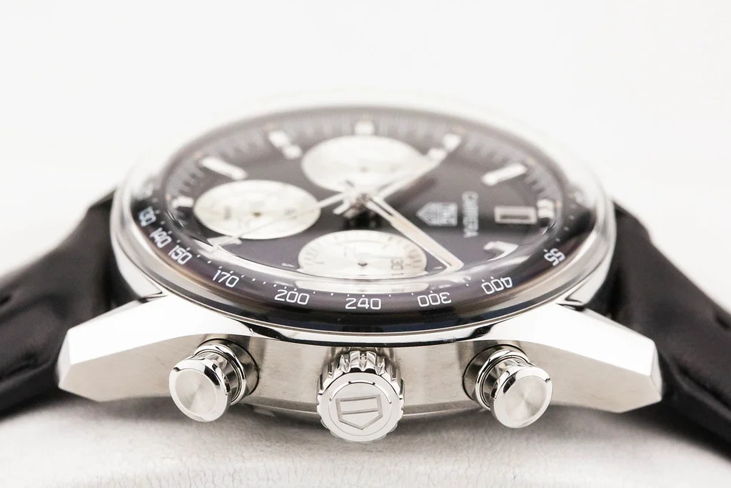 Up for sale is an excellent condition Tag Heuer Carrera Automatic Chronograph 39mm Black Panda Dial on Leather Strap, reference # CBS2210.FC6534. It comes complete with all boxes, papers, booklets and Tag Heuer Warranty Card dated May 2023.