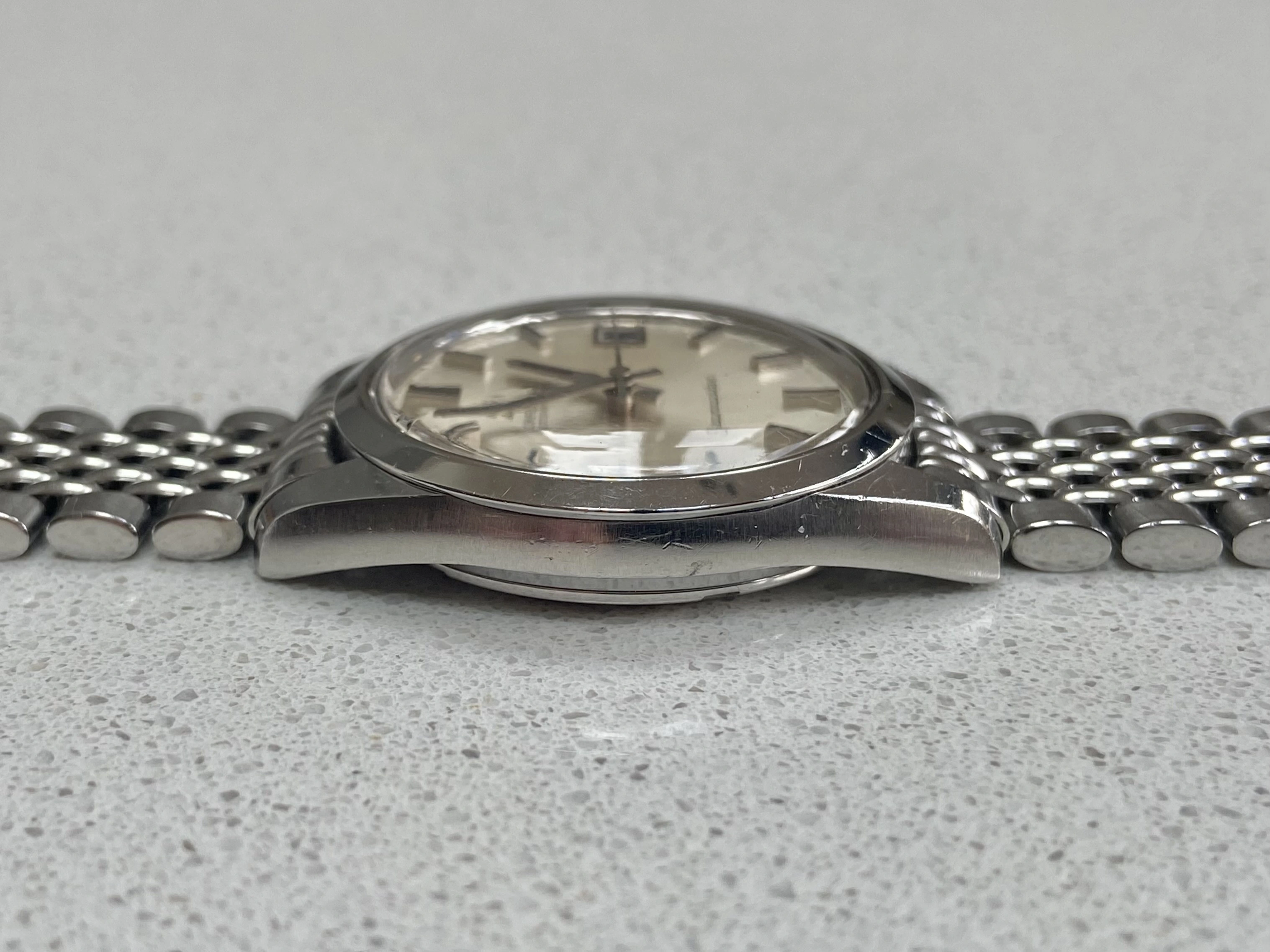 The silver sunburst dial is factory original, not restored or refinished and is very, very good. A couple of dust particle’s present, but no scratches, stains, marks or loss of print visible with a loupe. Matching hands. Overall a really beautiful, original dial in great condition.