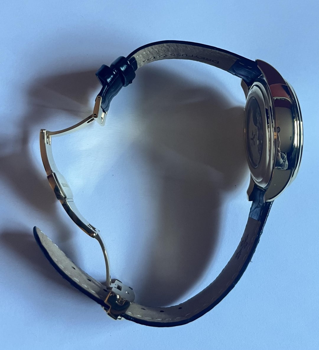 This is a great dress watch that really holds a look. The dial design, to the numeral markers, to the hands - it maintains a bold but simultaneously subtle look. It also wears so well. It has a comfortable strap and the dropped lugs make it sit perfectly on wrist. Asking $400 shipped - negotiable - Model: DGS00092-01 - 41 x 46 x 11 - Yellow-gold PVD-coated stainless steel - Sapphire - Leather strap - 20mm - 7 bar